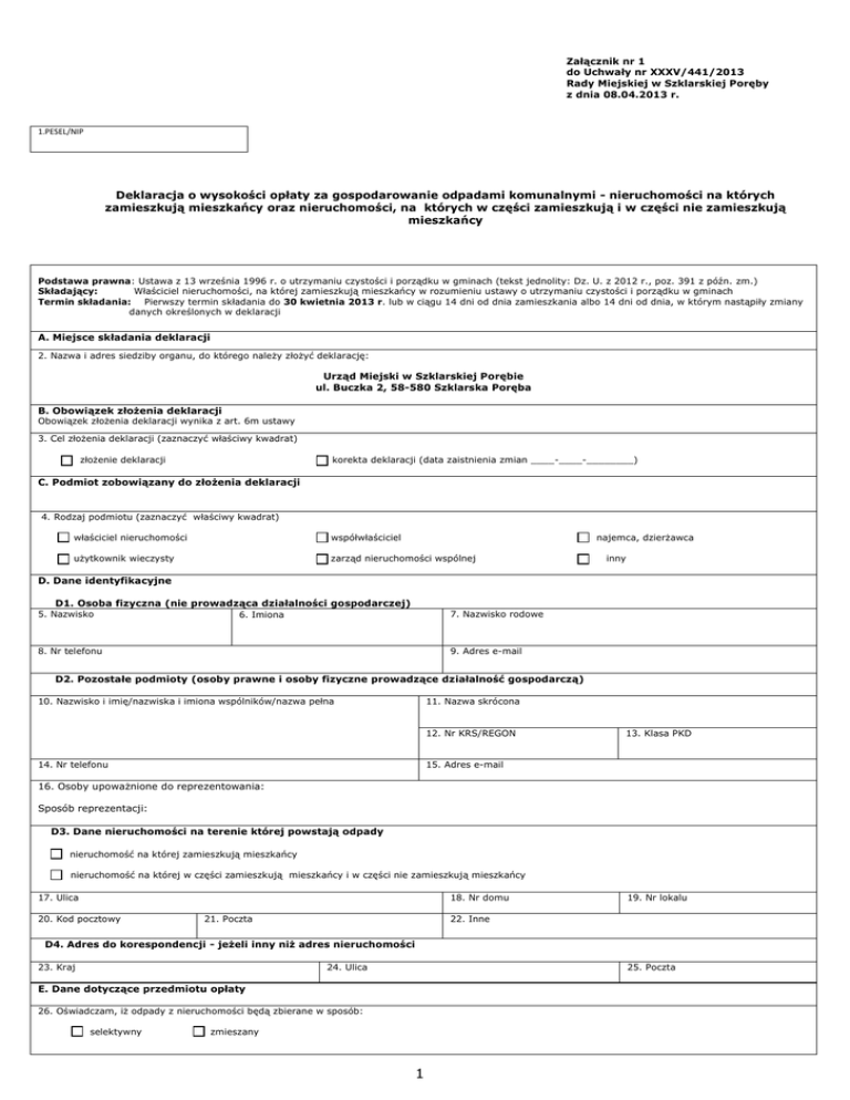 Załącznik nr 1 do Uchwały nr XXXV/441/2013 Rady Miejskiej w Szklarskiej Poręby z dnia 08.04.2013 r. 1.PESEL/NIP Deklaracja o wysokości opłaty za gospodarowanie odpadami komunalnymi - nieruchomości na których zamieszkują mieszkańcy oraz nieruchomości, na których w części zamieszkują i w części nie zamieszkują mieszkańcy Podstawa prawna: Ustawa z 13 września 1996 r. o utrzymaniu czystości i porządku w gminach (tekst jednolity: Dz. U. z 2012 r., poz. 391 z późn. zm.) Składający: Właściciel nieruchomości, na której zamieszkują mieszkańcy w rozumieniu ustawy o utrzymaniu czystości i porządku w gminach Termin składania: Pierwszy termin składania do 30 kwietnia 2013 r. lub w ciągu 14 dni od dnia zamieszkania albo 14 dni od dnia, w którym nastąpiły zmiany danych określonych w deklaracji A. Miejsce składania deklaracji 2. Nazwa i adres siedziby organu, do którego należy złożyć deklarację: Urząd Miejski w Szklarskiej Porębie ul. Buczka 2, 58-580 Szklarska Poręba B. Obowiązek złożenia deklaracji Obowiązek złożenia deklaracji wynika z art. 6m ustawy 3. Cel złożenia deklaracji (zaznaczyć właściwy kwadrat) złożenie deklaracji korekta deklaracji (data zaistnienia zmian ____-____-________) C. Podmiot zobowiązany do złożenia deklaracji 4. Rodzaj podmiotu (zaznaczyć właściwy kwadrat) właściciel nieruchomości współwłaściciel najemca, dzierżawca użytkownik wieczysty zarząd nieruchomości wspólnej inny D. Dane identyfikacyjne D1. Osoba fizyczna (nie prowadząca działalności gospodarczej) 5. Nazwisko 7. Nazwisko rodowe 6. Imiona 8. Nr telefonu 9. Adres e-mail D2. Pozostałe podmioty (osoby prawne i osoby fizyczne prowadzące działalność gospodarczą) 10. Nazwisko i imię/nazwiska i imiona wspólników/nazwa pełna 11. Nazwa skrócona 12. Nr KRS/REGON 14. Nr telefonu 13. Klasa PKD 15. Adres e-mail 16. Osoby upoważnione do reprezentowania: Sposób reprezentacji: D3. Dane nieruchomości na terenie której powstają odpady nieruchomość na której zamieszkują mieszkańcy nieruchomość na której w części zamieszkują mieszkańcy i w części nie zamieszkują mieszkańcy 17. Ulica 18. Nr domu 20. Kod pocztowy 21. Poczta 19. Nr lokalu 22. Inne D4. Adres do korespondencji - jeżeli inny niż adres nieruchomości 23. Kraj 24. Ulica 25. Poczta E. Dane dotyczące przedmiotu opłaty 26. Oświadczam, iż odpady z nieruchomości będą zbierane w sposób: selektywny zmieszany 1 F. Opłata za gospodarowanie odpadami komunalnymi na nieruchomościach wyposażonych w wodomierze 28. Średniomiesięczne zużycie wody [m3] 27. Stawka [zł] 30. Miesięczna kwota opłaty: 29. Wartość [zł] zł G. Opłata za gospodarowanie odpadami komunalnymi na nieruchomościach niewyposażonych w wodomierze 31. Stawka [zł] 32. Powierzchnia lokalu [m2] 33.Wartość [zł] 34. Miesięczna kwota opłaty: zł H. Oświadczenie i podpis osoby składającej deklarację Oświadczam, że znane mi są przepisy Kodeksu karnego skarbowego o odpowiedzialności za podanie danych niezgodnych z rzeczywistością. 35. Nazwisko i imię 36. Data i podpis I. Lokalizacja pojemników na odpady 37. Oświadczam, że pojemniki na odpady komunalne zlokalizowane są/będą: J. Dodatkowe 38. Na nieruchomości znajduje się kompostownik: tak nie 39. Na nieruchomości znajduje się: przydomowa oczyszczalnia ścieków – pojemność ………….. bezodpływowy zbiornik na nieczystości ciekłe – pojemność …………… nieruchomość podłączona jest do miejskiej sieci kanalizacyjnej 40. liczba osób zamieszkałych na nieruchomości : ………………………. powierzchnia nieruchomości: ……………. m2 41. Liczba lokali w nieruchomości (wypełnia tylko zarząd nieruchomości wspólnej): …………… Pouczenie W przypadku nie wpłacenie w określonych ustawowo terminach kwoty opłaty lub wpłacenia jej w niepełnej wysokości, niniejsza deklaracja stanowi podstawę do wystawienia tytułu wykonawczego, zgodnie z przepisami ustawy z 17 czerwca 1966 r. o postępowaniu egzekucyjnym w administracji (dz.U. z 2005 r. Nr 299, poz. 1954 z późn .zm.). K. Adnotacje Organu 2