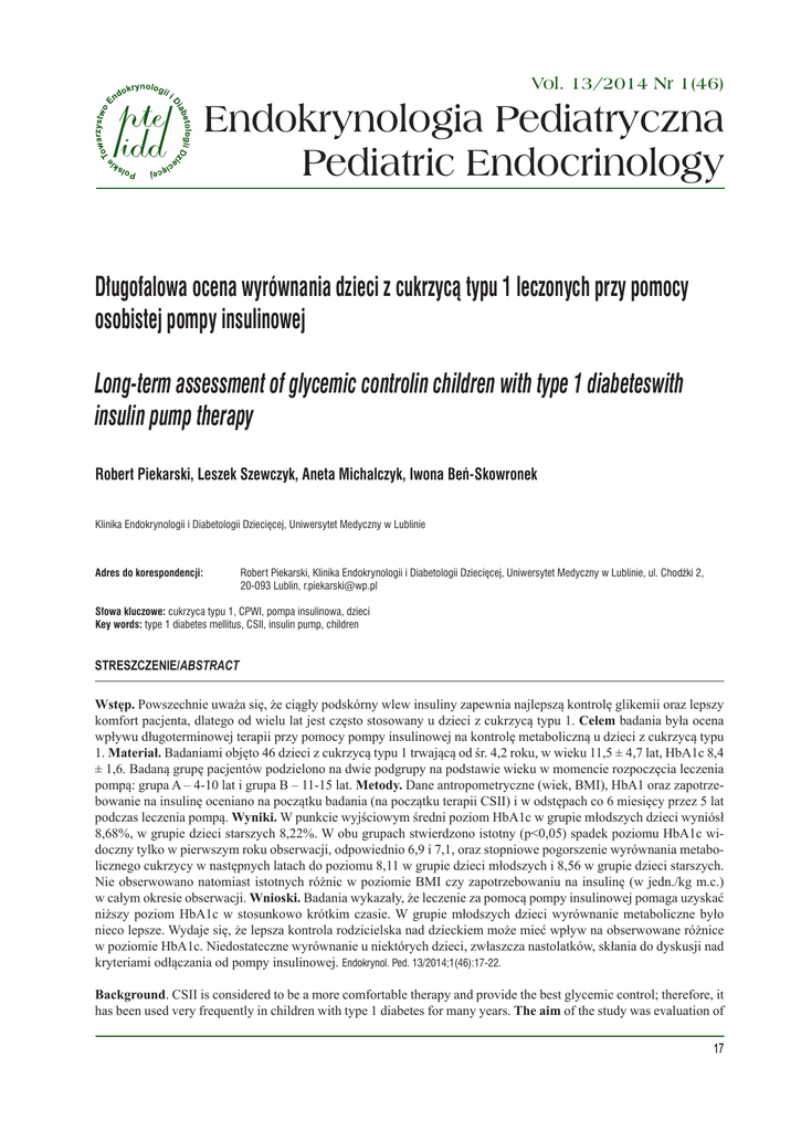 Piekarski R. i inni: Długofalowa ocena wyrównania dzieci 1, leczonych przyz nadczynnością pomocy osobistej pompy insulinowej Szewczyk L. i inni z– cukrzycą Aktywnośćtypu opioidowa u dziewcząt i niedoczynnością tarczycy Vol. 13/2014 Nr 1(46) Endokrynologia Pediatryczna Pediatric Endocrinology Długofalowa ocena wyrównania dzieci z cukrzycą typu 1 leczonych przy pomocy osobistej pompy insulinowej Long-term assessment of glycemic controlin children with type 1 diabeteswith insulin pump therapy Robert Piekarski, Leszek Szewczyk, Aneta Michalczyk, Iwona Beń-Skowronek Klinika Endokrynologii i Diabetologii Dziecięcej, Uniwersytet Medyczny w Lublinie Adres do korespondencji: Robert Piekarski, Klinika Endokrynologii i Diabetologii Dziecięcej, Uniwersytet Medyczny w Lublinie, ul. Chodźki 2, 20-093 Lublin, [email protected] Słowa kluczowe: cukrzyca typu 1, CPWI, pompa insulinowa, dzieci Key words: type 1 diabetes mellitus, CSII, insulin pump, children STRESZCZENIE/ABSTRACT Wstęp. Powszechnie uważa się, że ciągły podskórny wlew insuliny zapewnia najlepszą kontrolę glikemii oraz lepszy komfort pacjenta, dlatego od wielu lat jest często stosowany u dzieci z cukrzycą typu 1. Celem badania była ocena wpływu długoterminowej terapii przy pomocy pompy insulinowej na kontrolę metaboliczną u dzieci z cukrzycą typu 1. Materiał. Badaniami objęto 46 dzieci z cukrzycą typu 1 trwającą od śr. 4,2 roku, w wieku 11,5 ± 4,7 lat, HbA1c 8,4 ± 1,6. Badaną grupę pacjentów podzielono na dwie podgrupy na podstawie wieku w momencie rozpoczęcia leczenia pompą: grupa A – 4-10 lat i grupa B – 11-15 lat. Metody. Dane antropometryczne (wiek, BMI), HbA1 oraz zapotrzebowanie na insulinę oceniano na początku badania (na początku terapii CSII) i w odstępach co 6 miesięcy przez 5 lat podczas leczenia pompą. Wyniki. W punkcie wyjściowym średni poziom HbA1c w grupie młodszych dzieci wyniósł 8,68%, w grupie dzieci starszych 8,22%. W obu grupach stwierdzono istotny (p<0,05) spadek poziomu HbA1c widoczny tylko w pierwszym roku obserwacji, odpowiednio 6,9 i 7,1, oraz stopniowe pogorszenie wyrównania metabolicznego cukrzycy w następnych latach do poziomu 8,11 w grupie dzieci młodszych i 8,56 w grupie dzieci starszych. Nie obserwowano natomiast istotnych różnic w poziomie BMI czy zapotrzebowaniu na insulinę (w jedn./kg m.c.) w całym okresie obserwacji. Wnioski. Badania wykazały, że leczenie za pomocą pompy insulinowej pomaga uzyskać niższy poziom HbA1c w stosunkowo krótkim czasie. W grupie młodszych dzieci wyrównanie metaboliczne było nieco lepsze. Wydaje się, że lepsza kontrola rodzicielska nad dzieckiem może mieć wpływ na obserwowane różnice w poziomie HbA1c. Niedostateczne wyrównanie u niektórych dzieci, zwłaszcza nastolatków, skłania do dyskusji nad kryteriami odłączania od pompy insulinowej. Endokrynol. Ped. 13/2014;1(46):17-22. Background. CSII is considered to be a more comfortable therapy and provide the best glycemic control; therefore, it has been used very frequently in children with type 1 diabetes for many years. The aim of the study was evaluation of 17 Praca oryginalna Endokrynol. Ped., 13/2014;1(46):17-22 the long-term effect of insulin pump therapy on metabolic control in children with type 1 DM. Materials and methods. 46 children with type 1 DM from 4.2 years, mean age 11.5±4.7 years, mean HbA1c 8.4 ± 1.6 entered the study. The total patient population was divided into 2 groups based on age at the start of pump therapy: group A – 4-10 years old and group B – 11-15 years old. Anthropometric data (age, BMI), HbA1c, and insulin requirement have been evaluated at baseline (at the start of CSII therapy) and every 6 months intervals for 5 years during pump therapy. Results. At baseline, the mean HbA1c level was 8.68 in the group of younger children and 8.22 in the group of older children. In both groups of patients, significant (p<0.05) improvement of the A1c level was shown only during the first year of observation, 6.9 and 7.1 respectively with gradual deterioration in subsequent years, up to the level of A1c 8.11 and 8.56, respectively. Conclusion. Our study has shown that insulin pump therapy helped achieve lower HbA1c in a relatively short period of time. Interestingly, in the group of the younger children, the metabolic control was slightly better. It seems that better parental control of the child may influence the observed differences in the HbA1c level. Pediatr. Endocrinol. 13/2014;1(46):17-22. Wstęp Od kilku lat wyłaniały się potrzeby poprawy jakości życia dzieci chorych na cukrzycę typu 1 wobec pojawienia się nowych metod podawania insuliny przy pomocy osobistej pompy insulinowej, umożliwiającej podłączenia wkłuć dostarczających insulinę w sposób ciągły i w bolusach okołoposiłkowych zamiast wielokrotnych wstrzyknięć w ciągu doby [1]. W 2002 r. ówczesny przewodniczący Sekcji Pediatrycznej Polskiego Towarzystwa Diabetologicznego prof. Leszek Szewczyk oraz zastępca prof. Piotr Fichna przygotowali projekt dla Fundacji Wielkiej Orkiestry Świątecznej Pomocy, dotyczący potrzeby przeznaczania części zbieranych przez Fundację funduszy na zakup osobistych pomp insulinowych dla dzieci chorych na cukrzycę typu 1. Fundacja przychyliła się do argumentacji zawartej w projekcie i Orkiestra „zagrała” na zakup kilkuset pomp insulinowych dla najmłodszych dzieci. Efekty corocznego sponsoringu Fundacji były odczuwane przez kilka kolejnych lat. Najwięcej osobistych pomp insulinowych pozyskał diabetologiczny ośrodek warszawski przy ul. Działdowskiej, stąd mógł się poszczycić obserwacjami największej liczby dzieci leczonych z powodu cukrzycy typu 1 przy pomocy indywidualnych pomp insulinowych [2–4] Pozostałe ośrodki diabetologiczne otrzymywały mniejszą ilość darów. Od 2009 r. Narodowy Fundusz Zdrowia zagwarantował poszczególnym województwom pokrycie kosztów osobistych pomp insuli