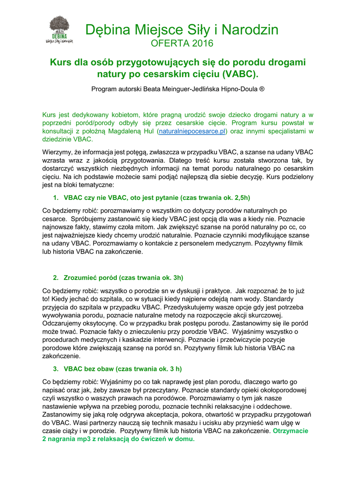 Dębina Miejsce Siły i Narodzin OFERTA 2016 Kurs dla osób przygotowujących się do porodu drogami natury po cesarskim cięciu (VABC). Program autorski Beata Meinguer-Jedlińska Hipno-Doula ® Kurs jest dedykowany kobietom, które pragną urodzić swoje dziecko drogami natury a w poprzedni poród/porody odbyły się przez cesarskie cięcie. Program kursu powstał w konsultacji z położną Magdaleną Hul (naturalniepocesarce.pl) oraz innymi specjalistami w dziedzinie VBAC. Wierzymy, że informacja jest potęgą, zwłaszcza w przypadku VBAC, a szanse na udany VBAC wzrasta wraz z jakością przygotowania. Dlatego treść kursu została stworzona tak, by dostarczyć wszystkich niezbędnych informacji na temat porodu naturalnego po cesarskim cięciu. Na ich podstawie możecie sami podjąć najlepszą dla siebie decyzję. Kurs podzielony jest na bloki tematyczne: 1. VBAC czy nie VBAC, oto jest pytanie (czas trwania ok. 2,5h) Co będziemy robić: porozmawiamy o wszystkim co dotyczy porodów naturalnych po cesarce. Spróbujemy zastanowić się kiedy VBAC jest opcją dla was a kiedy nie. Poznacie najnowsze fakty, stawimy czoła mitom. Jak zwiększyć szanse na poród naturalny po cc, co jest najważniejsze kiedy chcemy urodzić naturalnie. Poznacie czynniki modyfikujące szanse na udany VBAC. Porozmawiamy o kontakcie z personelem medycznym. Pozytywny filmik lub historia VBAC na zakończenie. 2. Zrozumieć poród (czas trwania ok. 3h) Co będziemy robić: wszystko o porodzie sn w dyskusji i praktyce. Jak rozpoznać że to już to! Kiedy jechać do szpitala, co w sytuacji kiedy najpierw odejdą nam wody. Standardy przyjęcia do szpitala w przypadku VBAC. Przedyskutujemy wasze opcje gdy jest potrzeba wywoływania porodu, poznacie naturalne metody na rozpoczęcie akcji skurczowej. Odczarujemy oksytocynę. Co w przypadku brak postępu porodu. Zastanowimy się ile poród może trwać. Poznacie fakty o znieczuleniu przy porodzie VBAC. Wyjaśnimy wszystko o procedurach medycznych i kaskadzie interwencji. Poznacie i przećwiczycie pozycje porodowe które zwiększają szansę na poród sn. Pozytywny filmik lub historia VBAC na zakończenie. 3. VBAC bez obaw (czas trwania ok. 3 h) Co będziemy robić: Wyjaśnimy po co tak naprawdę jest plan porodu, dlaczego warto go napisać oraz jak, żeby zawsze był przeczytany. Poznacie standardy opieki okołoporodowej czyli wszystko o waszych prawach na porodówce. Porozmawiamy o tym jak nasze nastawienie wpływa na przebieg porodu, poznacie techniki relaksacyjne i oddechowe. Zastanowimy się jaką rolę odgrywa akceptacja, pokora, otwartość w przypadku przygotowań do VBAC. Wasi partnerzy nauczą się technik masażu i ucisku aby przynieść wam ulgę w czasie ciąży i w porodzie. Pozytywny filmik lub historia VBAC na zakończenie. Otrzymacie 2 nagrania mp3 z relaksacją do ćwiczeń w domu. Dębina Miejsce Siły i Narodzin OFERTA 2016 SPOTKANIE SPECJALNE – KRĄG OPOWIEŚCI PORODOWYCH – TYLKO DLA KOBIET! Na zakończenie zapraszamy was na wyjątkowe spotkanie na które zaprosimy gościa specjalnego. Co to jest Krąg Opowieści Porodowych? To czas kiedy my kobiety, zasiądziemy we wspólnym kręgu aby posłuchać opowieści porodowych oraz podzielić się tym co leży nam na sercu. W kręgu wszystkie jesteśmy sobie równe, niezależnie od tego czy jesteśmy już matkami czy nie, czy jesteśmy stare czy jeszcze jesteśmy dziećmi. Krąg to czas na bycie sobą, w kręgu nie oceniamy. To czas tylko dla nas. Kręgi kobiet są bardzo starą i potrzebną tradycją. Zapraszamy was do zamknięcia waszego kursu właśnie w ten niezwykły sposób. SZCZEGÓŁY ORGANIZACYJNE Czas trwania: szczegóły Grafik Inwestycja: 250 zł(osoba towarzysząca nieodpłatnie) W cenie zajęcia, materiały dydaktyczne, 2 nagrania mp3 z relaksacją, napoje i zdrowy poczęstunek. Rezerwacja miejsca: 150 zł W ciągu 3 dni roboczych od zgłoszenia proszę wnieść opłatę rezerwacyjną w wysokości 150 zł. Pozostałą część opłaty proszę wpłacić najpóźniej w pierwszym tygodniu zajęć, kontynuując wybraną wcześniej metodę płatności. Płatność gotówką lub przelewem bankowym Dane do przelewu: szczegóły wkrótce.