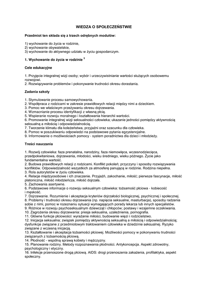 WIEDZA O SPOŁECZEŃSTWIE Przedmiot ten składa się z trzech odrębnych modułów: 1) wychowanie do ycia w rodzinie, 2) wychowanie obywatelskie, 3) wychowanie do aktywnego udziału w yciu gospodarczym. 1. Wychowanie do życia w rodzinie 3 Cele edukacyjne 1. Przyjęcie integralnej wizji osobyś wybór i urzeczywistnianie warto ci słu ących osobowemu rozwojowi. 2. Rozwiązywanie problemów i pokonywanie trudno ci okresu dorastania. Zadania szkoły 1. Stymulowanie procesu samowychowania. 2. Współpraca z rodzicami w zakresie prawidłowych relacji między nimi a dzieckiem. 3. Pomoc we wła ciwym prze ywaniu okresu dojrzewania. 4. Wzmacnianie procesu identyfikacji z własną płcią. 5. Wspieranie rozwoju moralnego i kształtowania hierarchii warto ci. 6. Promowanie integralnej wizji seksualno ci człowiekaś ukazanie jedno ci pomiędzy aktywno cią seksualną a miło cią i odpowiedzialno cią. 7. Tworzenie klimatu dla kole eństwa, przyja ni oraz szacunku dla człowieka. 8. Pomoc w poszukiwaniu odpowiedzi na podstawowe pytania egzystencjalne. 9. Informowanie o mo liwo ciach pomocy - system poradnictwa dla dzieci i młodzie y. Treści nauczania 1. Rozwój człowiekaŚ faza prenatalna, narodziny, faza niemowlęca, wczesnodziecięca, przedpokwitaniowa, dojrzewania, młodo ci, wieku redniego, wieku pó nego. ycie jako fundamentalna warto ć. 2. Budowa prawidłowych relacji z rodzicami. Konflikt pokoleńś przyczyny i sposoby rozwiązywania konfliktów. Odpowiedzialno ć wszystkich za atmosferę panującą w rodzinie. Rodzina niepełna. 3. Rola autorytetów w yciu człowieka. 4. Relacje międzyosobowe i ich znaczenie. Przyja ń, zakochanie, miło ćś pierwsze fascynacje, miło ć platoniczna, miło ć młodzieńcza, miło ć dojrzała. 5. Zachowania asertywne. 6. Podstawowe informacje o rozwoju seksualnym człowiekaŚ to samo ć płciowa - kobieco ć i męsko ć. 7. Dojrzewanie. Rozumienie i akceptacja kryteriów dojrzało ci biologicznej, psychicznej i społecznej. 8. Problemy i trudno ci okresu dojrzewania (np. napięcia seksualne, masturbacja), sposoby radzenia sobie z nimi, pomoc w rozeznaniu sytuacji wymagających porady lekarza lub innych specjalistów. 9. Ró nice w rozwoju psychoseksualnym dziewcząt i chłopcówś postawy i wzajemne oczekiwania. 10. Zagro enia okresu dojrzewaniaŚ presja seksualna, uzale nienia, pornografia. 11. żłówne funkcje płciowo ciŚ wyra anie miło ci, budowanie więzi i rodzicielstwo. 12. Inicjacja seksualnaś związek pomiędzy aktywno cią seksualną a miło cią i odpowiedzialno ciąś dysfunkcje związane z przedmiotowym traktowaniem człowieka w dziedzinie seksualnej. Ryzyko związane z wczesną inicjacją. 13. Kształtowanie i akceptacja to samo ci płciowej. Mo liwo ci pomocy w pokonywaniu trudno ci związanych z to samo cią płciową. 14. Płodno ć - wspólną sprawą kobiety i mę czyzny. 15. Planowanie rodziny. Metody rozpoznawania płodno ci. Antykoncepcja. Aspekt zdrowotny, psychologiczny i etyczny. 16. Infekcje przenoszone drogą płciową. AIDSŚ drogi przenoszenia zaka enia, profilaktyka, aspekt społeczny. 17. Warto ci związane z seksualno cią człowiekaŚ męsko ć, kobieco ć, miło ć, mał eństwo, rodzicielstwo. Znaczenie odpowiedzialno ci w prze ywaniu własnej płciowo ci oraz budowaniu trwałych i szczę liwych więzi. 18. Wpływ sposobu spędzania wolnego czasu (w tym korzystania ze rodków masowego przekazu) na człowieka. Osiągnięcia 1. Znajomo ć organizmu ludzkiego i zachodzących w nim zmian oraz akceptacja własnej płciowo ci. 2. Poznawanie, analizowanie i wyra anie uczuć. 3. Kierowanie własnym rozwojem, podejmowanie wysiłku samowychowawczego. 4. Przyjęcie integralnej wizji ludzkiej seksualno ci. 5. Umiejętno ć obrony własnej intymno ci i nietykalno ci seksualnej oraz szacunek dla ciała innej osoby. 6. Korzystanie ze rodków przekazu w sposób selektywny, umo liwiający obronę przed ich destrukcyjnym oddziaływaniem. 7. Wnoszenie pozytywnego wkładu w ycie swojej rodziny. 8. Okazywanie szacunku innym ludziom, docenianie ich wysiłku i pracy, przyjęcie postawy szacunku wobec siebie. 9. Umiejętno ć korzystania z systemu poradnictwa dla dzieci i młodzie y. ___________ Sposób nauczania szkolnego i zakres tre ci zajęć edukacyjnych "Wychowanie do ycia w rodzinie" okre la rozporządzenie ministra wła ciwego do spraw o wiaty i wychowania, wydane na podstawie art. 4 ust. 3 ustawy z dnia 7 stycznia 1993 r. o planowaniu rodziny, ochronie płodu ludzkiego i warunkach dopuszczalno ci przerywania cią y (Dz. U. Nr 17, poz. 78, z 1995 r. Nr 66, poz. 334, z 1996 r. Nr 139, poz. 646, z 1997 r. Nr 141, poz. 943 i Nr 157, poz. 1040, z 1999 r. Nr 5, poz. 32 oraz z 2001 r. Nr 154, poz. 1792). 3 2. Wychowanie obywatelskie Cele edukacyjne 1. Pogłębianie poczucia przynale no ci do wspólnoty obywateli państwa polskiego. 2. wiadomo ć istnienia obowiązków wobec własnej ojczyzny, w tym w szczególno ci obowiązku jej obrony oraz dbało ci o jej dobre imię. 3. Poczucie warto ci i przydatno ci indywidualnego i grupowego działania na rzecz społeczno ci lokalnej. 4. Rozumienie wa nych wydarzeń ycia społecznego, politycznego oraz gospodarczego w kraju i na wiecie. 5. Pogłębianie szacunku dla własnego państwa. Zadania szkoły 1. Stawianie wymagań w zakresie wła ciwej postawy uczniów wobec godła i hymnu państwowego oraz w czasie uroczysto ci szkolnych i państwowych. 2. Pomoc w rozpoznaniu własnych praw i obowiązków. 3. Ukazywanie praktycznych zastosowań zasad i procedur demokratycznych w społeczno ci szkolnej. 4. Kształtowanie poczucia odpowiedzialno ci za siebie i innych. 5. Wspieranie samorządno ci uczniowskiej. Treści nauczania 1. Człowiek - istota społeczna. 2. Grupa i więzi społeczne. 3. Naród i państwo. To samo ć narodowa. 4. Monarchie konstytucyjne i republiki we współczesnej źuropie. 5. Obywatel a władza publiczna w systemach totalitarnych, autorytarnych i demokratycznych. 6. Konstytu