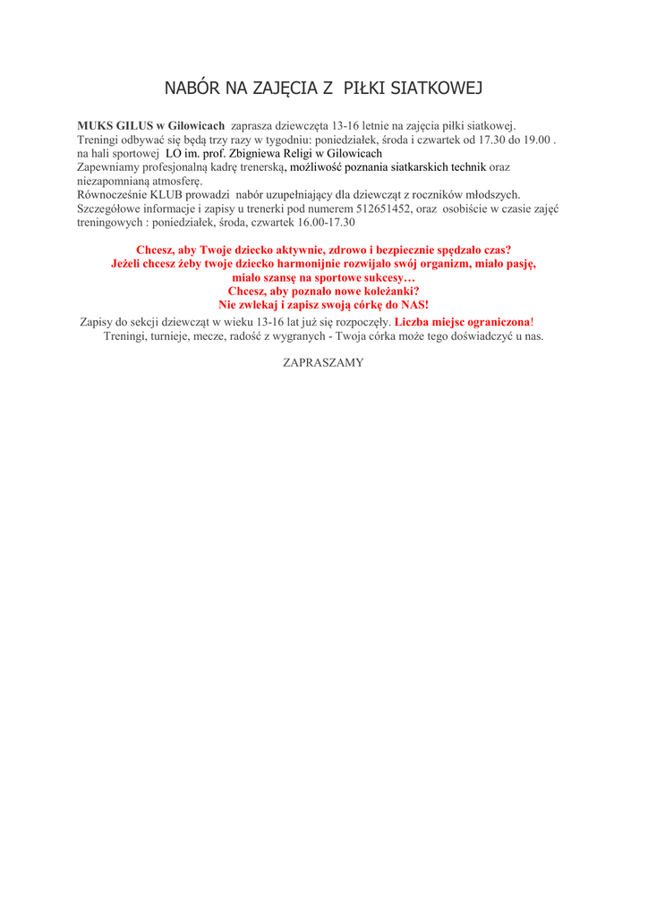 NABÓR NA ZAJĘCIA Z PIŁKI SIATKOWEJ MUKS GILUS w Gilowicach zaprasza dziewczęta 13-16 letnie na zajęcia piłki siatkowej. Treningi odbywać się będą trzy razy w tygodniu: poniedziałek, środa i czwartek od 17.30 do 19.00 . na hali sportowej LO im. prof. Zbigniewa Religi w Gilowicach Zapewniamy profesjonalną kadrę trenerską, możliwość poznania siatkarskich technik oraz niezapomnianą atmosferę. Równocześnie KLUB prowadzi nabór uzupełniający dla dziewcząt z roczników młodszych. Szczegółowe informacje i zapisy u trenerki pod numerem 512651452, oraz osobiście w czasie zajęć treningowych : poniedziałek, środa, czwartek 16.00-17.30 Chcesz, aby Twoje dziecko aktywnie, zdrowo i bezpiecznie spędzało czas? Jeżeli chcesz żeby twoje dziecko harmonijnie rozwijało swój organizm, miało pasję, miało szansę na sportowe sukcesy… Chcesz, aby poznało nowe koleżanki? Nie zwlekaj i zapisz swoją córkę do NAS! Zapisy do sekcji dziewcząt w wieku 13-16 lat już się rozpoczęły. Liczba miejsc ograniczona! Treningi, turnieje, mecze, radość z wygranych - Twoja córka może tego doświadczyć u nas. ZAPRASZAMY
