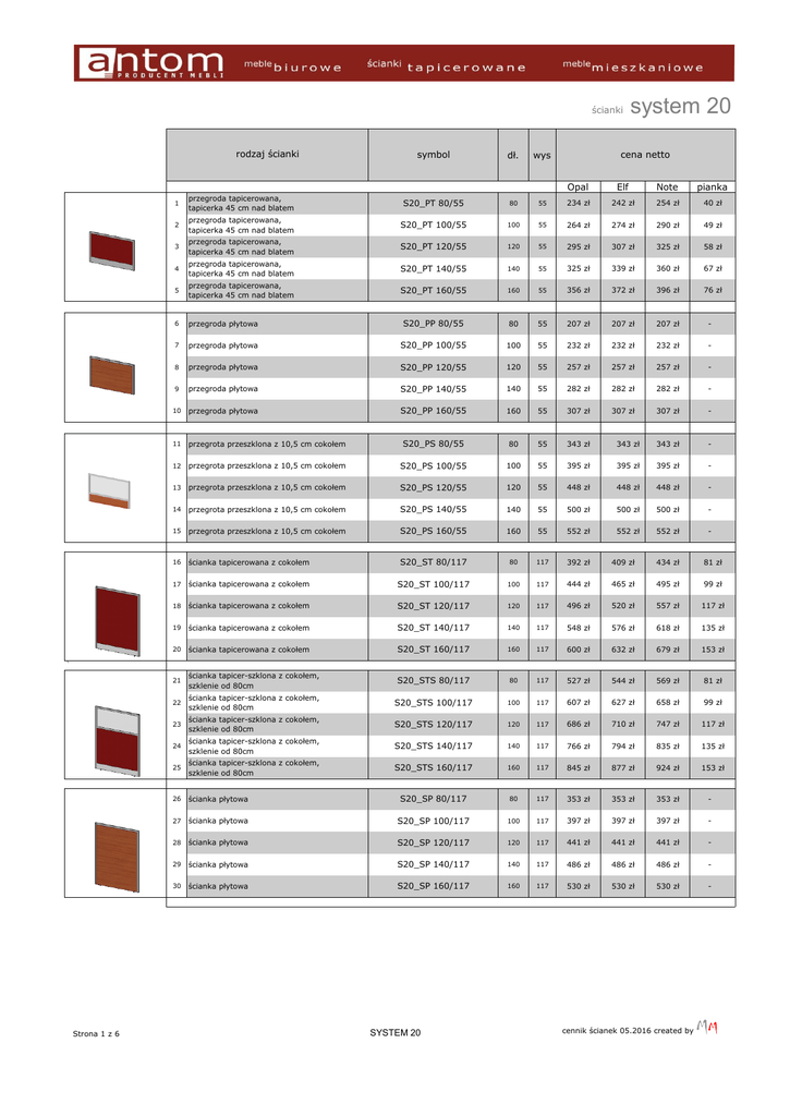 ścianki rodzaj ścianki symbol dł. wys system 20 cena netto Opal Elf Note pianka 1 przegroda tapicerowana, tapicerka 45 cm nad blatem S20_PT 80/55 80 55 234 zł 242 zł 254 zł 40 zł 2 przegroda tapicerowana, tapicerka 45 cm nad blatem S20_PT 100/55 100 55 264 zł 274 zł 290 zł 49 zł 3 przegroda tapicerowana, tapicerka 45 cm nad blatem S20_PT 120/55 120 55 295 zł 307 zł 325 zł 58 zł 4 przegroda tapicerowana, tapicerka 45 cm nad blatem S20_PT 140/55 140 55 325 zł 339 zł 360 zł 67 zł 5 przegroda tapicerowana, tapicerka 45 cm nad blatem S20_PT 160/55 160 55 356 zł 372 zł 396 zł 76 zł 6 przegroda płytowa S20_PP 80/55 80 55 207 zł 207 zł 207 zł - 7 przegroda płytowa S20_PP 100/55 100 55 232 zł 232 zł 232 zł - 8 przegroda płytowa S20_PP 120/55 120 55 257 zł 257 zł 257 zł - 9 przegroda płytowa S20_PP 140/55 140 55 282 zł 282 zł 282 zł - 10 przegroda płytowa S20_PP 160/55 160 55 307 zł 307 zł 307 zł - 11 przegrota przeszklona z 10,5 cm cokołem S20_PS 80/55 80 55 343 zł 343 zł 343 zł - 12 przegrota przeszklona z 10,5 cm cokołem S20_PS 100/55 100 55 395 zł 395 zł 395 zł - 13 przegrota przeszklona z 10,5 cm cokołem S20_PS 120/55 120 55 448 zł 448 zł 448 zł - 14 przegrota przeszklona z 10,5 cm cokołem S20_PS 140/55 140 55 500 zł 500 zł 500 zł - 15 przegrota przeszklona z 10,5 cm cokołem S20_PS 160/55 160 55 552 zł 552 zł 552 zł - 16 ścianka tapicerowana z cokołem S20_ST 80/117 80 117 392 zł 409 zł 434 zł 81 zł 17 ścianka tapicerowana z cokołem S20_ST 100/117 100 117 444 zł 465 zł 495 zł 99 zł 18 ścianka tapicerowana z cokołem S20_ST 120/117 120 117 496 zł 520 zł 557 zł 117 zł 19 ścianka tapicerowana z cokołem S20_ST 140/117 140 117 548 zł 576 zł 618 zł 135 zł 20 ścianka tapicerowana z cokołem S20_ST 160/117 160 117 600 zł 632 zł 679 zł 153 zł 21 ścianka tapicer-szklona z cokołem, szklenie od 80cm S20_STS 80/117 80 117 527 zł 544 zł 569 zł 81 zł 22 ścianka tapicer-szklona z cokołem, szklenie od 80cm S20_STS 100/117 100 117 607 zł 627 zł 658 zł 99 zł ścianka tapicer-szklona z cokołem, 23 szklenie od 80cm S20_STS 120/117 120 117 686 zł 710 zł 747 zł 117 zł ścianka tapicer-szklona z cokołem, 24 szklenie od 80cm S20_STS 140/117 140 117 766 zł 794 zł 835 zł 135 zł ścianka tapicer-szklona z cokołem, 25 szklenie od 80cm S20_STS 160/117 160 117 845 zł 877 zł 924 zł 153 zł ` Strona 1 z 6 26 ścianka płytowa S20_SP 80/117 80 117 353 zł 353 zł 353 zł - 27 ścianka płytowa S20_SP 100/117 100 117 397 zł 397 zł 397 zł - 28 ścianka płytowa S20_SP 120/117 120 117 441 zł 441 zł 441 zł - 29 ścianka płytowa S20_SP 140/117 140 117 486 zł 486 zł 486 zł - 30 ścianka płytowa S20_SP 160/117 160 117 530 zł 530 zł 530 zł - SYSTEM 20 cennik ścianek 05.2016 created by MM ścianki rodzaj ścianki symbol dł. wys system 20 cena netto Opal Elf Note 31 ścianka płytowo-szklona, szklenie od 80cm S20_SPS 80/117 80 117 469 zł 469 zł 469 zł - 32 ścianka płytowo-szklona, szklenie od 80cm S20_SPS 100/117 100 117 537 zł 537 zł 537 zł - 33 ścianka płytowo-szklona, szklenie od 80cm S20_SPS 120/117 120 117 604 zł 604 zł 604 zł - ścianka płytowo-szklona, 34 szklenie od 80cm S20_SPS 140/117 140 117 671 zł 671 zł 671 zł - ścianka płytowo-szklona, 35 szklenie od 80cm S20_SPS 160/117 160 117 738 zł 738 zł 738 zł - ścianka płytowo-tapicerowana, płyta do 69cm pianka S20_SPT 80/117 80 117 365 zł 374 zł 386 zł 40 zł ścianka płytowo-tapicerowana, 37 płyta do 69cm S20_SPT 100/117 100 117 412 zł 422 zł 437 zł 49 zł ścianka płytowo-tapicerowana, 38 płyta do 69cm S20_SPT 120/117 120 117 458 zł 470 zł 488 zł 58 zł ścianka płytowo-tapicerowana, 39 płyta do 69cm S20_SPT 140/117 140 117 504 zł 518 zł 539 zł 67 zł ścianka płytowo-tapicerowana, 40 płyta do 69cm S20_SPT 160/117 160 117 551 zł 567 zł 590 zł 76 zł 36 41 ścianka tapicerowana z cokołem S20_ST 80/140 80 140 428 zł 444 zł 469 zł 81 zł 42 ścianka tapicerowana z cokołem S20_ST 100/140 100 140 484 zł 504 zł 535 zł 99 zł 43 ścianka tapicerowana z cokołem S20_ST 120/140 120 140 540 zł 565 zł 601 zł 117 zł 44 ścianka tapicerowana z cokołem S20_ST 140/140 140 140 597 zł 625 zł 666 zł 135 zł 45 ścianka tapicerowana z cokołem S20_ST 160/140 160 140 653 zł 685 zł 732 zł 153 zł 46 ścianka tapicer-szklona z cokołem, szklenie od 80cm S20_STS 80/80/140 80 140 606 zł 622 zł 647 zł 81 zł 47 ścianka tapicer-szklona z cokołem, szklenie od 80cm S20_STS 100/80/140 100 140 700 zł 720 zł 751 zł 99 zł 48 ścianka tapicer-szklona z cokołem, szklenie od 80cm S20_STS 120/80/140 120 140 794 zł 818 zł 854 zł 117 zł ścianka tapicer-szklona z cokołem, 49 szklenie od 80cm S20_STS 140/80/140 140 140 888 zł 916 zł 958 zł 135 zł ścianka tapicer-szklona z cokołem, 50 szklenie od 80cm S20_STS 160/80/140 160 140 982 zł 1 013 zł 1 061 zł 153 zł ścianka tapicer-szklona z cokołem, szklenie od 117cm ` ` S20_STS 80/117/140 80 140 537 zł 553 zł 578 zł 81 zł ścianka tapicer-szklona z cokołem, 52 szklenie od 117cm S20_STS 100/117/140 100 140 614 zł 635 zł 665 zł 99 zł ścianka tapicer-szklona z cokołem, 53 szklenie od 117cm S20_STS 120/117/140 120 140 692 zł 716 zł 752 zł 117 zł ścianka tapicer-szklona z cokołem, 54 szklenie od 117cm S20_STS 140/117/140 140 140 769 zł 797 zł 839 zł 135 zł ścianka tapicer-szklona z cokołem, 55 szklenie od 117cm S20_STS 160/117/140 160 140 847 zł 878 zł 926 zł 153 zł 51 Strona 2 z 6 56 ścianka płytowa S20_SP 80/140 80 140 400 zł 400 zł 400 zł - 57 ścianka płytowa S20_SP 100/140 100 140 451 zł 451 zł 451 zł - 58 ścianka płytowa S20_SP 120/140 120 140 503 zł 503 zł 503 zł - 59 ścianka płytowa S20_SP 140/140 140 140 554 zł 554 zł 554 zł - 60 ścianka płytowa S20_SP 160/140 160 140 605 zł 605 zł 605 zł - SYSTEM 20 cennik ścianek 05.2016 created by MM ścianki rodzaj ścianki symbol dł. wys system 20 cena nett