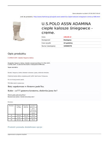 Dane aktualne na dzień: 07-03-2017 05:42 Link do produktu: http://www.fashionup.pl/uspolo-assn-adamina-cieple-kalosze-sniegowce-creme-p-586.html U.S.POLO ASSN ADAMINA ciepłe kalosze śniegowce creme. Cena 199,00 zł Dostępność Dostępny Czas wysyłki 24 godziny Numer katalogowy 10368378 Opis produktu U.S.POLO ASSN - damskie ?niegowce, kalosze. Oryginalne ?niegowce, kalosze damskie renomowanej firmy U.S. Polo ASSN. U.S.Polo ASSN , to ameryka?ska marka z tradycjami od 1890 roku. Model ADAMINA Kozaki, ?niegowce, kalosze damskie wykonane z gumy, cholewka tekstylna. Cholewka bardzo dobrze ocieplona grub? g?bk? zako?czona ?ci?gaczem. Po wew?trznej stronie zamek. Wk?adka ciep?a wyjmowana. Buty zapakowane w firmowe pude?ka. Kolor - cz??? gumowa kremowa, cholewka jasny be? Obuwie godne polecenia pi?kne ! Renomowana marka w bardzo korzystnej cenie ! Rozmiary: Rozmiar D?ugo?? wk?adki Wysoko?? cholewki szeroko?? cholewki na górze -obwód po zewn?trznej stronie 36 23.8 cm 34.5 cm 42 cm 38 25 cm 35 cm 42.5 cm 40 26.5 cm 38 cm 48 cm Produkt posiada dodatkowe opcje: wygenerowano w programie shopGold Rozmiar: 36 , 38 , 40 wygenerowano w programie shopGold Powered by TCPDF (www.tcpdf.org)