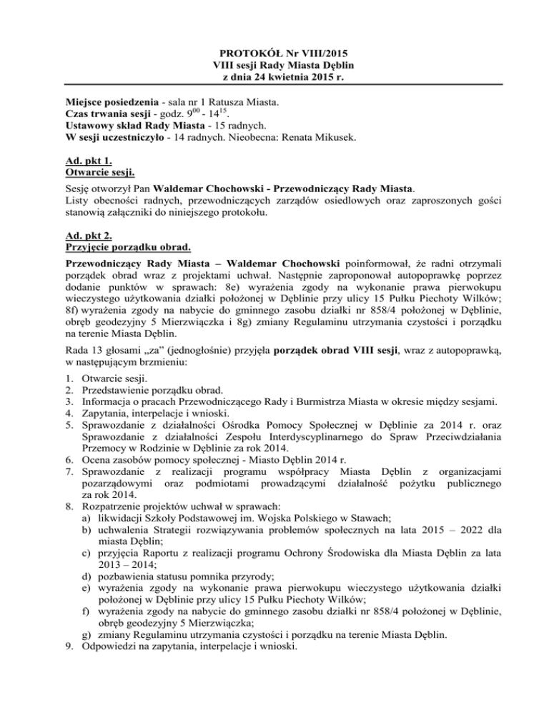 PROTOKÓŁ Nr VIII/2015 VIII sesji Rady Miasta Dęblin z dnia 24 kwietnia 2015 r. Miejsce posiedzenia - sala nr 1 Ratusza Miasta. Czas trwania sesji - godz. 900 - 1415. Ustawowy skład Rady Miasta - 15 radnych. W sesji uczestniczyło - 14 radnych. Nieobecna: Renata Mikusek. Ad. pkt 1. Otwarcie sesji. Sesję otworzył Pan Waldemar Chochowski - Przewodniczący Rady Miasta. Listy obecności radnych, przewodniczących zarządów osiedlowych oraz zaproszonych gości stanowią załączniki do niniejszego protokołu. Ad. pkt 2. Przyjęcie porządku obrad. Przewodniczący Rady Miasta – Waldemar Chochowski poinformował, że radni otrzymali porządek obrad wraz z projektami uchwał. Następnie zaproponował autopoprawkę poprzez dodanie punktów w sprawach: 8e) wyrażenia zgody na wykonanie prawa pierwokupu wieczystego użytkowania działki położonej w Dęblinie przy ulicy 15 Pułku Piechoty Wilków; 8f) wyrażenia zgody na nabycie do gminnego zasobu działki nr 858/4 położonej w Dęblinie, obręb geodezyjny 5 Mierzwiączka i 8g) zmiany Regulaminu utrzymania czystości i porządku na terenie Miasta Dęblin. Rada 13 głosami „za” (jednogłośnie) przyjęła porządek obrad VIII sesji, wraz z autopoprawką, w następującym brzmieniu: 1. 2. 3. 4. 5. 6. 7. 8. 9. Otwarcie sesji. Przedstawienie porządku obrad. Informacja o pracach Przewodniczącego Rady i Burmistrza Miasta w okresie między sesjami. Zapytania, interpelacje i wnioski. Sprawozdanie z działalności Ośrodka Pomocy Społecznej w Dęblinie za 2014 r. oraz Sprawozdanie z działalności Zespołu Interdyscyplinarnego do Spraw Przeciwdziałania Przemocy w Rodzinie w Dęblinie za rok 2014. Ocena zasobów pomocy społecznej - Miasto Dęblin 2014 r. Sprawozdanie z realizacji programu współpracy Miasta Dęblin z organizacjami pozarządowymi oraz podmiotami prowadzącymi działalność pożytku publicznego za rok 2014. Rozpatrzenie projektów uchwał w sprawach: a) likwidacji Szkoły Podstawowej im. Wojska Polskiego w Stawach; b) uchwalenia Strategii rozwiązywania problemów społecznych na lata 2015 – 2022 dla miasta Dęblin; c) przyjęcia Raportu z realizacji programu Ochrony Środowiska dla Miasta Dęblin za lata 2013 – 2014; d) pozbawienia statusu pomnika przyrody; e) wyrażenia zgody na wykonanie prawa pierwokupu wieczystego użytkowania działki położonej w Dęblinie przy ulicy 15 Pułku Piechoty Wilków; f) wyrażenia zgody na nabycie do gminnego zasobu działki nr 858/4 położonej w Dęblinie, obręb geodezyjny 5 Mierzwiączka; g) zmiany Regulaminu utrzymania czystości i porządku na terenie Miasta Dęblin. Odpowiedzi na zapytania, interpelacje i wnioski. 2 10. Zatwierdzenie protokołów z VI i VII (I nadzwyczajnej) sesji Rady Miasta. 11. Zamknięcie sesji. Ad. pkt 3. Informacja o pracach Przewodniczącego Rady i Burmistrza Miasta w okresie między sesjami. Przewodniczący Rady Miasta - Waldemar Chochowski – poinformował o swojej pracy między sesjami: 29 marca – uczestniczyłem w kiermaszu wielkanocnym. 31 marca – odbyła się sesja nadzwyczajna w sprawie zmiany uchwały dotyczącej pobierającego inkaso na targowisku przy ul. 15 Pułku Piechoty Wilków, inkasent zmieni się od 30 kwietnia br., będzie nim Miejski Zakład Gospodarki Komunalnej. 2 kwietnia – w Spotkaniu Wielkanocnym w 4. Skrzydle Lotnictwa Szkolnego i Wyższej Szkoły Oficerskiej Sił Powietrznych uczestniczył Wiceprzewodniczący Rady Miasta - Henryk Wiejak. 8 kwietnia – uczestniczyłem w wernisażu Anety Niedźwiedzkiej, który odbył się w Miejskim Domu Kultury. 14 kwietnia – została odsłonięta tablica pamiątkowa z okazji jubileuszu 90-lecia Szkoły Orląt. Tablica umieszczona jest na budynku Wydziału Lotnictwa Wyższej Szkoły Oficerskiej Sił Powietrznych. 14 kwietnia – odbyło się Zebranie Mieszkańców Osiedla Lotnisko. Nowym Przewodniczącym Zarządu Osiedla został pan Piotr Badaj. 15 kwietnia - w uroczystościach z okazji „Święta Sapera” uczestniczył Wiceprzewodniczący Rady Miasta - Andrzej Banaś. 16 kwietnia – brałem udział w spotkaniu z pisarką Hanną Cygler, które odbyło się w Miejskiej Bibliotece Publicznej Filia Wiślana. 16 kwietnia – odbyło się Zebranie Mieszkańców Osiedla Wiślana. Nowym Przewodniczącym Zarządu Osiedla został pan Andrzej Kurowski. 17 kwietnia – uczestniczyłem w IV Forum Kobiet, które odbywało się w sali Kina Błękit Wyższej Szkoły Oficerskiej Sił Powietrznych. 18 kwietnia – brałem udział w Zebranie Mieszkańców Osiedla Jagiellońskie. Przewodniczącym Zarządu Osiedla ponownie został wybrany pan Robert Wnuk. 21 kwietnia – odbyło się posiedzenie wyjazdowe Komisji Gospodarki Komunalnej w celu przeglądu stanu dróg i czystości na terenie miasta. 21 kwietnia – uczestniczyłem w posiedzeniu Rady Społecznej Samodzielnego Publicznego Zakładu Opieki Zdrowotnej. 21 kwietnia – brałem udział w Zebraniu Mieszkańców Osiedla Irena. Nowym Przewodniczącym Zarządu Osiedla został pan Maciej Krygrowski. 22 kwietnia – odbyło się wspólne posiedzenie wszystkich komisji Rady Miasta, na którym omówione zostały materiały na dzisiejszą sesję. W dniach 28-29 kwietnia planowany jest przegląd placów zabaw na terenie miasta, prosimy Przewodniczących Zarządów Osiedlowych o uczestnictwo. Burmistrz Miasta – Beata Siedlecka przedłożyła informację o swojej pracy w okresie od 27.03.2015 r. do 23.04.2015 r. 27 marca – odbył się Kiermasz Wielkanocny, w którym uczestniczyli mieszkańcy Dęblina. Okazało się, że impreza zorganizowana przed Urzędem Miasta z wykorzystaniem nowej infrastruktury cieszy się popularnością, dlatego będziemy starać się robić coraz więcej tego rodzaju imprez. Protokół Nr VIII sesji Rady Miasta Dęblin w dniu 24 kwietnia 2015 r. 3 1 kwietnia – wraz z Prezesem Miejskiego Zakładu Gospodarki Komunalnej odbyłam spotkanie z Wicemarszałkiem Sejmiku Województwa - Panem Arturem Walaskiem. Poruszane były kwestie 