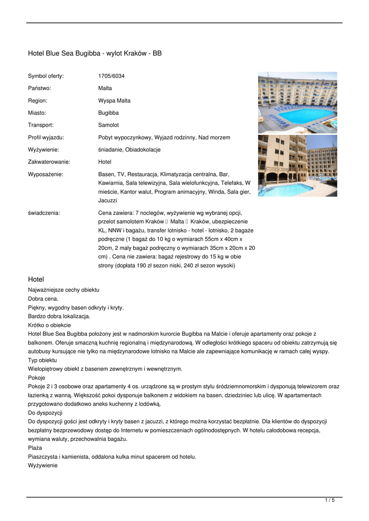 Hotel Blue Sea Bugibba - wylot Kraków - BB Symbol oferty: 1705/6034 Państwo: Malta Region: Wyspa Malta Miasto: Bugibba Transport: Samolot Profil wyjazdu: Pobyt wypoczynkowy, Wyjazd rodzinny, Nad morzem Wyżywienie: śniadanie, Obiadokolacje Zakwaterowanie: Hotel Wyposażenie: Basen, TV, Restauracja, Klimatyzacja centralna, Bar, Kawiarnia, Sala telewizyjna, Sala wielofunkcyjna, Telefaks, W mieście, Kantor walut, Program animacyjny, Winda, Sala gier, Jacuzzi świadczenia: Cena zawiera: 7 noclegów, wyżywienie wg wybranej opcji, przelot samolotem Kraków Malta Kraków, ubezpieczenie KL, NNW i bagażu, transfer lotnisko - hotel - lotnisko, 2 bagaże podręczne (1 bagaż do 10 kg o wymiarach 55cm x 40cm x 20cm, 2 mały bagaż podręczny o wymiarach 35cm x 20cm x 20 cm) . Cena nie zawiera: bagaż rejestrowy do 15 kg w obie strony (dopłata 190 zł sezon niski, 240 zł sezon wysoki) Hotel Najważniejsze cechy obiektu Dobra cena. Piękny, wygodny basen odkryty i kryty. Bardzo dobra lokalizacja. Krótko o obiekcie Hotel Blue Sea Bugibba położony jest w nadmorskim kurorcie Bugibba na Malcie i oferuje apartamenty oraz pokoje z balkonem. Oferuje smaczną kuchnię regionalną i międzynarodową. W odległości krótkiego spaceru od obiektu zatrzymują się autobusy kursujące nie tylko na międzynarodowe lotnisko na Malcie ale zapewniające komunikację w ramach całej wyspy. Typ obiektu Wielopiętrowy obiekt z basenem zewnętrznym i wewnętrznym. Pokoje Pokoje 2 i 3 osobowe oraz apartamenty 4 os. urządzone są w prostym stylu śródziemnomorskim i dysponują telewizorem oraz łazienką z wanną. Większość pokoi dysponuje balkonem z widokiem na basen, dziedziniec lub ulicę. W apartamentach przygotowano dodatkowo aneks kuchenny z lodówką. Do dyspozycji Do dyspozycji gości jest odkryty i kryty basen z jacuzzi, z którego można korzystać bezpłatnie. Dla klientów do dyspozycji bezpłatny bezprzewodowy dostęp do Internetu w pomieszczeniach ogólnodostępnych. W hotelu całodobowa recepcja, wymiana waluty, przechowalnia bagażu. Plaża Piaszczysta i kamienista, oddalona kulka minut spacerem od hotelu. Wyżywienie 1/5 W porze lunchu i kolacji restauracja zaprasza na potrawy kuchni kontynentalnej w formie bufetu. Obiekt dysponuje również barem serwującym przekąski. Oferty z następującymi opcjami wyżywienia: OV: bez wyżywienia (we własnym zakresie), BB: śniadania, HB: śniadania i obiadokolacje, FB: śniadania, obiady i kolacje AI: -All Inclusive”, wszystko w cenie - w programie all inclusive* Bufet śniadaniowy 7:30-10:00, obiad w formie bufetu 12:30-14:00 (+ napoje: lokalne wino, piwo, napoje bezalkoholowe), kolacja w formie bufetu 18:00-20:30 + napoje: lokalne wino, piwo, napoje bezalkoholowe), przekąski, lody 10:00-23:00, napoje 10:00-23:00. Dodatkowo w cenie rozrywki: dart, tenis stołowy, muzyka na żywo, pokój z filmami *hotel zastrzega sobie prawo do zmiany godzin/programu Program ramowy: Dzień 1 - wylot z Polski, przylot, transfer do hotelu, zakwaterowanie w hotelu Dzień 1-8 - pobyt i aktywność własna Dzień 8 - opuszczanie pokoi, oczekiwanie na transfer, transfer na lotnisko, przylot do Polski Godziny odlotu i przylotu: Kraków › Malta 11.50 - 14.30 (ND) od 29.03 ŚR 18.45 - 21.25, SB 6.55 - 9.35 od 06.06 do 18.07 wyloty WT 18.40 - 21.20, SB 6.55 - 9.35 Malta › Kraków 8.45 - 11.25 (ND) od 29.03 ŚR 15.40 - 18.20, SB 10.00 - 12.40 od 10.06 do 25.07 powroty WT 15.35 - 18.15, SB 10.00 - 12.40 Cena zawiera: 7 noclegów wyżywienie wg wybranej opcji przelot samolotem Kraków - Malta - Kraków ubezpieczenie KL, NNW i bagażu transfer lotnisko-hotel-lotnisko 2 bagaże podręczne na osobę (1 bagaż do 10 kg o wymiarach 55cm x 40cm x 20cm, 2 mały bagaż podręczny o wymiarach 35cm x 20cm x 20 cm) Cena nie zawiera: bagaż rejestrowy do 15 kg w obie strony (sezon niski) - dopłata 190 zł/szt. Cena obowiązuje w dniu rezerwacji. Sezon niski obejmuje daty w okresie: 01/10/16 - 20/12/16 05/01/17 - 31/05/17 bagaż rejestrowy do 15 kg w obie strony (sezon wysoki) - dopłata 240 zł/szt. Cena obowiązuje w dniu rezerwacji. Sezon wysoki obejmuje daty w okresie: 21/12/16 - 04/01/17 01/06/17 - 30/09/17 Podatek turystyczny Zgodnie nowym rozporządzeniem rządu Malty, od 1 czerwca 2016 roku wszyscy dorośli turyści przyjeżdżający na Maltę zostaną objęci taxą klimatyczną. Nowy podatek będzie pobierany w hotelu podczas zakwaterowania lub wykwaterowania. 2/5 Wysokość opłaty została ustalona na kwotę 0,5€ za dobę a jej maksymalna wysokość będzie wynosić 5€ za pobyt. Dzieci/ulgi: 1 i 2 dziecko do 11,99 lat na łóżku pomocniczym - zniżka 20% dzieci do lat 1,99 przy 2 osobach dorosłych - stała cena 380 zł Suplementy/pozostałe: pokój 1-osobowy - dopłata 40% ubezpieczenie KR 5% wartości rezerwacji Uwagi zaliczka 30% wartości rezerwacji dla ofert opartych na transporcie lotniczym rejsowym przed zakupem prosimy o sprawdzenie dostępności terminów i obiektów TERMINY: od: 2017-03-29 do: 2017-04-05 (8 dni), miejsca: sprawdź miejsca cena od: 1559 PLN od: 2017-04-01 do: 2017-04-08 (8 dni), miejsca: sprawdź miejsca cena od: 1659 PLN od: 2017-04-08 do: 2017-04-15 (8 dni), miejsca: sprawdź miejsca cena od: 1659 PLN od: 2017-04-12 do: 2017-04-19 (8 dni), miejsca: sprawdź miejsca cena od: 2059 PLN od: 2017-04-15 do: 2017-04-22 (8 dni), miejsca: sprawdź miejsca cena od: 1859 PLN od: 2017-04-19 do: 2017-04-26 (8 dni), miejsca: sprawdź miejsca cena od: 1859 PLN od: 2017-04-22 do: 2017-04-29 (8 dni), miejsca: sprawdź miejsca cena od: 2159 PLN od: 2017-04-26 do: 2017-05-03 (8 dni), miejsca: sprawdź miejsca cena od: 2059 PLN od: 2017-04-29 do: 2017-05-06 (8 dni), miejsca: sprawdź miejsca cena od: 2359 PLN od: 2017-05-03 do: 2017-05-10 (8 dni), miejsca: sprawdź miejsca cena od: 1859 PLN od: 2017-05-06 do: 2017-05-13 (8 dni), miejsca: sprawdź miejsca cena od: 1999 PLN od: 2017-05-10 do: 2017-05-17 (8 dni), miejsca: sprawdź miejsca cena od: 1759 PLN od: 20