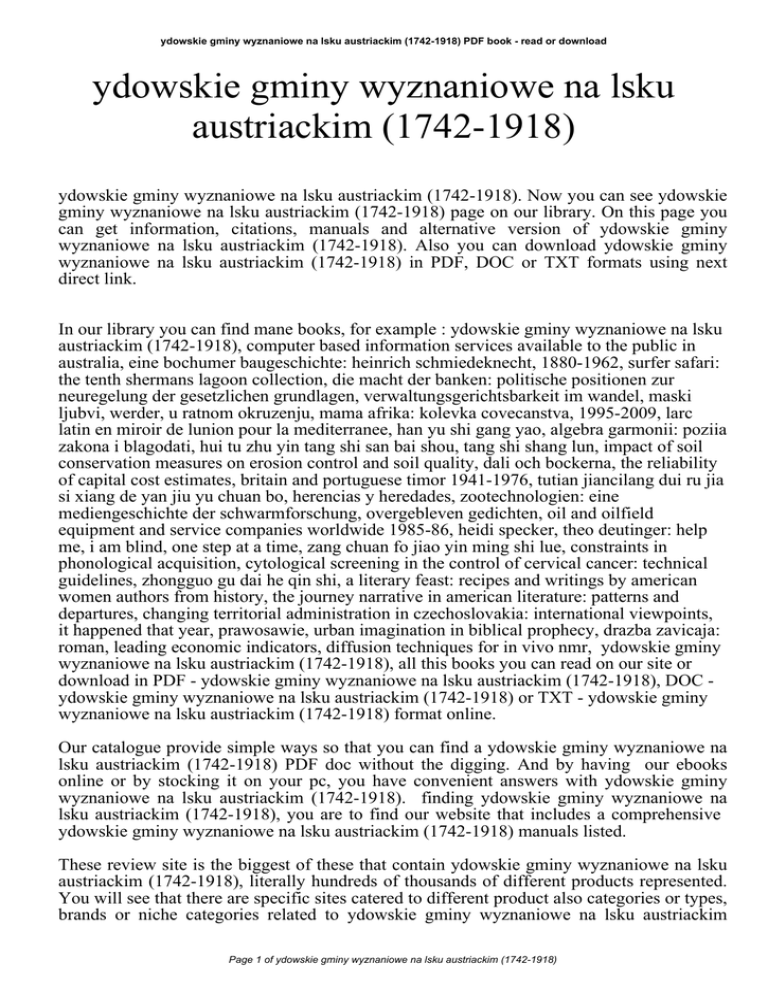 ydowskie gminy wyznaniowe na lsku austriackim (1742-1918) PDF book - read or download ydowskie gminy wyznaniowe na lsku austriackim (1742-1918) ydowskie gminy wyznaniowe na lsku austriackim (1742-1918). Now you can see ydowskie gminy wyznaniowe na lsku austriackim (1742-1918) page on our library. On this page you can get information, citations, manuals and alternative version of ydowskie gminy wyznaniowe na lsku austriackim (1742-1918). Also you can download ydowskie gminy wyznaniowe na lsku austriackim (1742-1918) in PDF, DOC or TXT formats using next direct link. In our library you can find mane books, for example : ydowskie gminy wyznaniowe na lsku austriackim (1742-1918), computer based information services available to the public in australia, eine bochumer baugeschichte: heinrich schmiedeknecht, 1880-1962, surfer safari: the tenth shermans lagoon collection, die macht der banken: politische positionen zur neuregelung der gesetzlichen grundlagen, verwaltungsgerichtsbarkeit im wandel, maski ljubvi, werder, u ratnom okruzenju, mama afrika: kolevka covecanstva, 1995-2009, larc latin en miroir de lunion pour la mediterranee, han yu shi gang yao, algebra garmonii: poziia zakona i blagodati, hui tu zhu yin tang shi san bai shou, tang shi shang lun, impact of soil conservation measures on erosion control and soil quality, dali och bockerna, the reliability of capital cost estimates, britain and portuguese timor 1941-1976, tutian jiancilang dui ru jia si xiang de yan jiu yu chuan bo, herencias y heredades, zootechnologien: eine mediengeschichte der schwarmforschung, overgebleven gedichten, oil and oilfield equipment and service companies worldwide 1985-86, heidi specker, theo deutinger: help me, i am blind, one step at a time, zang chuan fo jiao yin ming shi lue, constraints in phonological acquisition, cytological screening in the control of cervical cancer: technical guidelines, zhongguo gu dai he qin shi, a literary feast: recipes and writings by american women authors from history, the journey narrative in american literature: patterns and departures, changing territorial administration in czechoslovakia: international viewpoints, it happened that year, prawosawie, urban imagination in biblical prophecy, drazba zavicaja: roman, leading economic indicators, diffusion techniques for in vivo nmr, ydowskie gminy wyznaniowe na lsku austriackim (1742-1918), all this books you can read on our site or download in PDF - ydowskie gminy wyznaniowe na lsku austriackim (1742-1918), DOC ydowskie gminy wyznaniowe na lsku austriackim (1742-1918) or TXT - ydowskie gminy wyznaniowe na lsku austriackim (1742-1918) format online. Our catalogue provide simple ways so that you can find a ydowskie gminy wyznaniowe na lsku austriackim (1742-1918) PDF doc without the digging. And by having our ebooks online or by stocking it on your pc, you have convenient answers with ydowskie gminy wyznaniowe na lsku austriackim (1742-1918). finding ydowskie gminy wyznaniowe na lsku austriackim (1742-1918), you are to find our website that includes a comprehensive ydowskie gminy wyznaniowe na lsku austriackim (1742-1918) manuals listed. These review site is the biggest of these that contain ydowskie gminy wyznaniowe na lsku austriackim (1742-1918), literally hundreds of thousands of different products represented. You will see that there are specific sites catered to different product also categories or types, brands or niche categories related to ydowskie gminy wyznaniowe na lsku austriackim Page 1 of ydowskie gminy wyznaniowe na lsku austriackim (1742-1918) ydowskie gminy wyznaniowe na lsku austriackim (1742-1918) PDF book - read or download (1742-1918). So depending on what exactly you are searching, you will be able to choose ebooks ydowskie gminy wyznaniowe na lsku austriackim (1742-1918) to suit your own needs, ydowskie gminy wyznaniowe na lsku austriackim (1742-1918). Page 2 of ydowskie gminy wyznaniowe na lsku austriackim (1742-1918)