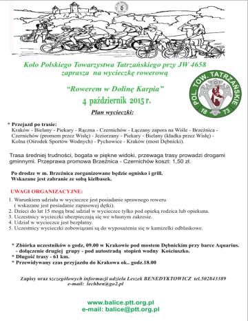 Ko³o Polskiego Towarzystwa Tatrzañskiego przy JW 4658 zaprasza na wycieczkê rowerow¹ “Rowerem w Dolinê Karpia” 4 paŸdziernik 2015 r. Plan wycieczki: * Przejazd po trasie: Kraków - Bielany - Piekary - R¹czna - Czernichów - £¹czany zapora na Wiœle - BrzeŸnica Czernichów (promem przez Wis³ê) - Jeziorzany - Piekary - Bielany (k³adka przez Wis³ê) Kolna (Oœrodek Sportów Wodnych) - Pychowice - Kraków (most Dêbnicki). Trasa œredniej trudnoœci, bogata w piêkne widoki, przewaga trasy prowadzi drogami gminnymi. Przeprawa promowa BrzeŸnica - Czernichów koszt: 1,50 z³. Po drodze w m. BrzeŸnica zorganizowane bêdzie ognisko i grill. Wskazane jest zabranie ze sob¹ kie³basek. UWAGI ORGANIZACYJNE: 1. Warunkiem udzia³u w wycieczce jest posiadanie sprawnego roweru ( wskazane jest posiadanie zapasowej dêtki). 2. Dzieci do lat 15 mog¹ braæ udzia³ w wycieczce tylko pod opiek¹ rodzica lub opiekuna. 3. Uczestnicy wycieczki ubezpieczaj¹ siê we w³asnym zakresie. 4. Udzia³ w wycieczce jest bezp³atny. 5. Uczestnicy wycieczki zobowi¹zani s¹ do wyposa¿enia siê w kamizelki odblaskowe. * Zbiórka uczestników o godz, 09.00 w Krakowie pod mostem Dêbnickim przy barce Aquarius. - do³¹czenie drugiej grupy - pod autostrad¹ stopieñ wodny Koœciuszko. * D³ugoœæ trasy - 61 km. * Przewidywany czas przyjazdu do Krakowa ok.. godz.18.00 Zapisy oraz szczegó³owych informacji udziela Leszek BENEDYKTOWICZ tel.502843389 e-mail: [email protected] www.balice.ptt.org.pl e-mail: [email protected]