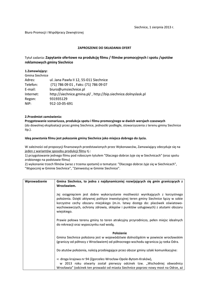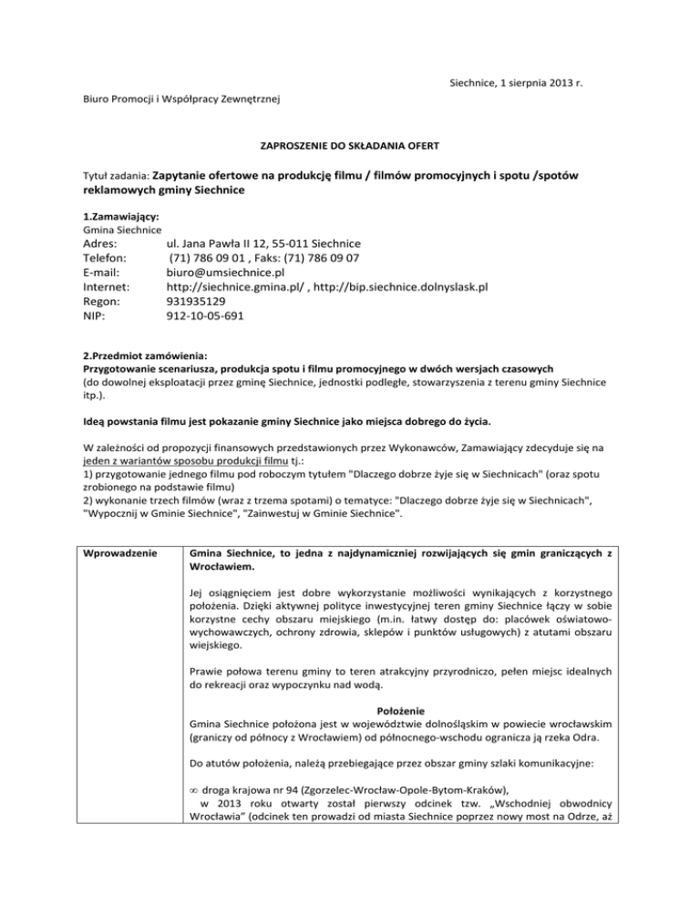 Siechnice, 1 sierpnia 2013 r. Biuro Promocji i Współpracy Zewnętrznej ZAPROSZENIE DO SKŁADANIA OFERT Tytuł zadania: Zapytanie ofertowe na produkcję filmu / filmów promocyjnych i spotu /spotów reklamowych gminy Siechnice 1.Zamawiający: Gmina Siechnice Adres: Telefon: E-mail: Internet: Regon: NIP: ul. Jana Pawła II 12, 55-011 Siechnice (71) 786 09 01 , Faks: (71) 786 09 07 [email protected] http://siechnice.gmina.pl/ , http://bip.siechnice.dolnyslask.pl 931935129 912-10-05-691 2.Przedmiot zamówienia: Przygotowanie scenariusza, produkcja spotu i filmu promocyjnego w dwóch wersjach czasowych (do dowolnej eksploatacji przez gminę Siechnice, jednostki podległe, stowarzyszenia z terenu gminy Siechnice itp.). Ideą powstania filmu jest pokazanie gminy Siechnice jako miejsca dobrego do życia. W zależności od propozycji finansowych przedstawionych przez Wykonawców, Zamawiający zdecyduje się na jeden z wariantów sposobu produkcji filmu tj.: 1) przygotowanie jednego filmu pod roboczym tytułem "Dlaczego dobrze żyje się w Siechnicach" (oraz spotu zrobionego na podstawie filmu) 2) wykonanie trzech filmów (wraz z trzema spotami) o tematyce: "Dlaczego dobrze żyje się w Siechnicach", "Wypocznij w Gminie Siechnice", "Zainwestuj w Gminie Siechnice". Wprowadzenie Gmina Siechnice, to jedna z najdynamiczniej rozwijających się gmin graniczących z Wrocławiem. Jej osiągnięciem położenia. Dzięki korzystne cechy wychowawczych, wiejskiego. jest dobre wykorzystanie możliwości wynikających z korzystnego aktywnej polityce inwestycyjnej teren gminy Siechnice łączy w sobie obszaru miejskiego (m.in. łatwy dostęp do: placówek oświatowoochrony zdrowia, sklepów i punktów usługowych) z atutami obszaru Prawie połowa terenu gminy to teren atrakcyjny przyrodniczo, pełen miejsc idealnych do rekreacji oraz wypoczynku nad wodą. Położenie Gmina Siechnice położona jest w województwie dolnośląskim w powiecie wrocławskim (graniczy od północy z Wrocławiem) od północnego-wschodu ogranicza ją rzeka Odra. Do atutów położenia, należą przebiegające przez obszar gminy szlaki komunikacyjne: • droga krajowa nr 94 (Zgorzelec-Wrocław-Opole-Bytom-Kraków), w 2013 roku otwarty został pierwszy odcinek tzw. „Wschodniej obwodnicy Wrocławia” (odcinek ten prowadzi od miasta Siechnice poprzez nowy most na Odrze, aż do Łan w gminie Czernica - długość odcinka to ok.6 km). Docelowo droga połączy autostradę A4 z drogą S8.Trwa budowa następnych odcinków tej trasy. W dużej części obwodnica będzie prowadzić przez gminę Siechnice. • droga wojewódzka nr 395 (Paczków-Ziębice-Strzelin-Wrocław), • trzy linie kolejowe Nowoczesna gmina W celu poprawy jakości obsługi mieszkańców i interesantów w maju 2012 roku zakończyła się budowa nowego budynku administracyjnego w Siechnicach. Wokół niego powstaje nowe centrum miasta (http://www.bryla.pl/bryla/1,85301,14143045,Imponujaca_inwestycja_w_Siechnicach __Nowe_centrum.html ) Niezwykle korzystne położenie gminy Siechnice od wielu lat sprzyja rozwojowi, między innymi takich dziedzin jak: gospodarka, budownictwo mieszkaniowe czy turystyka. Gmina Siechnice aktywnie sięga po fundusze zewnętrzne, w tym środki europejskie i skutecznie je wykorzystuje. Dzięki temu rozwijamy się jeszcze szybciej. Przykładem tego może być stadion lekkoatletyczny, który powstaje w Siechnicach właśnie z pomocą Funduszy Unijnych. Na wiosnę 2012 roku otwarty został unikatowy obiekt turystyczny – 40 wieża widokowa w Kotowicach, która również powstała przy wsparciu środków zewnętrznych. Budownictwo Ostatnie lata to dynamiczny rozwój budownictwa mieszkaniowego. Wybudowano ponad 1000 domów jednorodzinnych oraz około 500 mieszkań w budynkach wielorodzinnych, głównie w Siechnicach, Radwanicach, Świętej Katarzynie, Groblicach, Iwinach, Żernikach Wrocławskich i Ozorzycach. W ciągu ostatnich 15 lat ilość mieszkańców wzrosła z 9 tysięcy do prawie 17 tysięcy osób. Ludność W tym momencie na jej terenie zameldowanych jest ponad 16 tysięcy osób, a liczba ta z każdym rokiem wzrasta o kilkuset nowych mieszkańców. Ponadto na terenie gminy zamieszkuje duża liczba osób niezameldowanych. Liczba mieszkańców rośnie coraz szybciej w wyniku migracji ludności przede wszystkim z Wrocławia. Cztery największe miejscowości gminy to: Siechnice (5 106 osób), Radwanice (2 743 osób), Święta Katarzyna (2 164 osób) i Żerniki Wrocławskie (1 599 osób) skupiają one ponad 70% ludności gminy. Przyroda Przyroda z całą pewnością stanowi jedno z największych bogactw gminy. Swoją wyjątkowość zawdzięcza przede wszystkim rzece Odrze, która przez setki lat kształtowała krajobraz gminy. Właśnie ona stworzyła urozmaicone ukształtowanie terenu, a szata roślinna i fauna uzupełniają niezwykłą całość. Dowodem na wyjątkowość tego obszaru jest włączenie części terenu gminy do obszarów Natury 2000, czyli Europejskiej Sieci Ekologicznej Obszarów Chronionych. Przez teren gminy przepływają trzy rzeki. Największą z nich jest oczywiście Odra. Stanowi ona północno-wschodnią, naturalną granicę gminy. Pozostałe dwie rzeki gminy to: Oława i Zielona. Na terenie gminy znajduje się kilka jezior, będących siedliskiem wielu roślin i zwierząt. Jeziora są również świetnym miejscem wypoczynku i rekreacji dla okolicznych mieszkańców. Wszystkie mają charakter starorzeczy, czyli jezior powstałych w starych korytach rzecznych, w tym przypadku rzeki Odry. Lasy Siechnickie i Kotowickie to kompleks lasów mieszanych rozciągających się pomiędzy brzegiem Odry i miejscowościami Siechnice i Kotowice. Na obszarze leśnym obserwować można bogactwo fauny. Wspomnieć tu należy o: kilkudziesięciu gatunkach ptaków (w tym gatunkach bardzo rzadkich na pozostałym obszarze kraju), małych ssakach, zwierzynie łownej (zając, sarna, dzik) oraz wielu gatunkach ryb występujących w wodach znajduj