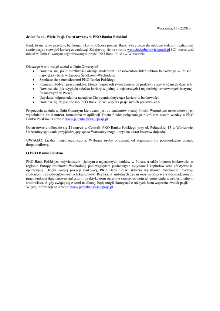 Warszawa, 15.02.2013r.: Jeden Bank. Wiele Pasji. Dzień otwarty w PKO Banku Polskim! Bank to nie tylko przelew, bankomat i konto. Chcesz poznać Bank, który pozwala młodym ludziom realizować swoje pasje i rozwijać karierę zawodową? Zarejestruj się na stronie www.jedenbankwielepasji.pl i 21 marca weź udział w Dniu Otwartym organizowanym przez PKO Bank Polski w Warszawie. Dlaczego warto wziąć udział w Dniu Otwartym? Dowiesz się, jakie możliwości oferuje studentom i absolwentom lider sektora bankowego w Polsce i największy bank w Europie Środkowo-Wschodniej. Spotkasz się z menedżerami PKO Banku Polskiego. Poznasz młodych pracowników, którzy rozpoczęli swoją karierę od praktyk i staży w różnych działach . Dowiesz się, jak wygląda ścieżka kariery w jednej z najstarszych i najbardziej szanowanych instytucji finansowych w Polsce. Uzyskasz odpowiedzi na nurtujące Cię pytania dotyczące kariery w bankowości. Dowiesz się, w jaki sposób PKO Bank Polski wspiera pasje swoich pracowników. Propozycja udziału w Dniu Otwartym kierowana jest do studentów z całej Polski. Warunkiem uczestnictwa jest wypełnienie do 4 marca formularza w aplikacji Talent Finder połączonego z krótkim testem wiedzy o PKO Banku Polskim na stronie www.jedenbankwielepasji.pl. Dzień otwarty odbędzie się 21 marca w Centrali PKO Banku Polskiego przy ul. Puławskiej 15 w Warszawie. Uczestnicy spotkania przyjeżdżający spoza Warszawy mogą liczyć na zwrot kosztów dojazdu. UWAGA! Liczba miejsc ograniczona. Wybrane osoby otrzymają od organizatorów potwierdzenie udziału drogą mailową. O PKO Banku Polskim PKO Bank Polski jest największym i jednym z najstarszych banków w Polsce, a także liderem bankowości w regionie Europy Środkowo-Wschodniej pod względem posiadanych aktywów i kapitałów oraz efektywności operacyjnej. Dzięki swojej pozycji rynkowej, PKO Bank Polski stwarza wyjątkowe możliwości rozwoju studentom i absolwentom różnych kierunków. Realizacja ambitnych zadań oraz współpraca z doświadczonymi pracownikami daje naszym stażystom i praktykantom ogromne szanse rozwoju ich potencjału w profesjonalnym środowisku. A gdy zwiążą się z nami na dłużej, będą mogli skorzystać z różnych form wsparcia swoich pasji. Więcej informacji na stronie: www.jedenbankwielepasji.pl
