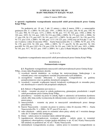UCHWAŁA NR XXX/ 205 /09 RADY MIEJSKIEJ W KSIĄŻU WLKP. z dnia 31 marca 2009 roku w sprawie regulaminu wynagradzania nauczycieli szkół prowadzonych przez Gminę Książ Wlkp. Na podstawie art. 18 ust. 2 pkt 15 ustawy z dnia 8 marca 1990 r. o samorządzie gminnym (Dz. U. z 2001r. Nr 142, poz. 1591 , z 2002r. Nr 23, poz. 220, Nr 62, poz. 558, Nr 113, poz. 984, Nr 153 poz. 1271, z 2003r. Nr 80, poz. 717, Nr 162, poz. 1568, z 2004r. Nr 102, poz. 1055, Nr 116, poz. 1203, Nr 214, poz.1806, z 2005r. Nr 172, poz.1441, z 2006r. Nr 17, poz.128, Nr 175, poz.1457, Nr 181, poz.1337, z 2007r. Nr 48, poz.327, Nr 138, poz.974, Nr 173, poz.1218, z 2008 r. Nr 180, poz. 1111 i Nr 223, poz. 1458) oraz art.91d pkt 1 i art. 30 ust. 6 ustawy z dnia 26 stycznia 1982r. – Karta Nauczyciela (Dz. U. z 2006r. Nr 97, poz. 674, Nr 170, poz.1218, Nr 220, poz. 1600, z 2007r. Nr 17, poz.95, Nr 80, poz.542, Nr 102, poz.689, Nr 158, poz.1103 i Nr 176, poz.1238, Nr 191, poz. 1369, Nr 247, poz. 1821, z 2008r. Nr 145, poz. 917, Nr 227, poz. 1505 i z 2009 r. Nr 1, poz.1) Rada Miejska w Książu Wlkp. uchwala Regulamin wynagradzania nauczycieli szkół prowadzonych przez Gminę Książ Wlkp. ROZDZIAŁ I Postanowienia wstępne § 1. Regulamin wynagradzania nauczycieli szkół prowadzonych przez Gminę Książ Wlkp., zwany dalej Regulaminem określa: 1) wysokość stawek dodatków: za wysługę lat, motywacyjnego, funkcyjnego i za warunki pracy oraz szczegółowe warunki przyznawania tych dodatków, 2) szczegółowe warunki obliczania i wypłacania wynagrodzenia za godziny ponadwymiarowe oraz za godziny doraźnych zastępstw, 3) wysokość i warunki wypłacania innych świadczeń wynikających ze stosunku pracy nie określonych w ustawie lub przepisach odrębnych. 1) 2) 3) 4) 5) 6) 7) 8) § 2. Ilekroć w Regulaminie jest mowa o: szkole – rozumie się przez to szkołę podstawową, gimnazjum, przedszkole i zespół szkół prowadzone przez Gminę Książ Wlkp., pracodawcy – rozumie się przez to szkołę, bądź w zależności od kontekstu dyrektora szkoły albo inną osobę wyznaczoną do dokonywania czynności w sprawach z zakresu prawa pracy, nauczycielach – rozumie się przez to nauczycieli zatrudnionych przez danego pracodawcę, Karcie Nauczyciela – rozumie się przez to ustawę z dnia 26 stycznia 1982 r. - Karta Nauczyciela (Dz. U. z 2006 r. Nr 97, poz.674 ze zm.), roku szkolnym – należy przez to rozumieć okres pracy szkoły od 1 września danego roku do 31 sierpnia roku następnego, klasie – należy przez to rozumieć także oddział lub grupę, tygodniowym obowiązkowym wymiarze godzin – należy przez to rozumieć tygodniowy obowiązkowy wymiar godzin określony w art. 42 ust.3 Karty Nauczyciela lub ustalony na podstawie art. 42 ust. 7 Karty Nauczyciela. minimalnym wynagrodzeniu za pracę – należy przez to rozumieć wynagrodzenie za pracę ustalane na podstawie odrębnych przepisów. § 3. 1. Regulamin obejmuje wszystkich nauczycieli szkół. 2. Regulaminu nie stosuje się do pracowników szkół nie będących nauczycielami. ROZDZIAŁ II Dodatek za wysługę lat § 4.1. Nauczycielom przysługuje dodatek za wysługę lat w wysokości 1% wynagrodzenia zasadniczego za każdy rok pracy wypłacany w okresach miesięcznych poczynając od czwartego roku pracy z tym, że dodatek ten nie może przekroczyć 20% wynagrodzenia zasadniczego. 2. Dodatek za wysługę lat przysługuje: 1) począwszy od pierwszego dnia miesiąca kalendarzowego następującego po miesiącu, w którym nauczyciel nabył prawo do dodatku lub do wyższej stawki dodatku, jeżeli nabycie prawa nastąpiło w ciągu miesiąca, 2) za dany miesiąc, jeżeli nabycie prawa do dodatku lub wyższej jego stawki nastąpiło od pierwszego dnia miesiąca. 3. Dodatek za wysługę lat przysługuje za okres urlopu dla poratowania zdrowia oraz za dni, za które nauczyciel otrzymuje wynagrodzenie chyba, że przepis szczególny stanowi inaczej. Dodatek ten przysługuje również za dni nieobecności w pracy z powodu niezdolności do pracy w skutek choroby bądź konieczności osobistego sprawowania opieki nad dzieckiem lub innym chorym członkiem rodziny, za które nauczyciel otrzymuje wynagrodzenie lub zasiłek z ubezpieczenia społecznego. 4. Dodatek za wysługę lat wypłaca się z góry, w terminie wypłaty wynagrodzenia. ROZDZIAŁ III Dodatek motywacyjny § 5.1. Dodatek motywacyjny może być przyznawany nie wcześniej niż po przepracowaniu przez nauczyciela jednego roku szkolnego. 2. Warunkiem przyznania nauczycielowi dodatku motywacyjnego jest: 1/ uzyskiwanie szczególnych osiągnięć dydaktycznych, wychowawczych i opiekuńczych, a zwłaszcza: a) uzyskiwanie przez uczniów, z uwzględnieniem ich możliwości oraz warunków pracy nauczyciela, dobrych osiągnięć dydaktyczno - wychowawczych potwierdzanych wynikami klasyfikacji lub promocji, efektami egzaminów i sprawdzianu albo sukcesami w konkursach, zawodach, olimpiadach itp., b) umiejętne rozwiązywanie problemów wychowawczych uczniów we współpracy z ich rodzicami, c) pełne rozpoznanie środowiska wychowawczego uczniów, aktywne i efektywne działanie na rzecz uczniów potrzebujących szczególnej opieki, 2/ jakość świadczonej pracy, w tym związanej z powierzonym stanowiskiem kierowniczym, dodatkowym zadaniem lub zajęciem, a zwłaszcza: a) podnoszenie umiejętności zawodowych, b) dbałość o estetykę powierzonych pomieszczeń, i sprawność pomocy dydaktycznych i innych urządzeń szkolnych, 3/ posiadanie co najmniej dobrej oceny pracy, 4/ zaangażowanie w realizację czynności i zajęć, o których mowa w art.42 ust.2 Karty Nauczyciela, a zwłaszcza: a) udział w organizowaniu imprez i uroczystości szkolnych, b) udział w komisjach przedmiotowych i innych, c) opiekowanie się samorządem uczniowskim lub innymi organizacjami uczniowskimi działającymi na terenie szkoły, d) prowadzenie lekcji koleżeńskich, przejawianie innych form aktywności w ramach wewnątrzszkolnego dosko