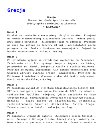 Grecja Grecja Śladami św. Pawła Apostoła Narodów (Pielgrzymka samolotowo-autokarowa) 4-12.09.2017 Dzień 1 Przelot na trasie Warszawa – Ateny. Przylot do Aten. Przejazd do hotelu w nadmorskiej miejscowości Loutraki. Krótki postój przy kanale korynckim – zwiedzanie (czas na zdjęcia). Przejazd na mszę św. polową do Kenchry (8 km) – pozostałości portu pożegnania św. Pawła z kontynentem europejskim. Dojazd do hotelu zakwaterowanie. Kolacja, nocleg. Dzień 2 Po śniadaniu wyjazd na całodniową wycieczkę na Peloponez. Zwiedzanie ruin Starożytnego Koryntu (Agora, na której przemawiał św. Paweł, świątynia Apolla i studnia Peirene). Przejazd do Myken, zwiedzanie ruin pałacu królewskiego oraz Skarbca Atruszy zwanego Grobem Agamemnona. Przejazd do Epidauros i zwiedzanie słynnego z akustyki teatru antycznego. Powrót do hotelu Kolacja Nocleg. Dzień 3 Po śniadaniu wyjazd do klasztoru błogosławionego Łukasza (XIXII w.) następnie przez masyw Parnasu do DELF, zwiedzanie: sanktuarium Apollina, miejsce, gdzie zasiadała na swym trójnogu Pytia, najważniejsza wyrocznia w starożytnym świecie, Omfalos – pępek świata wg starożytnych, znakomicie zrekonstruowany Skarbiec Ateńczyków, Święta Zakwaterowanie w hotelu. Kolacja, nocleg. Droga. Dzień 4 Po śniadaniu wyjazd do Salonik. Zwiedzanie miasta Salonik – m.in. Górnego i Dolnego Miasta, Białej Wieży, katedry św. Demetriusza – patrona miasta. Msza św. Zakwaterowanie w hotelu, kolacja. Nocleg. Dzień 5 Po śniadaniu wyjazd na całodniową wycieczkę do Phillipi i Kawali. W Philippi św. Paweł ochrzcił pierwszą osobę na kontynencie europejskim – św. Lidię. Zwiedzanie tego miejsca oraz ruin starożytnego miasta i więzienia, w którym św. Pawła przetrzymywano 2 dni. Następnie zwiedzanie miasta portowego Kawala, do którego św. Paweł przypłynął podczas swej pierwszej podróży do Grecji. W godzinach popołudniowych wyjazd do Kalambaki. Zakwaterowanie w hotelu. Kolacja i nocleg. Dzień 6 Po śniadaniu zwiedzanie słynne klasztory na skałach tzw. Meteory pochodzące z XII-XIV w. (zwiedzanie 2 klasztorów i wizyta w pracowni ikon.). Wyjazd do Aten, po drodze przystanek w Termopilach – miejscu słynnej bitwy pod Termopilami. Kolacja i nocleg w hotelu w Atenach. Dzień 7 Po śniadaniu zwiedzanie miasta: Akropol ze słynną świątynią Ateny (Partenon), Areopag (miejsce spotkania św. Pawła z uczonymi ateńskimi), świątynie bizantyjskie, Parlament ze zmianą warty, spacer po dzielnicy Plaka – stare miasto. Powrót do hotelu. Kolacja, nocleg. Dzień 8 Śniadanie. Całodniowy rejs na wyspę Egina. Powrót do hotelu. Kolacja, nocleg Dzień 9 Śniadanie. Transfer na lotnisko. Wylot do Warszawy. Świadczenia: bilety samolotowe autokar na całej trasie wg programu + transfery z i na lotnisko 8 noclegów w hotelach 3*, pokoje 2-, 3-osobowe z łazienkami 8 śniadań typu bufet, 8 obiadokolacji pilot i przewodnik na terenie Grecji przewodnicy lokalni z licencją na wymaganych obiektach historycznych codzienna msza św. opieka duchowa kapłana rejs na wyspę Egina (w tym autokar, bilety promowe, objazd i zwiedzanie wyspy, obiad) Cena nie obejmuje: dopłaty do pokoju jednoosobowego (190 EUR) napiwków w hotelach, dla kierowców i pilota (40 EUR) biletów wstępu na tereny archeologiczne (80 EUR) wydatków osobistych Ważne informacje: organizator zastrzega sobie prawo zmiany kolejności zwiedzania w zależności od: pogody, kondycji uczestników oraz godzin otwarcia obiektów cena wyjazdu zawiera składkę do Turystycznego Funduszu Gwarancyjnego