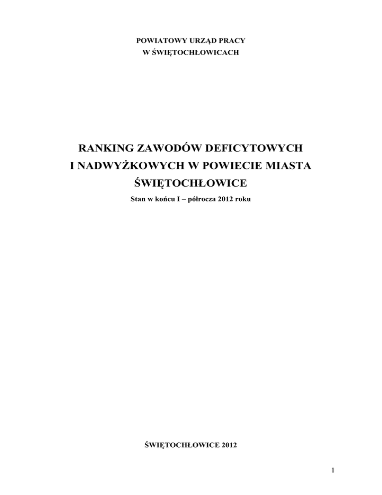 POWIATOWY URZĄD PRACY W ŚWIĘTOCHŁOWICACH RANKING ZAWODÓW DEFICYTOWYCH I NADWYŻKOWYCH W POWIECIE MIASTA ŚWIĘTOCHŁOWICE Stan w końcu I – półrocza 2012 roku ŚWIĘTOCHŁOWICE 2012 1 SPIS TREŚCI I. WSTĘP II. CHARAKTERYSTYKA BEZROBOCIA W ŚWIĘTOCHŁOWICACH III. ANALIZA ZAWODÓW OSÓB BEZROBOTNYCH ZAREJESTROWANYCH W POWIATOWYM URZĘDZIE PRACY W ŚWIĘTOCHŁOWICACH W 2012r. IV. ANALIZA ZGŁASZANYCH OFERT PRACY W 2012r. V. ZESTAWIENIE ZAWODÓW DEFICYTOWYCH I NADWYŻKOWYCH. VI. PODSUMOWANIE SPIS TABEL TABELA 1: Wybrane kategorie osób bezrobotnych wg stanu na dzień 01.07.2012 r. TABELA 2: Bezrobotni wg zawodów w powiecie m. Świętochłowice. Stan w końcu I - półrocza 2012 roku TABELA 3: Bezrobotni absolwenci wg zawodów w powiecie m. Świętochłowice. Stan w końcu I - półrocza 2012 roku TABELA 4: Bezrobotni zarejestrowani powyżej 12 m-cy wg zawodów w powiecie m. Świętochłowice. Stan w końcu I - półrocza 2012 roku TABELA 5: Oferty pracy wg zawodów w powiecie m. Świętochłowice. Stan w końcu I - półrocza 2012 roku TABELA 6: Zawody deficytowe TABELA 7: Zawody zrównoważone TABELA 8: Zawody nadwyżkowe SPIS WYKRESÓW Wykres nr 1 - Stopa bezrobocia w Świętochłowicach w latach 2002-2012 Wykres nr 2 - Stopa bezrobocia w powiecie w roku 2012 ( styczeń – lipiec ) Wykres nr 3 – Bezrobotni zarejestrowani w roku 2012 ( styczeń – lipiec ) Wykres nr 4 – Bezrobotni do 25 roku życia w roku 2012 ( styczeń – sierpień ) Wykres nr 5 – Bezrobotni powyżej 50 roku życia w roku 2012 ( styczeń – sierpień ) 2 I. WSTĘP „Monitoring zawodów deficytowych i nadwyżkowych” to proces systematycznego obserwowania zjawisk zachodzących na rynku pracy dotyczących kształtowania popytu na pracę i podaży zasobów w przekroju terytorialno – zawodowym oraz formułowanie na tej podstawie ocen, wniosków i krótkookresowych prognoz niezbędnych do prawidłowego funkcjonowania systemów szkolenia bezrobotnych oraz kształcenia zawodowego. Głównymi założeniami monitoringu zawodów jest opracowanie możliwych do wykorzystania w praktyce informacji, w efekcie których możliwe będzie w szczególności m.in. określenie kierunków i natężeń zmian zachodzących w strukturze zawodowo – kwalifikacyjnej na lokalnym rynku pracy; stworzenie bazy informacyjnej dla opracowania przyszłych struktur zawodowo – kwalifikacyjnych w układzie lokalnym; określenie odpowiednich kierunków szkoleń bezrobotnych, zapewniając większą efektywność organizowanych kursów; bieżąca korekta poziomu, struktury i treści kształcenia zawodowego ( dotyczy władz oświatowych oraz dyrekcji szkół). Źródłem informacji niezbędnych do prowadzenia monitoringu zawodów nadwyżkowych i deficytowych jest zbiór zawodów i specjalności zarejestrowanych osób oraz ofert pracy. Niniejszy raport zawiera analizę skali i struktury bezrobocia rejestrowanego w Świętochłowicach w grupach i zawodach oraz popytu na pracę dla poszczególnych zawodów z punktu widzenia zgłaszanych do Powiatowego Urzędu Pracy ofert zatrudnienia. Bada także zawody wykazujące deficytowość lub nadwyżkę pracowników. Celem opracowania jest przedstawienie głównych parametrów, które charakteryzują rynek pracy Świętochłowic. Dane dotyczące bezrobocia oraz ofert pracy według zawodów mogą posłużyć jako źródło informacji między innymi do: - określania kierunków szkoleń dla osób bezrobotnych, - planowania działań w zakresie przeciwdziałania bezrobociu, - podnoszenia jakości poradnictwa zawodowego, - podnoszenia jakości pośrednictwa pracy, - opracowania strategii rozwoju miasta. Zakłada się, że głównymi użytkownikami informacji wynikowych monitoringu zawodów deficytowych i nadwyżkowych będą wszystkie podmioty i partnerzy lokalnego rynku pracy. 3 II. CHARAKTERYSTYKA BEZROBOCIA W ŚWIĘTOCHŁOWICACH Bezrobocie stanowi jeden z najtrudniejszych problemów społeczno-gospodarczych i aby móc je właściwe scharakteryzować na lokalnym rynku pracy na wstępie należy przywołać jego definicję. Bezrobocie w literaturze przedmiotu definiowane jest jako zjawisko gospodarcze polegające na tym, iż pewna część społeczeństwa znajdująca się w wieku produkcyjnym nie może znaleźć pracy pomimo podjęcia poszukiwań. Przyczyn bezrobocia na lokalnym rynku pracy jest wiele. Jako główne wymienić należy recesję ekonomiczną, a także wprowadzenie nowych technologii „oszczędzających” pracę ludzką, niedostosowanie kwalifikacji osób zarejestrowanych do tych technologii, restrukturyzacja przemysłu, zmiany w organizacji pracy, ograniczenie produkcji, likwidacja niektórych gałęzi przemysłu, trudności mieszkaniowe, przenoszenie zakładów pracy do innego regionu. Wykres nr 1 - Stopa bezrobocia w Świętochłowicach w latach 2002-2012 Źródło: opracowanie własne (dane GUS) Na podstawie wykresu nr 1 można wysunąć wniosek, że bezrobocie na lokalnym rynku pracy, generalnie utrzymuje się na stosunkowo wysokim poziomie (w stosunku do średniego poziomu bezrobocia w Polsce). Największy jego wzrost przypada na lata 2002 – 2004, kiedy to na lokalnym rynku pracy pojawili się absolwenci roczników wyżu demograficznego. Lata 2007 – 2009 to napływ dużej ilości środków Europejskiego Funduszu Społecznego i idące za tym zakrojone na szeroką skalę działania aktywizacyjne. Lata 2009 do nadal to ogólny kryzys na rynkach 4 finansowych, recesja i zapaść gospodarcza, która w sposób bezpośredni przełożyła się na sytuację na krajowym i lokalnym rynku pracy. Wykres nr 2 - Stopa bezrobocia (wykres porównawczy). Źródło: opracowanie własne (dane GUS) Wykres nr 3 – Stopa bezrobocia w powiecie. Źródło: opracowanie własne na podstawie sprawozdania o rynku pracy MPiPS – 01 5 Wykres nr 4 – Bezrobotni do 25 roku życia. Źródło: opracowanie własne na podstawie sprawozdania o rynku pracy MPiPS – 01 Wykres nr 5 – Bezrobotni powyżej 50 rok