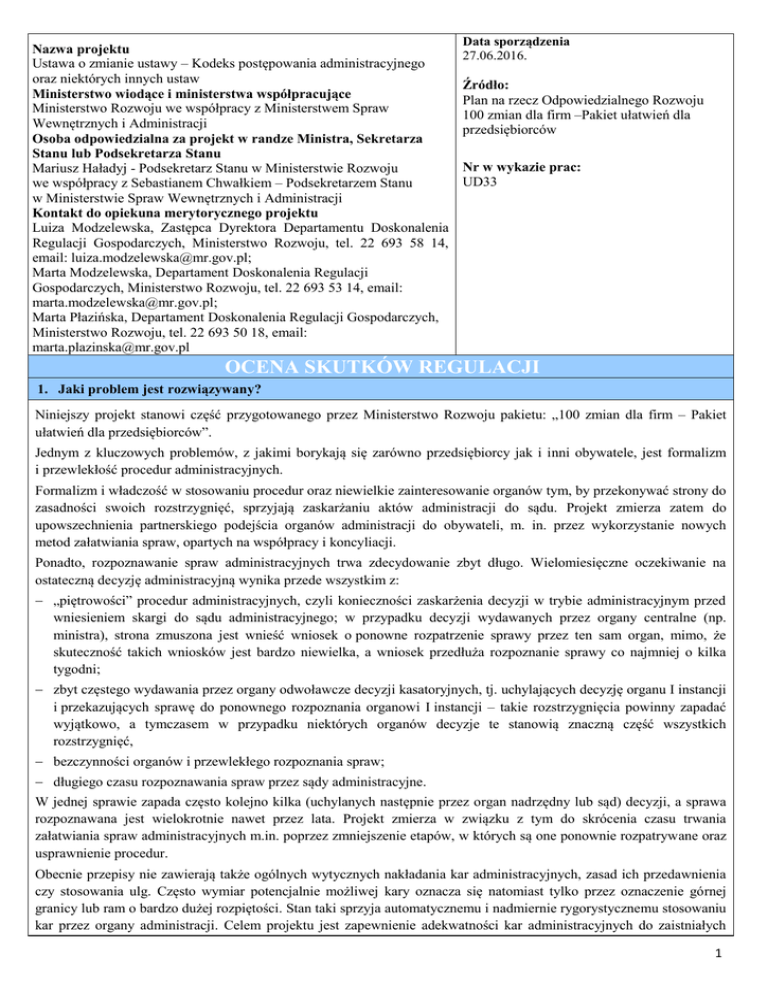Nazwa projektu Ustawa o zmianie ustawy – Kodeks postępowania administracyjnego oraz niektórych innych ustaw Ministerstwo wiodące i ministerstwa współpracujące Ministerstwo Rozwoju we współpracy z Ministerstwem Spraw Wewnętrznych i Administracji Osoba odpowiedzialna za projekt w randze Ministra, Sekretarza Stanu lub Podsekretarza Stanu Mariusz Haładyj - Podsekretarz Stanu w Ministerstwie Rozwoju we współpracy z Sebastianem Chwałkiem – Podsekretarzem Stanu w Ministerstwie Spraw Wewnętrznych i Administracji Kontakt do opiekuna merytorycznego projektu Luiza Modzelewska, Zastępca Dyrektora Departamentu Doskonalenia Regulacji Gospodarczych, Ministerstwo Rozwoju, tel. 22 693 58 14, email: [email protected]; Marta Modzelewska, Departament Doskonalenia Regulacji Gospodarczych, Ministerstwo Rozwoju, tel. 22 693 53 14, email: [email protected]; Marta Płazińska, Departament Doskonalenia Regulacji Gospodarczych, Ministerstwo Rozwoju, tel. 22 693 50 18, email: [email protected] Data sporządzenia 27.06.2016. Źródło: Plan na rzecz Odpowiedzialnego Rozwoju 100 zmian dla firm –Pakiet ułatwień dla przedsiębiorców Nr w wykazie prac: UD33 OCENA SKUTKÓW REGULACJI 1. Jaki problem jest rozwiązywany? Niniejszy projekt stanowi część przygotowanego przez Ministerstwo Rozwoju pakietu: „100 zmian dla firm – Pakiet ułatwień dla przedsiębiorców”. Jednym z kluczowych problemów, z jakimi borykają się zarówno przedsiębiorcy jak i inni obywatele, jest formalizm i przewlekłość procedur administracyjnych. Formalizm i władczość w stosowaniu procedur oraz niewielkie zainteresowanie organów tym, by przekonywać strony do zasadności swoich rozstrzygnięć, sprzyjają zaskarżaniu aktów administracji do sądu. Projekt zmierza zatem do upowszechnienia partnerskiego podejścia organów administracji do obywateli, m. in. przez wykorzystanie nowych metod załatwiania spraw, opartych na współpracy i koncyliacji. Ponadto, rozpoznawanie spraw administracyjnych trwa zdecydowanie zbyt długo. Wielomiesięczne oczekiwanie na ostateczną decyzję administracyjną wynika przede wszystkim z: „piętrowości” procedur administracyjnych, czyli konieczności zaskarżenia decyzji w trybie administracyjnym przed wniesieniem skargi do sądu administracyjnego; w przypadku decyzji wydawanych przez organy centralne (np. ministra), strona zmuszona jest wnieść wniosek o ponowne rozpatrzenie sprawy przez ten sam organ, mimo, że skuteczność takich wniosków jest bardzo niewielka, a wniosek przedłuża rozpoznanie sprawy co najmniej o kilka tygodni; zbyt częstego wydawania przez organy odwoławcze decyzji kasatoryjnych, tj. uchylających decyzję organu I instancji i przekazujących sprawę do ponownego rozpoznania organowi I instancji – takie rozstrzygnięcia powinny zapadać wyjątkowo, a tymczasem w przypadku niektórych organów decyzje te stanowią znaczną część wszystkich rozstrzygnięć, bezczynności organów i przewlekłego rozpoznania spraw; długiego czasu rozpoznawania spraw przez sądy administracyjne. W jednej sprawie zapada często kolejno kilka (uchylanych następnie przez organ nadrzędny lub sąd) decyzji, a sprawa rozpoznawana jest wielokrotnie nawet przez lata. Projekt zmierza w związku z tym do skrócenia czasu trwania załatwiania spraw administracyjnych m.in. poprzez zmniejszenie etapów, w których są one ponownie rozpatrywane oraz usprawnienie procedur. Obecnie przepisy nie zawierają także ogólnych wytycznych nakładania kar administracyjnych, zasad ich przedawnienia czy stosowania ulg. Często wymiar potencjalnie możliwej kary oznacza się natomiast tylko przez oznaczenie górnej granicy lub ram o bardzo dużej rozpiętości. Stan taki sprzyja automatycznemu i nadmiernie rygorystycznemu stosowaniu kar przez organy administracji. Celem projektu jest zapewnienie adekwatności kar administracyjnych do zaistniałych 1 naruszeń. 2. Rekomendowane rozwiązanie, w tym planowane narzędzia interwencji, i oczekiwany efekt I. W celu upowszechnienia partnerskiego podejścia administracji do obywateli i współpracy między organami proponuje się, po pierwsze, wprowadzenie ogólnych zasad: rozstrzygania wątpliwości faktycznych i prawnych na korzyść strony, dążenia przez organy do polubownego załatwienia sprawy (np. przy wykorzystywaniu mediacji), podejmowania przez organ tylko działań proporcjonalnych do celu, a także zasad równości stron, bezstronności organu i efektywnego współdziałania organów. Ponadto, projekt zakłada następujące rozwiązania zmierzającego do ograniczenia nadmiernego formalizmu i władczości postępowania: 1) wprowadzenie obowiązku poinformowania strony o niespełnieniu warunków do uwzględnienia jej żądania przed wydaniem decyzji odmownej – celem umożliwienia uzupełnienia tych braków przez stronę, 2) wprowadzenie możliwości wykorzystania mediacji w administracji (między stronami o spornych interesach bądź między organem a stroną) oraz zwiększenie efektywności postępowania mediacyjnego w postępowaniu sądowoadministracyjnym, 3) złagodzenie przesłanek zawarcia przez strony ugody przed organem; 4) wprowadzenie umowy administracyjnej jako alternatywnego sposobu rozstrzygania spraw; 5) wprowadzenie możliwości dokonania uzgodnień przez różne organy w czasie wspólnego posiedzenia oraz zasad współpracy z europejskimi organami administracji. II. W obszarze usprawnienia i przyspieszenia procedur proponuje się natomiast wprowadzenie następujących rozwiązań: 1) usunięcie wniosku o ponowne rozpatrzenie sprawy (co dot. decyzji wydawanych przez ministrów lub samorządowe kolegia odwoławcze); 2) umożliwienie likwidacji II instancji w sprawach, w których jest ona nieefektywna, 3) zaostrzenie przesłanek umożliwiających wydanie decyzji kasatoryjnej oraz możliwość zaskarżenia takiej decyzji do WSA w przyspieszonej procedurze, z możliwością wymierzenia organowi grzywny, jeśli nie zaist