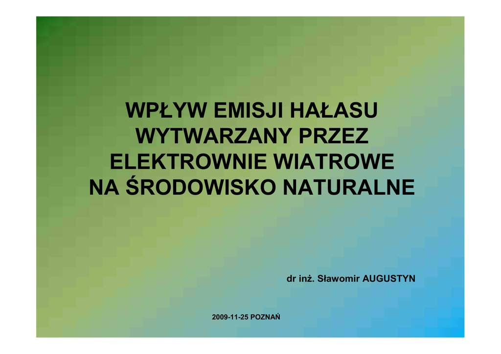 WPŁYW EMISJI HAŁASU WYTWARZANY PRZEZ ELEKTROWNIE WIATROWE NA ŚRODOWISKO NATURALNE dr inŜ. Sławomir AUGUSTYN 2009-11-25 POZNAŃ EMISJA HAŁAS NiepoŜądane, nieprzyjemne, dokuczliwe, uciąŜliwe lub szkodliwe drgania akustyczne działające za pośrednictwem powietrza na narząd słuchu i inne zmysły człowieka. Ucho ludzkie odbiera zmiany ciśnienia ośrodka spręŜystego powodowane rozchodzeniem się fal akustycznych o częstotliwości od 20 Hz do 16 000 Hz Hałas jest zjawiskiem wszechobecnym w środowisku człowieka – produktem ubocznym cywilizacji. GRANICA LUDZKIEJ WYTRZYMAŁOŚCI 170 dB WIERTARKA UDAROWA 120 dB PRZEJAZD POCIĄGU, DŹWIĘK BUDZIKA 100 dB INTENSYWNY RUCH ULICZNY 80 – 90 dB WNĘTRZE FIATA 126 P 75 – 89 dB ROZMOWA DWOJGA LUDZI 60 dB SZUM MORZA 41 – 50 dB KAPIĄCY KRAN 35 dB ZUM DRZEW 20 dB CICHY SZEPT, SZELEST LIŚCI 10 dB Polskie prawo Ustawa z dnia 27.04.2001 r. Prawo ochrony środowiska, art. 117 (Dz. U. Nr 62 poz. 627 z późn. zmianami) Rozporządzenie MŚ z dnia 14.06.2007 r. w sprawie dopuszczalnych poziomów hałasu w środowisku (Dz. U. Nr 120, poz. 826) Rodzaj terenu Lp. 1 2 3 4 a) b) a) Strefa ochronna „A” uzdrowiska Tereny szpitali poza miastem Tereny zabudowy mieszkaniowej jednorodzinnej, b) Tereny zabudowy związanej ze stałym lub wielogodzinnym pobytem dzieci i młodzieŜy, c) Tereny domów opieki społecznej, d) Tereny szpitali w miastach a) Tereny zabudowy mieszkaniowej wielorodzinnej i zamieszkania zbiorowego, b) Tereny zabudowy zagrodowej, c) Tereny rekreacyjno wypoczynkowe, d) Tereny mieszkaniowo - usługowe Tereny w strefie śródmiejskiej miast powyŜej 100 tyś. mieszkańców ze zwartą zabudową mieszkaniową i koncentracją obiektów administracji, handlowych i usługowych Dopuszczalny poziom hałasu w [dB] Drogi lub linie kolejowe (wartości odnoszą się takŜe dla torowisk Pozostałe obiekty i działalność będąca tramwajowych poza pasem źródłem hałasu drogowym i kolei linowych) LAeq d LAeq d LAeq d LAeq N przedział czasu przedział czasu przedział czasu przedział czasu odniesienia równy odniesienia równy odniesienia odniesienia 8 najmniej korzystnym 1 najmniej równy równy godzinom dnia kolejno korzystnej godzinie 16 godzinom 8 godzinom po sobie następującym nocy 50 45 45 40 55 50 50 40 60 50 55 45 65 55 55 45 dla zabudowy zagrodowej • LAeqD - przedział czasu odniesienia równy 8 najmniej korzystnym godzinom dnia kolejno po sobie następującym 55 dB • LAeqN – przedział czasu odniesienia równy 1 najmniej korzystnej godzinie nocy - 45 dB Turbina o mocy 2 MW emituje hałas na poziomie 105,6 dB (hałas w źródle, na wysokości 100m) odległość 100m – 52,5 dB odległość 200m – 47,7 dB odległość 300m – 44,8 dB odległość 400m – 42,8 dB odległość 500 m – 41,3 dB Praca elektrowni wiatrowych posadowionych w odległości kilkuset metrów od domostw i zabudowań gospodarskich nie jest w ogóle słyszalna, z uwagi na to, Ŝe dźwięk emitowany przez obracające się śmigła jest pochłaniany przez otoczenie (szum wiatru w drzewach i roślinach, tzw. „hałas otoczenia”) drgania akustyczne poniŜej 20 Hz to infradźwięki powyŜej 16 000 Hz to ultradźwięki INFRADŹWIĘKI Generowany poziom dźwięków w zakresie infradźwięków leŜy daleko poniŜej progu słyszalności ludzkiego ucha, a zatem nie niesie za sobą jakiegokolwiek niebezpieczeństwa dla zdrowia. Naturalne źródła infradźwięków: fale morskie, wiatr Źródła infradźwięków w Ŝyciu codziennym: - instalacje grzewcze - klimatyzacje - spręŜarki - wysokie budynki, tunele, mosty - środki transportu Wpływ infradźwięków na zdrowie Wyniki badań i praktyki Schemat według: Stowarzyszenia Mechaniki Precyzyjnej i Elektroniki bardzo niebezpieczne niebezpieczne samochód osobowy z otwartym oknem samochód cięŜarowy z silnikiem Diesla Próg słyszalności człowieka (20Hz) brak negatywnego wpływu na zdrowie pomiar przy elektrowni wiatrowej (E-40) Częstotliwość (Hz) POMIAR INFRADŹWIĘKÓW Źródło: KÖTTER Consulting Engineers GmbH WKA wł. WKA wył. Próg słyszalności/ Środkowa częstotliwość tercji (Hz) Podczas pomiaru emisji dźwięków o niskiej częstotliwości w odległości 600 metrów od elektrowni wiatrowej E-40, nie odnotowano Ŝadnych 2009-06-30 wytworzonych przez elektrownię wiatrową infradźwięków. Emisja hałasu wytwarzana przez elektrownie wiatrowe, nie wpływa ujemnie na egzystencję ludzi i zwierząt. PORÓWNANIE Farma wiatrowa w okolicach Dygowa Farma wiatrowa koło Kiślewic o mocy ponad 40 MW, woj. warmińsko-mazurskie CZY … Kopalnia Węgla Brunatnego w Bełchatowie Odkrywki węgla brunatnego powodują w czasie eksploatacji drastyczne zmiany w środowisku Dziękuję Państwu za uwagę