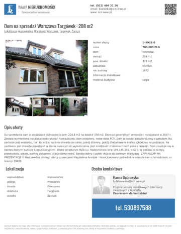 tel. (022) 404 21 20 email: [email protected] www: scn.waw.pl Dom na sprzedaż Warszawa Targówek - 208 m2 Lokalizacja: mazowieckie, Warszawa, Warszawa, Targówek, Zacisze numer oferty D-9931-0 cena 700 000 PLN dom sprzedaż, metraż 208 m2 pow. działki 378 m2 zabudowa bliźniak rok budowy 1972 informacje dodatkowe materiał budynku cegła Opis oferty Do sprzedania dom w zabudowie bliźniaczej o pow. 204,8 m2 na działce 378 m2. Dom po generalnym remoncie i rozbudowie w 2007 r. Została wymieniona instalacja elektryczna i hydrauliczna, dom ocieplony, nowe okna PCV. Dom w całości podpiwniczony z garażem. Na parterze jest wiatrołap, hol. łazienka, kuchnia otwarta na salon, pokój dzienny, pokój. Dobudowana klatka schodowa na poddasze. Na poddaszu jest otwarta przestrzeń w stanie surowym do wykończenia. Jest możliwość zrobienia trzech pokoi i łazienki. Dom znajduje się w bardzo dobrym punkcie komunikacyjnym. Blisko przystanek MZA (ul. Radzymińska linie-199,145,345, N-62 ). W pobliżu są sklepy, przedszkola, szkoła, punkty usługowe, stacja benzynowa. Bardzo dobry i szybki dojazd do centrum Warszawy. ZAPRASZAM NA PREZENTACJE !! Nad jakością obsługi oferty czuwa pani Magdalena Armijak - licencjonowany pośrednik w obrocie nieruchomościami, nr licencji 19420 Lokalizacja Osoba kontaktowa Hanna Dąbrowska województwo mazowieckie powiat Warszawa [email protected] miasto Warszawa dzielnica Targówek osiedle Zacisze Chętnie udzielę dodatkowych informacji związanych z tą ofertą. Zapraszam do kontaktu! tel. 530897588 Zawsze dążymy do tego, aby informacje o proponowanych przez nas ofertach były jak najbardziej dokładne. Niekiedy jednak, ze względu na fakt, iż uzyskujemy je od osób trzecich nie jest możliwe ich zweryfikowanie, wobec czego należy traktować je orientacyjnie i nie stanowią one oferty w rozumieniu kodeksu cywilnego.