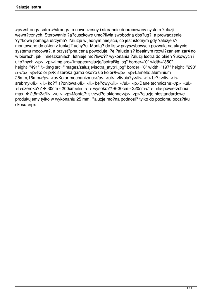 ?aluzje Isotra <p><strong>Isotra </strong> to nowoczesny i starannie dopracowany system ?aluzji wewn?trznych. Sterowanie ?a?cuszkowe umo?liwia swobodna obs?ug?, a prowadzenie ?y?kowe pomaga utrzyma? ?aluzje w jednym miejscu, co jest istotnym gdy ?aluzje s? montowane do okien z funkcj? uchy?u. Monta? do listw przyszybowych pozwala na ukrycie systemu mocowa?, a przyst?pna cena powoduje, ?e ?aluzje s? idealnym rozwi?zaniem zar�no w biurach, jak i mieszkaniach. Istnieje mo?liwo?? wykonania ?aluzji Isotra do okien ?ukowych i uko?nych.</p> <p><img src="images/zaluzje/isotraBig.jpg" border="0" width="350" height="491" /><img src="images/zaluzje/isotra_atyp1.jpg" border="0" width="197" height="290" /></p> <p>Kolor pi�: szeroka gama oko?o 65 kolor�</p> <p>Lamele: aluminium 25mm,16mm</p> <p>Kolor mechanizmu:</p> <ul> <li>bia?y</li> <li> br?z</li> <li> srebrny</li> <li> ko?? s?oniowa</li> <li> be?owy</li> </ul> <p>Dane techniczne:</p> <ul> <li>szeroko?? � 30cm - 200cm</li> <li> wysoko?? � 30cm - 220cm</li> <li> powierzchnia max. � 2,5m2</li> </ul> <p>Monta?: skrzyd?o okienne</p> <p>?aluzje niestandardowe produkujemy tylko w wykonaniu 25 mm. ?aluzje mo?na podnosi? tylko do poziomu pocz?tku skosu.</p> 1/1