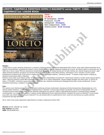 Informacje o produkcie Utworzono 07-03-2017 LORETO -TAJEMNICA ŚWIĘTEGO DOMU Z NAZARETU seria: FAKTY- CUDA -TAJEMNICE kol. LUDZIE BOGA Cena : 21,00 zł .lu bl in .p l Nr katalogowy : 54195 Producent : E-LITE Dostępność : Dostępny Stan magazynowy : niski Średnia ocena : brak recenzji od us Książka : „Święty Dom w Loreto, pierwsze sanktuarium o znaczeniu międzynarodowym poświęcone Najświętszej Maryi Pannie, przez wiele wieków prawdziwe serce Maryjne chrześcijaństwa” powiedział Jan Paweł II o Domu Świętej Rodziny, którego fragmenty znajdują się w Loreto. Jan Paweł II gościł w Loreto pięć razy. W 1993 roku w liście z okazji 700-lecia sanktuarium loretańskiego zaznaczył, że „Święty Domek jest nie tylko relikwią, lecz również drogocenną ikoną”, gdyż odbija wzniosłe przesłanie, począwszy od momentu Wcielenia Słowa Bożego w łonie Maryi Dziewicy. Pochodząca z XV w. bazylika w Loreto została wybudowana na planie krzyża. W jej centrum znajduje się marmurowy bogato zdobiony: „Kamienny Domek”. To właśnie w jego wnętrzu znajdują się kamienne ściany domku Maryi z Nazaretu. W Polsce mamy także nasze własne Loretto. To wieś znajdująca się w województwie mazowieckim. Sanktuarium maryjne w Loretto wzięło swój początek w 1928 r. Wówczas proboszcz parafii MB Loretańskiej w Warszawie, bł. ks. Ignacy Kłopotowski, zakupił majątek Zenówka nad rzeką Liwiec, ok. 60 km od stolicy. 27.03.1929 r. zmieniono nazwę miejscowości na Loretto, aby nawiązać do Sanktuarium Świętego Domku MB w Loreto we Włoszech. W lesie wystawiono drewnianą, a następnie murowaną kapliczkę. ex Film: Film zawiera sceny fabularyzowane, a jego atrakcyjność podnoszą animacje zrealizowane najnowszą techniką komputerową. Wypowiadają się w nim również wybitni naukowcy. „Loreto. Tajemnica Świętego Domu z Nazaretu” to fascynująca podróż w przeszłość, do korzeni chrześcijaństwa. Film Luca Trovolessi Cesana można nazwać dokumentem śledczym próbującym się zmierzyć z jedną z najbardziej fascynujących i kontrowersyjnych zagadek chrześcijaństwa. Czy rzeczywiście, zgodnie z tradycją, domek Najświętszej Panny został przeniesiony z Nazaretu do Loreto we Włoszech? Czy po drodze przez jakiś czas znalazł się w kilku innych miejscach? Czy, jak dowodzi jedna ze współczesnych teorii, został tam przeniesiony po upadku państwa krzyżowców? Jak tego dokonano? Na te i wiele innych pytań odpowiedź znajdą Państwo w książce z dołączonym filmem DVD. Oprawa: format: 145x190, opr. twarda Rok wydania: luty 2016 ISBN: 978-83-65405-00-5 Wygenerowano w programie www.oscGold.com