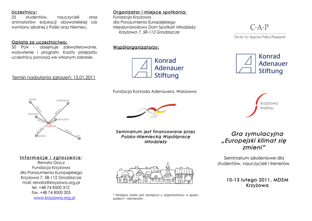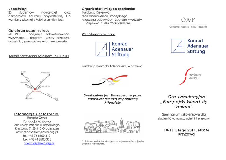 Uczestnicy: 25 studentów, nauczycieli oraz animatorów edukacji obywatelskiej lub wymiany szkolnej z Polski oraz Niemiec. Opłata za uczestnictwo: 50 PLN - obejmuje zakwaterowanie, wyżywienie i program. Koszty przejazdu uczestnicy ponoszą we własnym zakresie. Organizator i miejsce spotkania: Fundacja Krzyżowa dla Porozumienia Europejskiego Międzynarodowy Dom Spotkań Młodzieży Krzyżowa 7, 58-112 Grodziszcze Współorganizatorzy: Termin nadsyłania zgłoszeń: 15.01.2011 Fundacja Konrada Adenauera, Warszawa Seminarium jest finansowane przez Polsko-Niemiecką Współpracę Młodzieży Informacje i zgłoszenia: Renata Grycz Fundacja Krzyżowa dla Porozumienia Europejskiego Krzyżowa 7, 58-112 Grodziszcze mail: [email protected] tel. +48 74 8500 312 fax. +48 74 8500 305 www.krzyzowa.org.pl Gra symulacyjna „Europejski klimat się zmieni” Seminarium szkoleniowe dla studentów, nauczycieli i trenerów 10-13 lutego 2011, MDSM Krzyżowa * Niniejsza ulotka jest dostępna u organizatorów w języku polskim i niemieckim . Program Opis projektu Cele W obliczu wyraźnie zachodzących zmian klimatycznych i nieustannie rosnącego zapotrzebowania na energię, gra symulacyjna „Europejski klimat się zmieni” proponuje konfrontację z tematem zrównoważonego rozwoju w zaopatrywaniu w energię. Gra symulacyjna „Europejski klimat się zmieni” została opracowana na zlecenie Biura Informacyjnego Parlamentu Europejskiego (Przedstawicielstwo w Monachium) przez grupę badawczą „Młodzież i Europa” przy Centrum Stosowanych Badań Politycznych. Gra jest przeznaczona dla młodzieży szkół średnich. Podczas seminarium w Krzyżowej zostaną omówione możliwości i aspekty dostosowania tej gry symulacyjnej do grup polskoniemieckich. W ramach pracy z grą poruszone zostaną takie zagadnienia jak polityka energetyczna UE, struktura i proces ustawodawczy UE, a uczestnicy przejmą rolę jednej z wielu stron w procesie negocjacji. Ich zadaniem będzie przygotowanie się na podstawie wykładu i materiałów pisemnych do wcielenia się w tę rolę, poznając stanowisko i argumenty w przypuszczalnej sytuacji negocjacyjnej. Zasadniczym celem kształcenia jest wspólne przeprowadzenie symulacji oraz wspólne podsumowanie planu gry. • Przeszkolenie na trenerów gry symulacyjnej „Europejski klimat się zmieni”. • Wymiana doświadczeń i doradztwo w zakresie praktycznych oraz organizacyjnych aspektów gry symulacyjnej. • Rozwijanie umiejętności zarządzania projektami wymian szkolnych w aspekcie polsko-niemieckim. Czwartek, 10.02.2011 Do 17.30 Zakwaterowanie 18.00 Kolacja 19.30 Oficjalne otwarcie seminarium, sprawy organizacyjne, zapoznanie się Piątek, 11.02.2011 08.00 Śniadanie 09.00 Krzyżowa dawniej i dziś – oprowadzanie 10.00 Praktyczne aspekty międzynarodowych spotkań młodzieży: dynamika grupy, międzykulturowe uczenie się, praca w międzynarodowym zespole 12.30 Obiad 14.00 Wykład i dyskusja: Podstawowe informacje na temat UE; pogłębienie analizy instytucji po szczycie w Lizbonie; briefing do UE i regularne procesy legislacyjne 18.00 Kolacja 19.30 Rozmowa z pracownikami biura Parlamentu Europejskiego, reprezentacji Komisji Europejskiej Metody Praca podczas seminarium przebiegać będzie w małych grupach, sprzyjających wymianie doświadczeń. Spotkanie wzbogacą zajęcia praktyczne, prezentacje, dyskusje i porady ekspertów. Sobota, 12.02.2011 08.00 Śniadanie 09.00 Poznawanie planu gry w wersji oryginalnej. Symulacja gry „Europejski klimat się zmieni” na żywo Szkolenie i kierowanie symulacj ą : Eva Feldmann-Wojtachnia oraz dr Barbara Tham, grupa badawcza „Młodzież i Europa” przy Centrum Stosowanych Badań Politycznych na Uniwersytecie Ludwiga Maksymiliana w Monachium. 12.30 Obiad 15.00 Pedagogika i dydaktyka gry symulacyjnej. Metody ewaluacji warsztatów oraz rozgrzewek. Doświadczenie z grą symulacyjną MICC w Krzyżowej w grupach międzynarodowych 18.30 Kolacja 19.30 Ciąg dalszy symulacji Niedziela, 13.02.2011 Do wzięcia udziału w seminarium zapraszamy serdecznie przyszłych trenerów, którzy są zainteresowani tym tematem oraz możliwością przeprowadzenia gry symulacyjnej w szkołach. Podczas seminarium zapewniamy tłumaczenie symultaniczne. 08.00 Śniadanie 09.00 Podsumowanie i ewaluacja seminarium. Widoki na dalszą współpracę. 12.30 Obiad 13.00 Odjazd uczestników