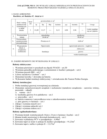 ZAŁĄCZNIK NR 11 DO WYKAZU LOKALI MIESZKALNYCH PRZEZNACZONYCH DO REMONTU PRZEZ PRZYSZŁEGO NAJEMCĘ Z DNIA 01.04.2015r. I. DANE ADRESOWE: Racibórz, ul. Rudzka 47, lokal nr 4 1. 2. 3. 4. Ilość i rodzaj pomieszczeń wchodzących w skład lokalu Ilość izb 3 powierzchnia w m2 Ip. IIp. IIIp. kuchnia p.p. łazienka 21,09 13,37 ---- 8,13 4,90 2,96 Powierzchnia lokalu Powierzchnia pomieszczenia przynależnego Wyposażenie lokalu w urządzenia techniczne wc --- Uwagi: Lokal znajduje się na I piętrze mieszkalna 34,46 m2 użytkowa 50,45 m2 Piwnica nr 4 4,68 m2 Ogrzewanie ogrzewanie piecowe - węglowe elektryczna Instalacje gazowa wodno-kanalizacyjna II. ZAKRES REMONTU DO WYKONANIA W LOKALU: Roboty elektryczne: 1. 2. 3. 4. 5. 6. Wymiana pierścieni w puszkach na złączki WAGO – szt.30 Wymiana gniazdka podwójnego z uziemieniem w kuchni i pokojach – szt.6 Wymiana puszek Ø60 – szt.5 Listwa zaciskowa 12x4mm2 – szt.1 Demontaż korytka + dzwonka na baterie. Wykonanie badań instalacji elektrycznej + oświadczenie dla Tauron Polska Energia. Roboty instalacyjne: Próba instalacji gazowej wewnętrznej na ciśnienie. Demontaż zamortyzowanych urządzeń i ruchomości (metalowe urządzenia – surowiec wtórny, pozostałe – odpad): a) wanna – szt.1 b) kuchenka gazowa 4-ro palnikowa – szt.1 c) umywalka – szt.1 d) bateria wannowa i umywalkowa wraz z zakorkowaniem instalacji. e) piec gazowy w łazience – szt.1 3. Zakup i wymiana muszli szt.1 4. Zakup i wymiana spłuczki szt.1 5. Zakup i wymiana sedesu szt.1 1. 2. Roboty ogólnobudowlane: 1. Wymiana kratek wentylacyjnych 14cm x 21cm w łazience i kuchni – szt.2 2. Montaż kratki nawiewnej w drzwiach łazienkowych – szt.1 3. Zerwanie wykładziny PCV w przedpokoju ~ 4,90m2 4. Zerwanie tapet ze ścian w pokoju II, kuchni i przedpokoju ~ 91,23m2 5. Zerwanie tapet z sufitu w pokoju II ~ 13,37m2 6. Skucie płytek ceramicznych ze ścian w łazience ~ 10,24m2 7. Uzupełnienie tynku na ścianach w łazience (po skutych płytkach ceramicznych) ~ 10,24m2 8. Przygotowanie powierzchni ścian i sufitów pod malowanie farbami emulsyjnymi starych tynków z poszpachlowaniem nierówności ~ 210,32m2 9. Dwukrotne malowanie farbami emulsyjnymi starych tynków wewnętrznych sufitów ~ 50,45m2 10. Dwukrotne malowanie farbami emulsyjnymi starych tynków wewnętrznych ścian ~ 149,63m2 11. Dwukrotne malowanie farbami olejnymi starych tynków wewnętrznych ścian w łazience (do wys. 1,50m)~ 10,24m2 12. Ułożenie wykładziny PCV w kuchni, przedpokoju i pokojach wraz z listwami przypodłogowymi ~ 47,49m2 13. Jednokrotne malowanie farbą olejną uprzednio malowanej stolarki drzwiowej wraz z ościeżnicami szt.5 14. Dwukrotne malowanie farbą olejną rur wodociągowych, gazowych ~ 14,00m 15. Dwukrotne malowanie farbą olejną rur żeliwnych kanalizacyjnych ~ 2,80m 16. Uzupełnienie klamek w drzwiach do kuchni – kpl.1 17. Zakup i montaż trzonu kuchennego węglowego przenośnego w komplecie: rura spalinowa, rozeta oraz blacha przedpiecowa – szt.1 III. TERMIN WYKONANIA REMONTU: 2 miesiące IV. WARUNKI FINANSOWE: 1. Remontujący wykona remont lokalu we własnym zakresie na własny koszt, a po zakończeniu najmu zobowiązany będzie do zdania lokalu mieszkalnego w stanie nie pogorszonym od stanu określonego w protokole przekazania lokalu. 2. Remontujący nie jest zobowiązany do uiszczenia kaucji mieszkaniowej. 3. W okresie wykonywania remontu Remontujący, z którym zostanie zawarta umowa najmu lokalu nie uiszcza czynszu, zobowiązany będzie wyłącznie do uiszczania opłat niezależnych od Wynajmującego z tytułu: a) gospodarowania odpadami komunalnymi, b) za dostawę do lokalu energii elektrycznej, c) za dostawę do lokalu energii cieplnej, d) za dostawę do lokalu gazu, e) za dostawę do lokalu wody oraz odbiór ścieków. 4. Remontujący zawrze umowę z: a) Zakładem Energetycznym na dostarczanie energii elektrycznej b) Zakładem Wodociągów i Kanalizacji Sp. z o.o. w Raciborzu umowę na dostarczenie i rozliczenie wody oraz odprowadzenie ścieków, c) Zakładem Gazowniczym na dostarczanie gazu 5. W razie rezygnacji z lokalu w czasie wykonywania remontu, lub po jego zakończeniu, a także po zakończeniu umowy najmu, Remontujący nie ma prawa żądać zwrotu kosztów przeprowadzonego remontu. V. PODSTAWA WYKONANIA REMONTU I ODBIORU ROBÓT: 1. Podstawą wykonania robót będzie umowa najmu lokalu mieszkalnego. 2. Przekazanie lokalu do remontu nastąpi protokolarnie. 3. Odbiór wszystkich robót, o których mowa w pkt. II Wynajmujący odbierze od Remontującego w formie protokolarnej. VI. OGÓLNE WARUNKI TECHNICZNE WYKONANIA REMONTU: 1. Szczegółowe warunki wykonania remontu określone zostaną w załączniku do umowy najmu. 2. Roboty budowlane w tym elektryczne i instalacyjne należy wykonać zgodnie z przepisami prawa budowlanego oraz warunkami zawartymi w Rozporządzeniu Ministra Infrastruktury z dnia 12 kwietnia 2002 r. w sprawie warunków technicznych, jakim powinny odpowiadać budynki ich usytuowania. 3. Wynajmujący zastrzega sobie, aby specjalistyczne roboty remontowe wykonywały podmioty posiadające wymagane uprawnienia. 4. Zastosowane materiały budowlane powinny posiadać atesty oraz aktualne aprobaty techniczne, dopuszczające je do stosowania w budownictwie mieszkaniowym. 5. W trakcie wykonywania prac zabrania się naruszania elementów konstrukcyjnych budynku oraz dokonywania jakichkolwiek zmian w istniejącym systemie przewodów spalinowych, dymowych i wentylacyjnych. 6. Bez zgody wynajmującego remontujący nie może rozpocząć robót remontowych ingerujących w części wspólne nieruchomości. 7. Wszelkie prace dotyczące przewodów wentylacyjnych i spalinowych należy uzgadniać z Mistrzem Kominiarskim. 8. Remontujący zobowiązuje się usunąć wszystkie usterki zauważone w trakcie robót, które uniemożliwiają uznanie prac za zgodne z przepisami. Termin usunięcia wad ustalają strony w zależności od potrzeb. 9. Całość p