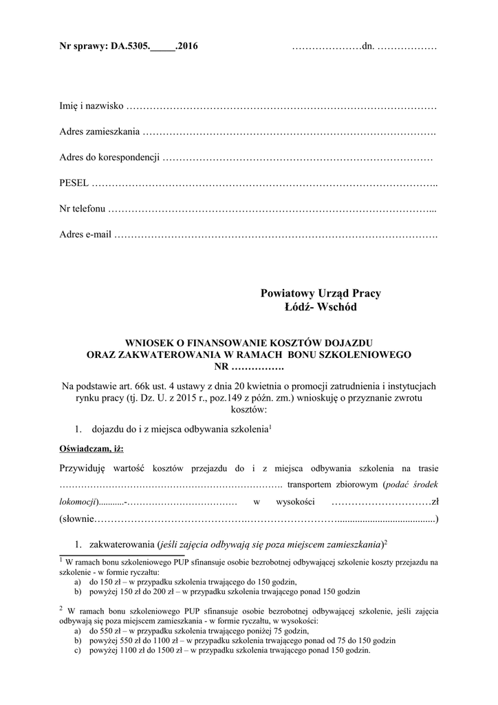 Nr sprawy: DA.5305._____.2016 …………………dn. ……………… Imię i nazwisko ………………………………………………………………………………… Adres zamieszkania ……………………………………………………………………………. Adres do korespondencji ……………………………………………………………………… PESEL ………………………………………………………………………………………….. Nr telefonu ……………………………………………………………………………………... Adres e-mail ……………………………………………………………………………………. Powiatowy Urząd Pracy Łódź- Wschód WNIOSEK O FINANSOWANIE KOSZTÓW DOJAZDU ORAZ ZAKWATEROWANIA W RAMACH BONU SZKOLENIOWEGO NR ……………. Na podstawie art. 66k ust. 4 ustawy z dnia 20 kwietnia o promocji zatrudnienia i instytucjach rynku pracy (tj. Dz. U. z 2015 r., poz.149 z późn. zm.) wnioskuję o przyznanie zwrotu kosztów: 1. dojazdu do i z miejsca odbywania szkolenia1 Oświadczam, iż: Przywiduję wartość kosztów przejazdu do i z miejsca odbywania szkolenia na trasie ………………………………………………………………. transportem zbiorowym (podać środek lokomocji)...........-……………………………… w wysokości …………………………zł (słownie……………………………………….……………………….......................................) 1. zakwaterowania (jeśli zajęcia odbywają się poza miejscem zamieszkania)2 1 W ramach bonu szkoleniowego PUP sfinansuje osobie bezrobotnej odbywającej szkolenie koszty przejazdu na szkolenie - w formie ryczałtu: a) do 150 zł – w przypadku szkolenia trwającego do 150 godzin, b) powyżej 150 zł do 200 zł – w przypadku szkolenia trwającego ponad 150 godzin 2 W ramach bonu szkoleniowego PUP sfinansuje osobie bezrobotnej odbywającej szkolenie, jeśli zajęcia odbywają się poza miejscem zamieszkania - w formie ryczałtu, w wysokości: a) do 550 zł – w przypadku szkolenia trwającego poniżej 75 godzin, b) powyżej 550 zł do 1100 zł – w przypadku szkolenia trwającego ponad od 75 do 150 godzin c) powyżej 1100 zł do 1500 zł – w przypadku szkolenia trwającego ponad 150 godzin. Oświadczam, iż: Przywiduję wartość kosztów zakwaterowania (podać miejsce zakwaterowania) ………………………………………………………………………………………………………… w wysokości ……………………………………………………..…………………………zł (słownie……………………………………….………………………......................................). …..………………………………. data i czytelny podpis bezrobotnego Postanawiam przyznać koszty: 1. przejazdu do miejsca odbywania szkolenia i z powrotem - w formie ryczałtu w wysokości ………………………………………………….………… zł (słownie …………………………………………………………………………..). 2. zakwaterowania w wysokości ……………….… zł (słownie ……………………….... ……………………………………………………....) miesięcznie. ……………………………………………. data i podpis Dyrektora PUP Łódź-Wschód * niepotrzebne skreślić Potwierdzam otrzymanie informacji o wysokości zwrotu przez PUP Łódź-Wschód kosztów przejazdu na szkolenia i zakwaterowania* …..………………………………. data i czytelny podpis bezrobotnego * niepotrzebne skreślić Łączne koszty finansowane bezrobotnemu w ramach bonu szkoleniowego, na które składają się: koszty szkolenia wypłacane instytucji szkoleniowej, koszty niezbędnych badań lekarskich lub psychologicznych, koszty przejazdu na szkolenie, koszty zakwaterowania, nie mogą przekroczyć wysokości określonej w bonie szkoleniowym.