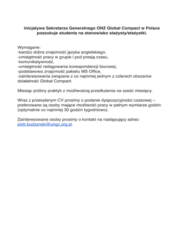 ! ! ! ! Inicjatywa Sekretarza Generalnego ONZ Global Compact w Polsce poszukuje studenta na stanowisko stażysty/stażystki. " Wymagane: ! -bardzo dobra znajomość języka angielskiego, ! -umiejętność pracy w grupie i pod presją czasu, ! -komunikatywność, ! -umiejętność redagowania korespondencji biurowej, ! -podstawowa znajomość pakietu MS Office, ! -zainteresowania związane z co najmniej jednym z czterech obszarów działalność Global Compact. ! ! Miesiąc próbny praktyk z możliwością przedłużenia na sześć miesięcy. ! ! Wraz z przesyłanym CV prosimy o podanie dyspozycyjności czasowej – preferowane są osoby mające możliwość pracy w pełnym wymiarze godzin (optymalnie co najmniej 30 godzin tygodniowo). ! ! Zainteresowane osoby prosimy o kontakt na następujący adres: [email protected].