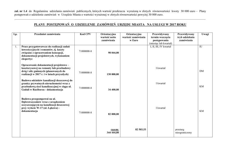 zał. nr 1.4 do Regulaminu udzielania zamówień publicznych, których wartość przekracza wyrażoną w złotych równowartości kwoty 30 000 euro – Plany postępowań o udzielenie zamówień w Urzędzie Miasta o wartości wyrażonej w złotych równowartości powyżej 30 000 euro. __________________________________________________________________________________________________________________________________ PLANY POSTĘPOWAŃ O UDZIELENIE ZAMÓWIEŃ URZĘDU MIASTA NA USŁUGI W 2017 ROKU Lp. 1. Przedmiot zamówienia Prace przygotowawcze do realizacji zadań inwestycyjnych i remontów, tj. koszty związane z opracowaniem koncepcji, dokumentacji projektowych, wykonaniem ekspertyz Opracowanie dokumentacji projektowo – kosztorysowej na remonty lub przebudowy dróg i ulic gminnych (planowanych do realizacji w 2017 r. i w latach przyszłych) Budowa odcinków kanalizacji deszczowej do granicy prywatnych nieruchomości wraz z przebudową sieci kanalizacyjnej w ciągu ul. Goduli w Raciborzu - dokumentacja Budowa przepompowni na ul. Dąbrowszczaków wraz z urządzeniem oczyszczającym na kanalizacji deszczowej przy wylocie W-17 (ul. Łąkowa) dokumentacja Kod CPV 71000000-8 Orientacyjna wartość netto zamówienia Orientacyjna wartość zamówienia w Euro Przewidywany termin wszczęcia postępowania (miesiąc lub kwartał) I, II, III, IV kwartał Przewidywany tryb udzielenia zamówienia Uwagi IU 98 044,00 I kwartał 71000000-8 DM 130 000,00 I kwartał 71000000-8 KM 34 400,00 I kwartał 71000000-8 KM 82 000,00 razem: 344 444,00 82 503,53 przetarg nieograniczony zał. nr 1.4 do Regulaminu udzielania zamówień publicznych, których wartość przekracza wyrażoną w złotych równowartości kwoty 30 000 euro – Plany postępowań o udzielenie zamówień w Urzędzie Miasta o wartości wyrażonej w złotych równowartości powyżej 30 000 euro. __________________________________________________________________________________________________________________________________ Przygotowanie terenu i sadzenie drzew 77211600-8 121 950,00 3. Pielęgnacja pomników przyrody i drzew wytypowanych do objęcia ochroną 77211500-7 26 020,00 I, II, III, IV kwartał OŚ 77211500-7 125 000,00 II kwartał KM Pielęgnacja drzew na terenie Parku Zamkowego oraz na skwerze zlokalizowanym pomiędzy ulicami Towarzystwa Gimnastycznego Sokół i Reymonta 4. 5. 6. Bieżąca pielęgnacja, konserwacja i utrzymanie zieleni oraz obiektów i elementów małej architektury w terenach parków, skwerów i zieleńców miejskich oraz drzew, krzewów i kwietników zlokalizowanych w zieleni przydrożnej dróg gminnych w Raciborzu 77310000-6 77313000-7 90511000-2 77314100-5 77314000-4 Usługa oświetleniowa - konserwacja 50000000-5 Zakup energii elektrycznej 09000000-3 Bieżące utrzymanie czystości i porządku na terenie miasta Racibórz 7. 90910000-9 90610000-6 90914000-7 90620000-9 90630000-2 77313000-7 29 210,28 II, III, IV kwartał przetarg nieograniczony OŚ 2. przetarg nieograniczony razem: 151 020,00 36 173,32 1 399 147,40 335 133,15 styczeń 600 000,00 143 716,02 635 000,00 2 388 185,12 art.67 ust.1 pkt.12 ustawy Pzp. (in house) KM IV kwartał z wolnej ręki KM 152 099,45 III kwartał przetarg nieograniczony KM 572 034,09 styczeń art.67 ust.1 pkt.12 ustawy Pzp. (in house) KM zał. nr 1.4 do Regulaminu udzielania zamówień publicznych, których wartość przekracza wyrażoną w złotych równowartości kwoty 30 000 euro – Plany postępowań o udzielenie zamówień w Urzędzie Miasta o wartości wyrażonej w złotych równowartości powyżej 30 000 euro. __________________________________________________________________________________________________________________________________ 77314000-4 90511000-2 Bieżące utrzymanie kanalizacji deszczowej oraz rowów na terenie miasta Racibórz 45000000-7 50000000-5 77000000-0 90000000-7 98000000-3 9. Usługi pocztowe 10. Dowóz dzieci i uczniów niepełnosprawnych Transport na „Obóz w Pleśnej” 11. Udzielenie kredytu długoterminowego 8. 12. Sporządzenie zmiany miejscowego planu zagospodarowania przestrzennego miasta Racibórz, sporządzenie zmiany studium uwarunkowań i kierunków zagospodarowania przestrzennego miasta Racibórz Ocena aktualności studium i planów miejscowych Plakaty, ulotki Publikacja – opracowania graficzne Materiały promocyjne - druki KM przetarg nieograniczony OR 205 313,90 styczeń 64110000-0 330.000,00 79 043,81 czerwiec 60130000-8 250 000,00 37 700,00 Razem 287 700,00 68 912 III kwartał przetarg nieograniczony 66113000-5 1 400 000,00 335 337,37 październik przetarg nieograniczony 71400000-2 95 060,00 III kwartał IU 71400000-2 32 520,00 I kwartał IU razem: 127 580,00 13. art.67 ust.1 pkt.12 ustawy Pzp. (in house) 857 165,00 79810000-5 15 000,00 FN przetarg nieograniczony 30 558,82 RW 1 900,00 7 682,92 EKS styczeń - grudzień RW RW zał. nr 1.4 do Regulaminu udzielania zamówień publicznych, których wartość przekracza wyrażoną w złotych równowartości kwoty 30 000 euro – Plany postępowań o udzielenie zamówień w Urzędzie Miasta o wartości wyrażonej w złotych równowartości powyżej 30 000 euro. __________________________________________________________________________________________________________________________________ Materiał promujący Miasto Racibórz – druki 15 000,00 RW Wykonanie materiałów promocyjnych: plakaty, ulotki, zaproszenia 6 504,06 RW Wykonanie plakatów i zaproszeń dożynkowych 1 500,00 OŚ Wykonanie ulotek dla seniorów 1 500,00 OŚ 16 260,00 OŚ Wykonanie plakatów promujących ZSEE 1 220,00 OŚ Wykonanie ulotek ekologicznych 2 440,00 OŚ Druk kalendarza ekologicznego 16 260,00 OŚ 1 219,50 SM 50 000,00 EKS 6 000,00 EKS Druk poradnika nt. gospodarowania odpadami Wykonanie druków Wykonanie ( wydruki): - plakaty, ulotki, foldery, albumy, itp. Usługa drukarska Opracowanie graficzne, skład, druk oraz dostawa do siedziby zamawiającego czasopisma „Raciborski Informator Miejski” Rzecznik praso