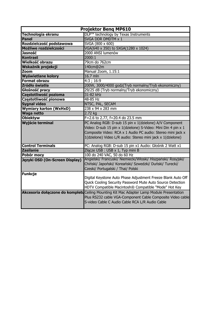 Projektor Benq MP610 Technologia ekranu Panel Rozdzielczość podstawowa Możliwe rozdzielczości Jasność Kontrast Wielkość obrazu Wskaźnik projekcji Zoom Wyświetlane kolory Format obrazu Źródło światła Głośność pracy Częstotliwość pozioma Częstotliwość pionowa Sygnał video Wymiary karton (WxHxD) Waga netto Obiektyw Wyjście terminal DLP™ technology by Texas Instruments SVGA DDR DMDTM x 1 SVGA (800 x 600) VGA(640 x 350) to SXGA(1280 x 1024) 2000 ANSI lumenów 2000:1 79cm do 762cm 140cm@2m Manual Zoom, 1.15:1 16.7 mln 4:3 ; 16:9 200W, 3000/4000 godz(Tryb normalny/Tryb ekonomiczny) 29/25 dB (Tryb normalny/Tryb ekonomiczny) 31-82 kHz 48-85 Hz NTSC, PAL, SECAM 238 x 94 x 283 mm 2.72 kg F=2.6 to 2.77, f=20.4 do 23.5 mm PC Analog RGB: D-sub 15 pin x 1(dzielone) A/V Component Video: D-sub 15 pin x 1(dzielone) S-Video: Mini Din 4 pin x 1 Composite Video: RCA x 1 Audio PC audio: Stereo mini jack x 1(dzielone) Video L/R audio: Stereo mini jack x 1(dzielone) Control Terminals Zasilanie Pobór mocy Języki OSD (On-Screen Display) PC: Analog RGB: D-sub 15 pin x1 Audio: Głośnik 2 Watt x1 Złącze USB : USB x 1, Typ mini B 100 do 240 VAC, 50 do 60 Hz Angielski/ Francuski/ Niemiecki/Włoski/ Hiszpański/ Rosyjski/ Chiński/ Japoński/ Koreański/ Szwedzki/ Duński/ Turecki/ Czeski/ Portugalski / Thai/ Polski Funkcje Digital Keystone Auto Phase Adjustment Freeze Blank Auto Off Quick Cooling Security Password Mute Auto Source Detection HDTV Compatible Macintosh® Compatible "Mode" Hot Key Akcesoria dołączone do kompletuCeiling Mounting Kit Mac Adapter Lamp Module Presentation Plus RS232 cable VGA-Component Cable Composite Video cable S-video Cable C Audio Cable RCA L/R Audio Cable