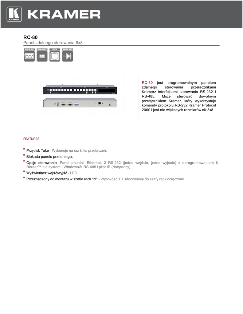 RC-80 Panel zdalnego sterowania 8x8 RC-80 jest programowalnym panelem zdalnego sterowania przełącznikami Kramerz interfejsami sterowania RS-232 i RS-485. Może sterować dowolnym przełącznikiem Kramer, który wykorzystuje komendy protokołu RS-232 Kramer Protocol 2000 i jest nie większych rozmiarów niż 8x8. FEATURES Przycisk Take - Wykonuje na raz kilka przełączeń. Blokada panelu przedniego. Opcje sterowania - Panel przedni, Ethernet, 2 RS-232 (jedno wejście, jedno wyjście) z oprogramowaniem KRouter™ dla systemu Windows®, RS-485 i pilot IR (dołączony). Wyświetlacz wejść/wyjść - LED. Przeznaczony do montażu w szafie rack 19" - Wysokość 1U. Mocowania do szafy rack dołączone. RC-80 TECHNICAL SPECIFICATIONS WEJŚCIE/WYJŚCIE: 2 RS-232 złącza DB-9 wejście/wyjście; 1 port RS-485 (złącza śrubowe); 1 port ETHERNET CAT5. STEROWANIE: Przyciski panelu przedniego, RS-232, RS-485, Ethernet oraz IR, trymer regulacji kontrastu LCD. INDICATORS: 8−character display on the front panel. ŹRÓDŁO ZASILANIA: WYMIARY: 12 V DC, 200 mA MASA: Ok. 2.7 kg (6 lbs.). AKCESORIA: Adapter null modem, oprogramowanie kontrolne dla systemu Windows®, oprogramowanie konfiguracyjne dla systemu Windows®, pilot zdalnego sterowania IR. 19" x 2" x 1U szer., głęb., wys., do montażu w szafie rack.