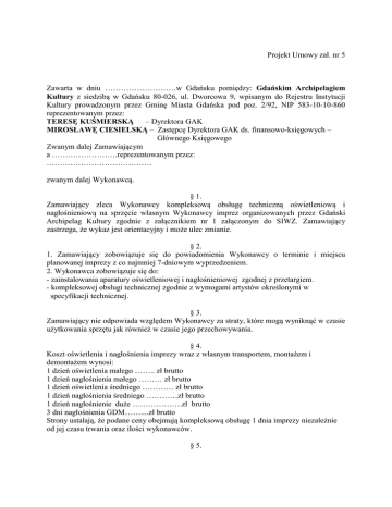 Projekt Umowy zał. nr 5 Zawarta w dniu ………………………w Gdańsku pomiędzy: Gdańskim Archipelagiem Kultury z siedzibą w Gdańsku 80-026, ul. Dworcowa 9, wpisanym do Rejestru Instytucji Kultury prowadzonym przez Gminę Miasta Gdańska pod poz. 2/92, NIP 583-10-10-860 reprezentowanym przez: TERESĘ KUŚMIERSKĄ – Dyrektora GAK MIROSŁAWĘ CIESIELSKĄ – Zastępcę Dyrektora GAK ds. finansowo-księgowych – Głównego Księgowego Zwanym dalej Zamawiającym a …………………….reprezentowanym przez: …………………………………. zwanym dalej Wykonawcą. § 1. Zamawiający zleca Wykonawcy kompleksową obsługę techniczną oświetleniową i nagłośnieniową na sprzęcie własnym Wykonawcy imprez organizowanych przez Gdański Archipelag Kultury zgodnie z załącznikiem nr 1 załączonym do SIWZ. Zamawiający zastrzega, że wykaz jest orientacyjny i może ulec zmianie. § 2. 1. Zamawiający zobowiązuje się do powiadomienia Wykonawcy o terminie i miejscu planowanej imprezy z co najmniej 7-dniowym wyprzedzeniem. 2. Wykonawca zobowiązuje się do: - zainstalowania aparatury oświetleniowej i nagłośnieniowej zgodnej z przetargiem. - kompleksowej obsługi technicznej zgodnie z wymogami artystów określonymi w specyfikacji technicznej. § 3. Zamawiający nie odpowiada względem Wykonawcy za straty, które mogą wyniknąć w czasie użytkowania sprzętu jak również w czasie jego przechowywania. § 4. Koszt oświetlenia i nagłośnienia imprezy wraz z własnym transportem, montażem i demontażem wynosi: 1 dzień oświetlenia małego …….. zł brutto 1 dzień nagłośnienia małego ……… zł brutto 1 dzień oświetlenia średniego ………… zł brutto 1 dzień nagłośnienia średniego …………zł brutto 1 dzień nagłośnienie duże ……………….zł brutto 3 dni nagłośnienia GDM……....zł brutto Strony ustalają, że podane ceny obejmują kompleksową obsługę 1 dnia imprezy niezależnie od jej czasu trwania oraz ilości wykonawców. § 5. 1. Rozliczenie następować będzie na podstawie faktur wystawionych po każdej zakończonej imprezie. 2. Zapłata nastąpi przelewem na konto Wykonawcy ………………………………….. w ciągu 14 dni od daty dostarczenia do Zamawiającego faktury wystawionej zgodnie z obowiązującymi przepisami. §6 Umowa zostaje zawarta na czas określony od podpisania do dnia 31.05.2015r. § 7. 1. Każda ze stron może rozwiązać umowę z zachowaniem miesięcznego okresu wypowiedzenia, liczonego od pierwszego dnia kolejnego miesiąca kalendarzowego. 2. Obie strony zobowiązane są do wykonywania postanowień niniejszej umowy w trakcie okresu wypowiedzenia. 3. W przypadku odmowy wykonania postanowień niniejszej umowy w trakcie okresu wypowiedzenia strona odmawiająca zostanie obciążona udokumentowanymi kosztami poniesionymi przez drugą stronę. 4. W przypadku nie wywiązania się którejkolwiek ze stron z postanowień niniejszej umowy każda ze stron może rozwiązać umowę ze skutkiem natychmiastowym. 5. Strony ustalają, że w przypadku rozwiązania umowy ze skutkiem natychmiastowym z przyczyn określonych w § 7 pkt 3 niniejszej umowy strona, z którą rozwiązano umowę wypłaci stronie przeciwnej karę w wysokości 200% łącznej wartości średniego oświetlenia i nagłośnienia. § 8. W sprawach nieuregulowanych postanowienia niniejszej umowy będą miały zastosowanie przepisy Kodeksu Cywilnego. § 9. Strony uzgadniają, że ewentualne spory wynikające z realizacji niniejszej umowy, strony poddają pod rozstrzygnięcie sądów właściwych miejscowo dla siedziby Zamawiającego. § 10. Umowę sporządzono w dwóch jednobrzmiących egzemplarzach, po jednym dla każdej stron. ZAMAWIAJĄCY WYKONAWCA
