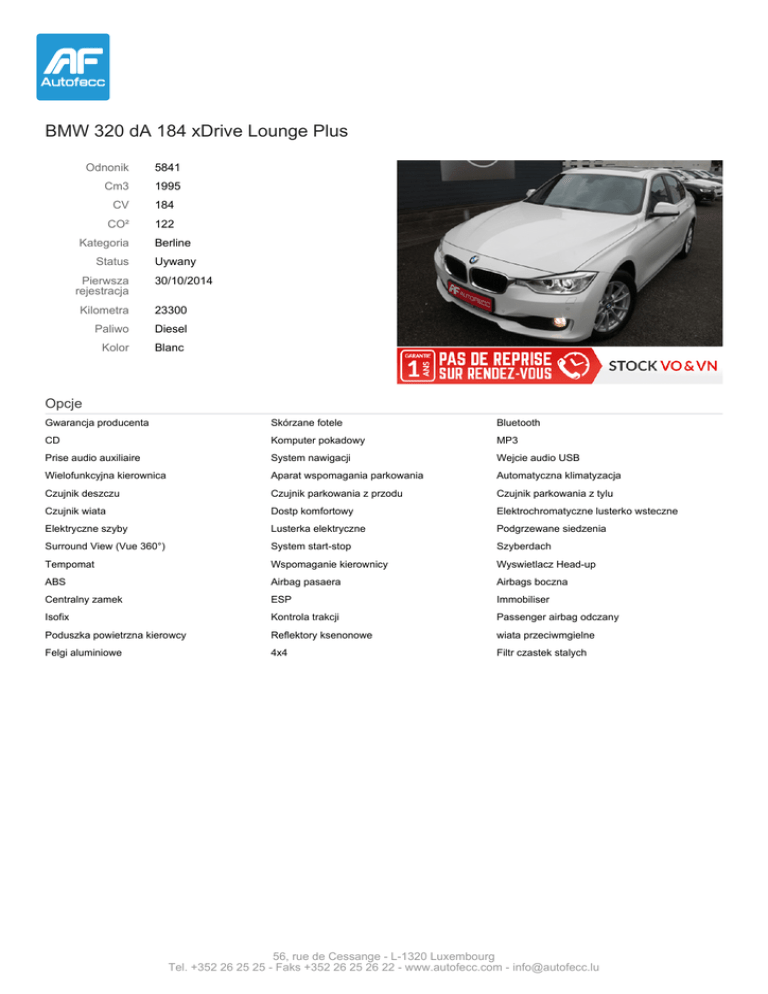 BMW 320 dA 184 xDrive Lounge Plus Odnonik 5841 Cm3 1995 CV 184 CO² 122 Kategoria Status Pierwsza rejestracja Berline Uywany 30/10/2014 Kilometra 23300 Paliwo Diesel Kolor Blanc Opcje Gwarancja producenta Skórzane fotele Bluetooth CD Komputer pokadowy MP3 Prise audio auxiliaire System nawigacji Wejcie audio USB Wielofunkcyjna kierownica Aparat wspomagania parkowania Automatyczna klimatyzacja Czujnik deszczu Czujnik parkowania z przodu Czujnik parkowania z tylu Czujnik wiata Dostp komfortowy Elektrochromatyczne lusterko wsteczne Elektryczne szyby Lusterka elektryczne Podgrzewane siedzenia Surround View (Vue 360°) System start-stop Szyberdach Tempomat Wspomaganie kierownicy Wyswietlacz Head-up ABS Airbag pasaera Airbags boczna Centralny zamek ESP Immobiliser Isofix Kontrola trakcji Passenger airbag odczany Poduszka powietrzna kierowcy Reflektory ksenonowe wiata przeciwmgielne Felgi aluminiowe 4x4 Filtr czastek stalych 56, rue de Cessange - L-1320 Luxembourg Tel. +352 26 25 25 - Faks +352 26 25 26 22 - www.autofecc.com - [email protected]
