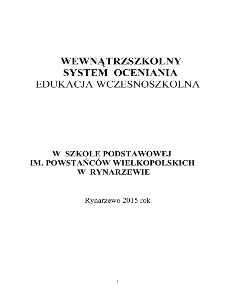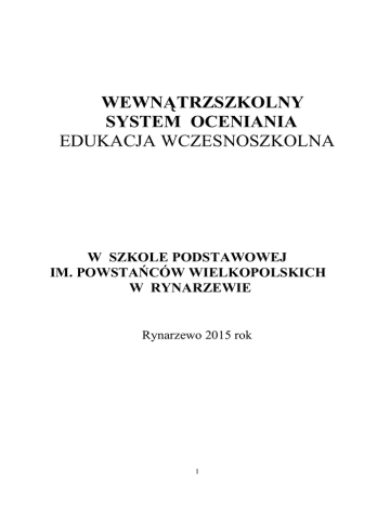 WEWNĄTRZSZKOLNY SYSTEM OCENIANIA EDUKACJA WCZESNOSZKOLNA W SZKOLE PODSTAWOWEJ IM. POWSTAŃCÓW WIELKOPOLSKICH W RYNARZEWIE Rynarzewo 2015 rok 1 PODSTAWY PRAWNE Rozporządzenie MEN z dn.21 marca 2001 r. w sprawie warunków i sposobu oceniania, klasyfikowania, promowania uczniów i słuchaczy oraz przeprowadzania egzaminów i sprawdzianów w szkołach publicznych (Dz. U. 2001r. nr 29 poz. 323). Niniejsze Rozporządzenie było poprzedzone rozporządzeniem Ministra Edukacji Narodowej z dnia 21.03.2001 r. w sprawie warunków i sposobu oceniania, klasyfikowania i promowania uczniów i słuchaczy oraz przeprowadzania egzaminów i sprawdzianach w szkołach publicznych (Dz. U. Nr 29, poz. 323 i Nr 128, poz. 1419, z 2002 r. Nr 46, poz. 433, Nr 155, poz. 1289 i Nr 214, poz. 1807 oraz z 2003 r. Nr 26, poz. 225), które traci moc z dniem wejścia w życie niniejszego rozporządzenia na podstawie art. 21 pkt 1 ustawy z dnia 27 czerwca 2003 r. o zmianie ustawy o systemie oświaty oraz o zmianie niektórych innych ustaw (Dz. U. Nr 137, poz. 1304). I. ZAŁOŻENIA OGÓLNE WEWNĄTRZSZKOLNEGO SYSTEMU OCENIANIA 1. Ocenianie wewnątrzszkolne osiągnięć edukacyjnych ucznia polega na rozpoznawaniu przez nauczycieli poziomu i postępów w opanowaniu przez ucznia wiadomości i umiejętności w stosunku do wymagań edukacyjnych wynikających z programów nauczania oraz formułowania oceny. 2. Ocenianie wewnątrzszkolne ma na celu: a) poinformowanie ucznia o poziomie jego osiągnięć edukacyjnych i postępach w tym zakresie, b) pomoc uczniowi w samodzielnym planowaniu swojego rozwoju, c) motywowanie ucznia do dalszej pracy, d) dostarczenie rodzicom (prawnym opiekunom) i nauczycielom informacji o postępach, trudnościach i specjalnych uzdolnieniach ucznia oraz proponowanej ocenie zachowania na I i II semestr, e) umożliwienie nauczycielom doskonalenia organizacji i metod pracy dydaktyczno – wychowawczej, f) osiągnięcie wyników zgodnie ze standardami osiągnięć i wymagań. 3. Ocenianie wewnątrzszkolne obejmuje: a) formułowanie przez nauczycieli wymagań edukacyjnych oraz informowanie o nich uczniów i rodziców (prawnych opiekunów), b) formułowanie trybu oceniania zachowania oraz informowanie 2 o nim uczniów i rodziców, c) bieżące ocenianie i śródroczne klasyfikowanie, według skali i form przyjętych w szkole oraz zaliczenie niektórych zajęć edukacyjnych, d) ustalanie ocen klasyfikacyjnych w formie oceny opisowej zachowania i oceny umiejętności na koniec I semestru i roku szkolnego. 4. Ocenianie pełni funkcję: a) diagnostyczną ( monitorowanie postępów ucznia i określanie jego indywidualnych potrzeb), b) klasyfikacyjną ( różnicuje i uporządkowuje uczniów zgodnie z pewną skalą, za pomocą umownego symbolu). 5. Przedmiotem oceny jest: a) zakres opanowanych wiadomości, b) rozumienie materiału naukowego, c) umiejętność w stosowaniu wiedzy, d) kultura przekazywania wiadomości. 6. Oceny dzielą się na: a) bieżące (cząstkowe), b) klasyfikacyjne śródroczne c) klasyfikacyjne końcoworoczne. 7. W (kształceniu zintegrowanym- wykreslić) edukacji wczesnoszkolnej klasyfikacja roczna (śródroczna) ma postać oceny opisowej zachowania i umiejętności edukacyjnych oraz oceny cyfrowej z religii i oceny literowej z języka obcego. 8. Rok szkolny składa się z dwóch semestrów. 9. Nauczyciele na początku każdego roku szkolnego informują uczniów oraz rodziców (prawnych opiekunów) o wymaganiach edukacyjnych wynikających z ( realizowanego przez siebie programu nauczaniawykreslić) podstawy programowej klas I-III oraz o sposobach sprawdzania osiągnięć edukacyjnych uczniów i kryteriach ocen: a) uczniowie są informowani na początku roku szkolnego, b) każdy wychowawca zapoznaje rodziców z WSO na pierwszym zebraniu oraz informuje, że dokument jest do wglądu w bibliotece szkolnej, w sekretariacie szkoły i (pokoju nauczycielskim wykreslić) na stronie internetowej szkoły. Nauczyciel zobowiązany jest zapoznać rodziców i uczniów ze zmianami wprowadzanymi do WSO na zebraniach z rodzicami. 3 c) rodzice (prawni opiekunowie) mogą uzyskać informację bezpośrednio u nauczyciela, d) rodzice otrzymają ocenę śródroczną i końcoworoczną w formie opisowej (załącznik 1), e) (półroczną i - wykreslić) końcoworoczną ocenę zapisuje się do arkusza ocen ucznia. 10. Wychowawca klasy na początku każdego roku szkolnego informuje uczniów oraz rodziców( prawnych opiekunów) o zasadach oceniania zachowania w I i II semestrze. II. OCENIANIE I KLASYFIKACJA UCZNIÓW 1. Klasyfikacja uczniów (nauczania zintegrowanego – wykreślić) edukacji wczesnoszkolnej na koniec semestru i koniec roku szkolnego będzie podsumowaniem zachowania i osiągnięć edukacyjnych. 2. Uczniowie (kształcenia zintegrowanegowykreślić) edukacji wczesnoszkolnej otrzymują na koniec semestru edukacji wczesnoszkolnej i koniec roku szkolnego jedną ocenę opisową ze wszystkich zajęć, drugą (także opisową) z zachowania ( załącznik 1), oraz ocenę cyfrową z religii i ocenę literową z języka obcego. 3. Przy ustalaniu oceny z zakresu edukacji plastycznej, technicznej, muzycznej i ruchowo – sportowej należy w szczególności brać pod uwagę wysiłek wkładany przez ucznia w wywiązywanie się z obowiązków wynikających ze specyfiki zajęć. 4. Oceny wystawia się poprzez wypełnianie dziennika lekcyjnego, zeszytów przedmiotowych i kart pracy. Ocena bieżąca w zeszytach przedmiotowych i kartach pracy ma formę (opisową – wykreślić). W dzienniku lekcyjnym wystawia się ocenę (literową – wykreślić) stopniową według przyjętej skali. W dzienniku lekcyjnym dopuszcza się zapis ocen z dodatkowym oznaczeniem: „-”, „+”. 5. Oceny stopniowe w skali 6-1 zastępują nazewnictwo literowe. 6. (Bieżące i semestralne postępy uczniów mierzy się w następujący sposób: A – ZNAKOMICIE (umiejętności powyżej poziomu) B – DOBRZE (umiejętności na poziomie) C – POPRACUJ,