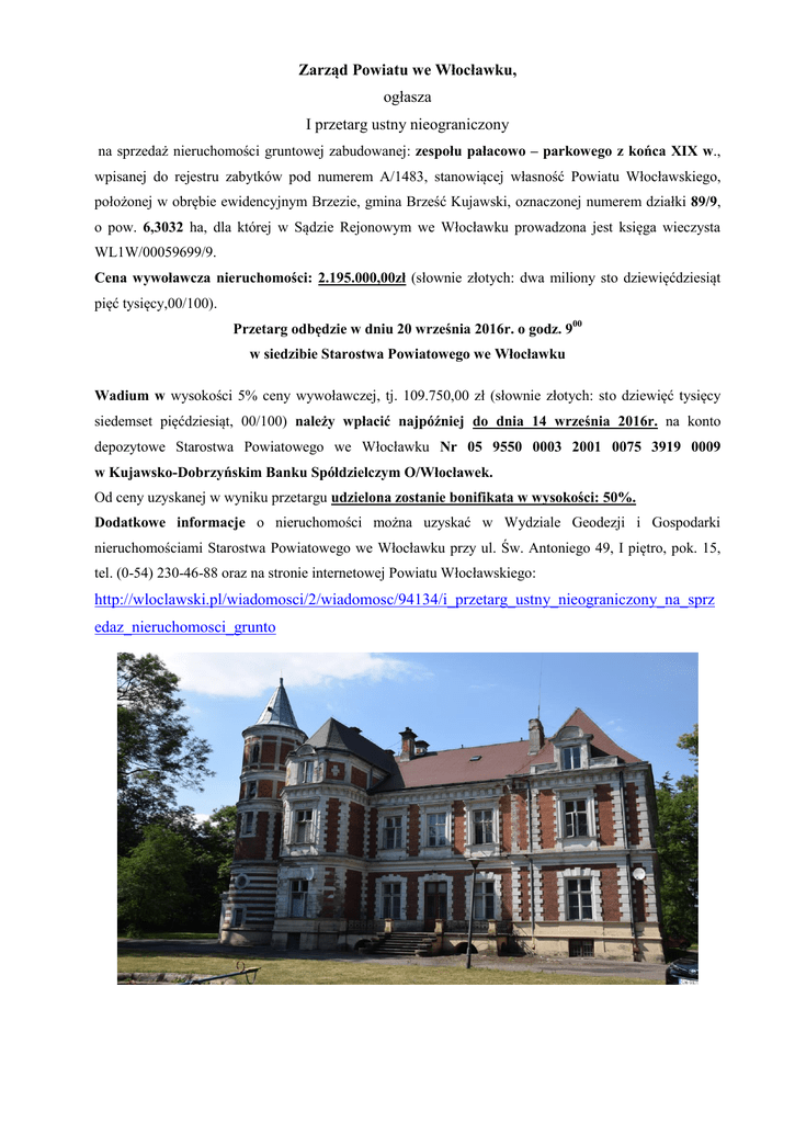 Zarząd Powiatu we Włocławku, ogłasza I przetarg ustny nieograniczony na sprzedaż nieruchomości gruntowej zabudowanej: zespołu pałacowo – parkowego z końca XIX w., wpisanej do rejestru zabytków pod numerem A/1483, stanowiącej własność Powiatu Włocławskiego, położonej w obrębie ewidencyjnym Brzezie, gmina Brześć Kujawski, oznaczonej numerem działki 89/9, o pow. 6,3032 ha, dla której w Sądzie Rejonowym we Włocławku prowadzona jest księga wieczysta WL1W/00059699/9. Cena wywoławcza nieruchomości: 2.195.000,00zł (słownie złotych: dwa miliony sto dziewięćdziesiąt pięć tysięcy,00/100). Przetarg odbędzie w dniu 20 września 2016r. o godz. 900 w siedzibie Starostwa Powiatowego we Włocławku Wadium w wysokości 5% ceny wywoławczej, tj. 109.750,00 zł (słownie złotych: sto dziewięć tysięcy siedemset pięćdziesiąt, 00/100) należy wpłacić najpóźniej do dnia 14 września 2016r. na konto depozytowe Starostwa Powiatowego we Włocławku Nr 05 9550 0003 2001 0075 3919 0009 w Kujawsko-Dobrzyńskim Banku Spółdzielczym O/Włocławek. Od ceny uzyskanej w wyniku przetargu udzielona zostanie bonifikata w wysokości: 50%. Dodatkowe informacje o nieruchomości można uzyskać w Wydziale Geodezji i Gospodarki nieruchomościami Starostwa Powiatowego we Włocławku przy ul. Św. Antoniego 49, I piętro, pok. 15, tel. (0-54) 230-46-88 oraz na stronie internetowej Powiatu Włocławskiego: http://wloclawski.pl/wiadomosci/2/wiadomosc/94134/i_przetarg_ustny_nieograniczony_na_sprz edaz_nieruchomosci_grunto