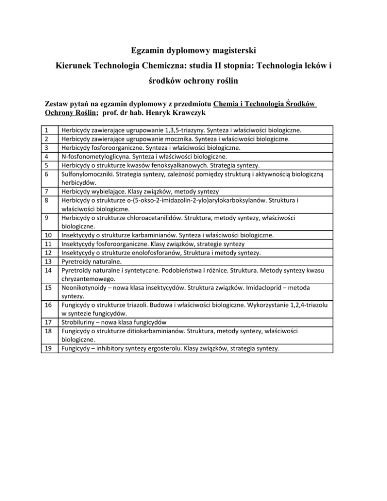 Egzamin dyplomowy magisterski Kierunek Technologia Chemiczna: studia II stopnia: Technologia leków i środków ochrony roślin Zestaw pytań na egzamin dyplomowy z przedmiotu Chemia i Technologia Środków Ochrony Roślin; prof. dr hab. Henryk Krawczyk 1 2 3 4 5 6 7 8 9 10 11 12 13 14 15 16 17 18 19 Herbicydy zawierające ugrupowanie 1,3,5-triazyny. Synteza i właściwości biologiczne. Herbicydy zawierające ugrupowanie mocznika. Synteza i właściwości biologiczne. Herbicydy fosforoorganiczne. Synteza i właściwości biologiczne. N-fosfonometyloglicyna. Synteza i właściwości biologiczne. Herbicydy o strukturze kwasów fenoksyalkanowych. Strategia syntezy. Sulfonylomoczniki. Strategia syntezy, zależność pomiędzy strukturą i aktywnością biologiczną herbicydów. Herbicydy wybielające. Klasy związków, metody syntezy Herbicydy o strukturze o-(5-okso-2-imidazolin-2-ylo)arylokarboksylanów. Struktura i właściwości biologiczne. Herbicydy o strukturze chloroacetanilidów. Struktura, metody syntezy, właściwości biologiczne. Insektycydy o strukturze karbaminianów. Synteza i właściwości biologiczne. Insektycydy fosforoorganiczne. Klasy związków, strategie syntezy Insektycydy o strukturze enolofosforanów, Struktura i metody syntezy. Pyretroidy naturalne. Pyretroidy naturalne i syntetyczne. Podobieństwa i różnice. Struktura. Metody syntezy kwasu chryzantemowego. Neonikotynoidy – nowa klasa insektycydów. Struktura związków. Imidacloprid – metoda syntezy. Fungicydy o strukturze triazoli. Budowa i właściwości biologiczne. Wykorzystanie 1,2,4-triazolu w syntezie fungicydów. Strobiluriny – nowa klasa fungicydów Fungicydy o strukturze ditiokarbaminianów. Struktura, metody syntezy, właściwości biologiczne. Fungicydy – inhibitory syntezy ergosterolu. Klasy związków, strategia syntezy.
