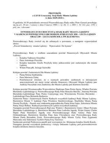 1 PROTOKÓŁ z LXVII Uroczystej Sesji Rady Miasta Lędziny w dniu 18.09.2010 r. O godzinie 16:30 posiedzenie otworzył Przewodniczący Rady radny Piotr Gorzeń powołując się na art. 20 ust. 1 ustawy z dnia 8 marca 1990 r. ( tj. Dz. U. z 2001 r. Nr 142, poz. 1591 z póź. zm. ) słowami: OTWIERAM LXVII UROCZYSTĄ SESJĘ RADY MIASTA LĘDZINY V KADENCJI POŚWIĘCONEJ OBCHODOM JUBILEUSZU 850 – LECIA LĘDZIN ORAZ 240 – LECIA KOŚCIOŁA ŚW.KLEMENSA Przewodniczący Rady zwrócił się do zebranych o powstanie, a następnie wypowiedział słowa: „Poczet Sztandarowy miasta Lędziny- Wprowadzić. Do hymnu” Przewodniczący Rady z wielkim szacunkiem powitał Honorowych Obywateli Miasta Lędziny: Księdza Tadeusza Orszulika Pana Antoniego Piszczka Księdza kanonika Józefa Przybyłę który jednocześnie jest zasłużonym dla miasta Lędziny Witam Pana płk. Jerzego Szewełło Kolejno powitał Zasłużonych Dla Miasta Lędziny: Panią Helenę Szabrańską Pana Mariusza Żołnę Poinformował również, że z ważnych powodów osobistych w dzisiejszych uroczystościach nie może wziąć udziału Honorowy Obywatel Miasta Lędziny pan Andrzej Naczyński oraz Zasłużony dla Miasta Lędziny pan Klemens Ścierski. Kolejno powitał Wicemarszałka Województwa Śląskiego Pana Piotra Spyrę, Władze Powiatu Bieruńsko-Lędzińskiego tj. Przewodniczącego Rady Pana Henryka Barcika , Starostę Powiatu Bieruńsko-Lędzińskiego Pana Piotra Czarnynogę oraz Wicestarostę Powiatu Bieruńsko – Lędzińskiego Pana Bernarda Bednorza. Szanowne Panie i Szanownych Panów Radnych wszystkich kadencji Rady Miasta Lędziny. Burmistrza Miasta V kadencji Pana Wiesława Stambrowskiego, Skarbnika Miasta Panią Dorotę Przybyłę – Paszek oraz znakomitą poprzedniczkę Panią Irenę Gajer, Sekretarza Miasta Panią Alicje Bobiec. Radnych powiatowych Lędzin wszystkich kadencji. Następnie powitał Przewodniczących Rad oraz Wójtów i Burmistrzów Gmin i Miast Powiatu Bieruńsko-Lędzińskiego tj. Burmistrza Bierunia Pana Ludwika Jagodę, Wójta Gminy Chełm Śląski Pana Stanisława Jagodę oraz Przewodniczącego Rady Gminy Pana Jana Ochmańskiego, Burmistrza Imielina Pana Jana Chwiędacza oraz Przewodniczącą Rady Miasta Panią Bernadetę Ficek, Przewodniczącego Rady Miasta Tychy Pana Zygmunta Marczuka oraz Sekretarza Tychów Panią Ewę Turewicz. Serdecznie powitał Proboszcza parafii pod wezwaniem św. Klemensa księdza Józefa Kraclę . Następnie powitał wszystkich proboszczy i księży Dekanatu Lędziny pod przewodnictwem księdza dziekana Janusza Jarczyka. 2 Kolejno powitał Przedstawicieli Wojska, Policji, OSP, dyrektorów lokalnych Przedsiębiorstw i Spółek oraz jego magnificencję rektora Górnośląskiej Wyższej Szkoły Pedagogicznej w Mysłowicach doc. Dr Mirosława Wójcika oraz Pana prof. Marka Szczepańskiego, Powitał również Dyrektorów Szkół Średnich, Gimnazjów, Szkół Podstawowych i Przedszkoli, Dyrektorów Zakładów i Jednostek Budżetowych Lędzin, Naczelników Wydziałów i Kierowników Referatów urzędu miasta, emerytów urzędu miasta. Przedstawicieli lokalnych Mediów, Stowarzyszeń, Związków, Towarzystw oraz organizacji sportowych, społeczników miasta i powiatu. Następnie Przewodniczący zwrócił się do zebranych o uczczenie chwila ciszy tych, którzy odeszli pozostawiając po sobie niezliczoną ilość wspomnień i śladów aktywnego życia tj. Honorowych Obywateli Miasta Lędziny: Pana prof. Franciszka Serafina, Pana prof. Wiktora Zina oraz pamięć lędzińskich samorządowców: Pani Sekretarz Irena Hałupnik, Pana radnego Józefa Kubistę, Pana radnego Wiesława Sadowskiego, Przewodniczącego Rady Miasta II kadencji Pana Sylwestra Łakotę, Pana radnego powiatowego Marka Liszewskiego, Pana radnego Józefa Ścierskiego, wiceprzewodniczącego Rady Miasta IV kadencji Pana Zygfryda Ścierskiego, Przewodniczącego Rady Miasta III kadencji Pana Józefa Biolika. Po części powitalnej Przewodniczący zaprosił do zajęcia miejsca przy symbolicznym stole sesyjnym wszystkich dotychczasowych Przewodniczących Rady Miasta Lędziny: tj. Pana Jana Raszkę Przewodniczącego Rady Miasta I oraz II kadencji, Panią Annę Wójcik-Ścierską Przewodniczącą Rady Miasta III kadencji, Pana Bogusława Szarzyńskiego Przewodniczącego Rady Miasta IV kadencji. Następnie Przewodniczący Rady wypowiedział kilka słów o Lędzińskim jubileuszu: cyt.: „Każdy jubileusz wywołuje wspomnienia, skłania do refleksji, pozwala na dokonanie bilansu, ale także pobudza do podjęcia nowych wyzwań. Nasz jubileusz ukazuje dziejową rolę, jaką mamy do spełnienia tu i teraz. Jest powodem do niewątpliwej dumy z tego, co zostało osiągnięte, ale i ogromnym zobowiązaniem zarówno wobec przodków jak i potomnych. W ciągu ośmiu i pół wieku istnienia Lędzin wygląd miasta ulegał wielu zmianom, było ono świadkiem i uczestnikiem wielu przemian społecznych, gospodarczych i politycznych dokonujących się w naszym kraju. W obliczu 850-u lat, człowiek, dostrzega swoją rolę, dla jednych jest to rola podróżnika czy przechodnia dla innych rola budowniczego. Rola nie do przecenienia, bo w małej, ale jakże znaczącej części stanowiącej o istnieniu naszego miasta ". Po krótkim wystąpieniu Przewodniczący Rady oddał głos członkowi Polskiej Akademii Nauk, Wykładowcy Uniwersytetu Śląskiego, Wyższej Szkoły Humanitas oraz Instytutu Socjologii Szkoły Wyższej Psychologii Społecznej, współzałożycielowi i byłemu rektorowi Wyższej Szkoły Zarządzania i Nauk Społecznych w Tychach Panu prof. Markowi Szczepańskiemu. Dodał, że tematem jaki przedstawi Pan profesor będzie „ Lędziny: między ojczyzną prywatną, a społecznością lokalną”. Wystąpienie pana prof. Marka Szczepańskiego. Po wystąpieniu zostały wręczone kwiaty Panu profesorowi. Kolejnym punktem było przedstawienie Zarządzenia Burmistrza Miasta, które zostało podjęte na podstawie art. 33 ust. 3 ust