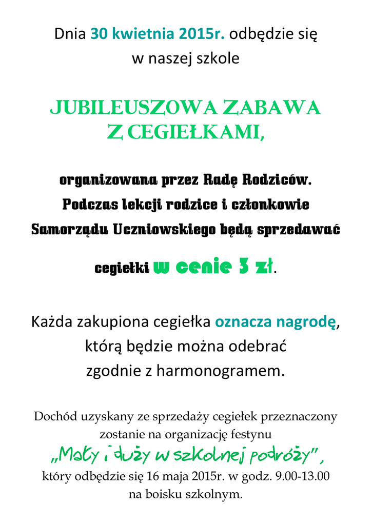 Dnia 30 kwietnia 2015r. odbędzie się w naszej szkole JUBILEUSZOWA ZABAWA Z CEGIEŁKAMI, organizowana przez Radę Rodziców. Podczas lekcji rodzice i członkowie Samorządu Uczniowskiego będą sprzedawać cegiełki w cenie 3 zł. Każda zakupiona cegiełka oznacza nagrodę, którą będzie można odebrać zgodnie z harmonogramem. Dochód uzyskany ze sprzedaży cegiełek przeznaczony zostanie na organizację festynu „Mały i duży w szkolnej podróży”, który odbędzie się 16 maja 2015r. w godz. 9.00-13.00 na boisku szkolnym.