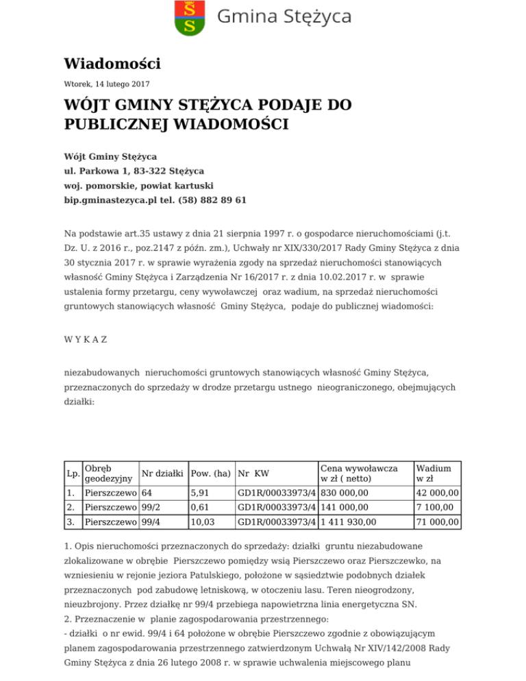 Wiadomości Wtorek, 14 lutego 2017 WÓJT GMINY STĘŻYCA PODAJE DO PUBLICZNEJ WIADOMOŚCI Wójt Gminy Stężyca ul. Parkowa 1, 83-322 Stężyca woj. pomorskie, powiat kartuski bip.gminastezyca.pl tel. (58) 882 89 61 Na podstawie art.35 ustawy z dnia 21 sierpnia 1997 r. o gospodarce nieruchomościami (j.t. Dz. U. z 2016 r., poz.2147 z późn. zm.), Uchwały nr XIX/330/2017 Rady Gminy Stężyca z dnia 30 stycznia 2017 r. w sprawie wyrażenia zgody na sprzedaż nieruchomości stanowiących własność Gminy Stężyca i Zarządzenia Nr 16/2017 r. z dnia 10.02.2017 r. w sprawie ustalenia formy przetargu, ceny wywoławczej oraz wadium, na sprzedaż nieruchomości gruntowych stanowiących własność Gminy Stężyca, podaje do publicznej wiadomości: WYKAZ niezabudowanych nieruchomości gruntowych stanowiących własność Gminy Stężyca, przeznaczonych do sprzedaży w drodze przetargu ustnego nieograniczonego, obejmujących działki: Lp. Obręb geodezyjny 1. Pierszczewo 64 5,91 GD1R/00033973/4 830 000,00 42 000,00 2. Pierszczewo 99/2 0,61 GD1R/00033973/4 141 000,00 7 100,00 3. Pierszczewo 99/4 10,03 GD1R/00033973/4 1 411 930,00 71 000,00 Nr działki Pow. (ha) Nr KW Cena wywoławcza w zł ( netto) Wadium w zł 1. Opis nieruchomości przeznaczonych do sprzedaży: działki gruntu niezabudowane zlokalizowane w obrębie Pierszczewo pomiędzy wsią Pierszczewo oraz Pierszczewko, na wzniesieniu w rejonie jeziora Patulskiego, położone w sąsiedztwie podobnych działek przeznaczonych pod zabudowę letniskową, w otoczeniu lasu. Teren nieogrodzony, nieuzbrojony. Przez działkę nr 99/4 przebiega napowietrzna linia energetyczna SN. 2. Przeznaczenie w planie zagospodarowania przestrzennego: - działki o nr ewid. 99/4 i 64 położone w obrębie Pierszczewo zgodnie z obowiązującym planem zagospodarowania przestrzennego zatwierdzonym Uchwałą Nr XIV/142/2008 Rady Gminy Stężyca z dnia 26 lutego 2008 r. w sprawie uchwalenia miejscowego planu zagospodarowania przestrzennego fragmentu wsi Pierszczewo ( Dz. Urz. Woj. Pom. Nr 50, poz. 1411 ) wchodzą w skład terenu przeznaczonego na cele: działka nr 99/4 – tereny zabudowy letniskowej indywidualnej oraz tereny dróg; działka nr 64- tereny zabudowy letniskowej indywidualnej, tereny zieleni ekologiczno – krajobrazowej, tereny leśne, tereny dróg. - działka o nr ewid. 99/2 położona w obrębie Pierszczewo zgodnie z obowiązującym planem zagospodarowania przestrzennego zatwierdzonym Uchwałą Nr VI/37/2011 Rady Gminy Stężyca z dnia 31 marca 2011 r. w sprawie uchwalenia miejscowego planu zagospodarowania przestrzennego części obrębu geodezyjnego Pierszczewo, w gminie Stężyca ( Dz. Urz. Woj. Pom. z 2011 r., poz. 1763 ) wchodzi w skład terenu oznaczonego symbolem 2.7 UT, MR, co oznacza: tereny usług turystyki i rekreacji, zabudowa rekreacyjna. 3. W celu uzyskania szczegółowych ustaleń planu zagospodarowania dla w/w działek należy wystąpić z wnioskiem o wydanie wypisu i wyrysu. 4. Sposób zagospodarowania zgodnie z przeznaczeniem w miejscowym planie zagospodarowania przestrzennego. 5. Dział III i IV KW GD1R/00033973/4 nie zawiera wpisów. 6. Część działki nr 99/4 o pow. 6,00 ha oraz część działki nr 64 o pow. 4,84 ha, aktualnie są wydzierżawione na okres 6 lat tj. do 06 listopada 2018 r., natomiast działki: nr 99/2 oraz część działki 99/4 o pow. 0,70 ha są wydzierżawione do 08 października 2018 r. 7. Ewentualny nabywca wydzierżawionych gruntów opisanych w pkt.5, z mocy prawa przejmuje wszelkie obowiązki zbywcy. 8. Ceny nieruchomości podane w wykazie dla uprawnionych osób do pierwszeństwa w nabyciu lub cena wylicytowana w przetargu, wraz z należnym podatkiem VAT na dzień sprzedaży, podlegają zapłacie nie później niż do dnia zawarcia umowy przenoszącej własność. 9. Ogłoszenie o przetargu nastąpi po upływie 6 tygodni licząc od dnia podania do publicznej wiadomości informacji o przeznaczeniu działek do sprzedaży. 10. Wykaz będzie podany do publicznej wiadomości poprzez wywieszenie od dnia 14 lutego 2017 r. na okres 21 dni: - na tablicy ogłoszeń w Urzędzie Gminy Stężyca. - sołectwo Pierszczewo, - strona internetowa gminy - bip.gminastezyca.pl, - prasa lokalna. Osoby, którym przysługuje pierwszeństwo w nabyciu nieruchomości na podstawie art.34 ust.1 pkt 1 i 2 ustawy o gospodarce nieruchomościami, mogą składać wnioski na piśmie w sekretariacie Urzędu Gminy Stężyca, ul. Parkowa 1, 83-322 Stężyca, w terminie do 30 marca 2017 r. Termin, miejsce, warunki przetargu zostaną podane do publicznej wiadomości w odrębnym ogłoszeniu o przetargu. Bliższych informacji o nieruchomościach wykazanych do sprzedaży można uzyskać Urzędzie Gminy Stężyca lub tel. (58) 882 89 61.