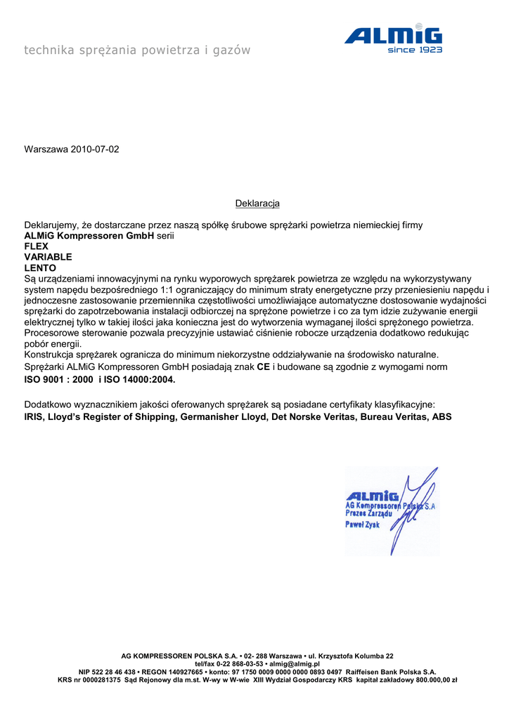 technika sprężania powietrza i gazów Warszawa 2010-07-02 Deklaracja Deklarujemy, że dostarczane przez naszą spółkę śrubowe sprężarki powietrza niemieckiej firmy ALMiG Kompressoren GmbH serii FLEX VARIABLE LENTO Są urządzeniami innowacyjnymi na rynku wyporowych sprężarek powietrza ze względu na wykorzystywany system napędu bezpośredniego 1:1 ograniczający do minimum straty energetyczne przy przeniesieniu napędu i jednoczesne zastosowanie przemiennika częstotliwości umożliwiające automatyczne dostosowanie wydajności sprężarki do zapotrzebowania instalacji odbiorczej na sprężone powietrze i co za tym idzie zużywanie energii elektrycznej tylko w takiej ilości jaka konieczna jest do wytworzenia wymaganej ilości sprężonego powietrza. Procesorowe sterowanie pozwala precyzyjnie ustawiać ciśnienie robocze urządzenia dodatkowo redukując pobór energii. Konstrukcja sprężarek ogranicza do minimum niekorzystne oddziaływanie na środowisko naturalne. Sprężarki ALMiG Kompressoren GmbH posiadają znak CE i budowane są zgodnie z wymogami norm ISO 9001 : 2000 i ISO 14000:2004. Dodatkowo wyznacznikiem jakości oferowanych sprężarek są posiadane certyfikaty klasyfikacyjne: IRIS, Lloyd’s Register of Shipping, Germanisher Lloyd, Det Norske Veritas, Bureau Veritas, ABS AG KOMPRESSOREN POLSKA S.A. • 02- 288 Warszawa • ul. Krzysztofa Kolumba 22 tel/fax 0-22 868-03-53 • [email protected] NIP 522 28 46 438 • REGON 140927665 • konto: 97 1750 0009 0000 0000 0893 0497 Raiffeisen Bank Polska S.A. KRS nr 0000281375 Sąd Rejonowy dla m.st. W-wy w W-wie XIII Wydział Gospodarczy KRS kapitał zakładowy 800.000,00 zł