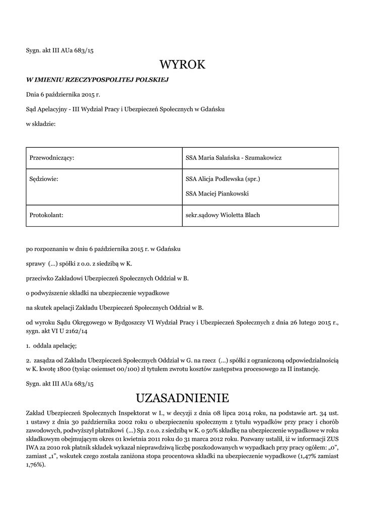 Sygn. akt III AUa 683/15 WYROK W IMIENIU RZECZYPOSPOLITEJ POLSKIEJ Dnia 6 października 2015 r. Sąd Apelacyjny - III Wydział Pracy i Ubezpieczeń Społecznych w Gdańsku w składzie: Przewodniczący: SSA Maria Sałańska - Szumakowicz Sędziowie: SSA Alicja Podlewska (spr.) SSA Maciej Piankowski Protokolant: sekr.sądowy Wioletta Blach po rozpoznaniu w dniu 6 października 2015 r. w Gdańsku sprawy (...) spółki z o.o. z siedzibą w K. przeciwko Zakładowi Ubezpieczeń Społecznych Oddział w B. o podwyższenie składki na ubezpieczenie wypadkowe na skutek apelacji Zakładu Ubezpieczeń Społecznych Oddział w B. od wyroku Sądu Okręgowego w Bydgoszczy VI Wydział Pracy i Ubezpieczeń Społecznych z dnia 26 lutego 2015 r., sygn. akt VI U 2162/14 1. oddala apelację; 2. zasądza od Zakładu Ubezpieczeń Społecznych Oddział w G. na rzecz (...) spółki z ograniczoną odpowiedzialnością w K. kwotę 1800 (tysiąc osiemset 00/100) zł tytułem zwrotu kosztów zastępstwa procesowego za II instancję. Sygn. akt III AUa 683/15 UZASADNIENIE Zakład Ubezpieczeń Społecznych Inspektorat w I., w decyzji z dnia 08 lipca 2014 roku, na podstawie art. 34 ust. 1 ustawy z dnia 30 października 2002 roku o ubezpieczeniu społecznym z tytułu wypadków przy pracy i chorób zawodowych, podwyższył płatnikowi (...) Sp. z o.o. z siedzibą w K. o 50% składkę na ubezpieczenie wypadkowe w roku składkowym obejmującym okres 01 kwietnia 2011 roku do 31 marca 2012 roku. Pozwany ustalił, iż w informacji ZUS IWA za 2010 rok płatnik składek wykazał nieprawdziwą liczbę poszkodowanych w wypadkach przy pracy ogółem: „0”, zamiast „1”, wskutek czego została zaniżona stopa procentowa składki na ubezpieczenie wypadkowe (1,47% zamiast 1,76%). Od decyzji organu rentowego dnia 11 sierpnia 2014 roku odwołał się płatnik składek zaskarżając decyzję ZUS w całości. (...) Oddział w B. złożył dnia 26 sierpnia 2014 roku odpowiedź na odwołanie wnosząc o jego oddalenie. Wyrokiem z dnia 26 lutego 2015 roku Sąd Okręgowy w Bydgoszczy VI Wydział Pracy i Ubezpieczeń Społecznych, w sprawie VI U 2162/14, zmienił zaskarżoną decyzję, ustalając, iż płatnik (...) Sp. z o.o. z siedzibą w K. „nie jest zobowiązany do opłacania stopy procentowej składki na ubezpieczenie wypadkowe w roku składkowym obejmującym okres od dnia 1 kwietnia 2011 roku do 31 marca 2012 roku, podwyższonej o 50%” (pkt 1), oraz obciążył (...) Oddział w B. kosztami zastępstwa procesowego w wysokości 360 zł(pkt 2). Sąd Okręgowy oparł orzeczenie o następujące ustalenia faktyczne i prawne: (...) Spółka z o.o. w K. w 2010 r. obsługiwana była pod względem księgowo - kadrowym przez Biuro (...) w I. od 1.09.2001r., w którym, jako samodzielna księgowa pracowała I. B.. Prowadziła ona sprawy odwołującej Spółki do końca 2010r. a w 2011r. kończyła sprawy dotyczące pracowników. Prowadziła sprawy płac, tzn. sporządzała listy płac, deklaracje do ZUS oraz do urzędów skarbowych. I. B. złożyła droga elektroniczną deklarację ZUS IWA za 2010r., w której wykazywano ilość osób poszkodowanych w wypadkach przy pracy. Wcześniej I. B. złożyła takie deklaracje w 2008r. i w 2009r. wskazując prawidłowe liczby poszkodowanych w tych deklaracjach. Deklaracje ZUS IWA były przygotowywane na podstawie miesięcznych deklaracji ZUS, w których wykazywane były okresy pobierania zasiłku chorobowego. Przed wypełnieniem deklaracji ZUS IWA I. B. przeanalizowała deklaracje ZUS RSA i stwierdziła, że nie wykazała tam żadnych wypadków przy pracy. Na deklaracji ZUS RSA w miesiącu sierpniu i wrześniu wykazała zwykłe zwolnienia lekarskie pracownika S. R.. Do biura rachunkowego przekazywana była ewidencja czasu pracy i zwolnienia lekarskie. U płatnika składek funkcjonowała praktyka, że gdy zdarzył się wypadek przy pracy prezes Z. K. (1), składając zwolnienie pracownika, informował I. B., że to zwolnienie lekarskie dotyczy wypadku przy pracy. Robił to osobiście, przekazując ewidencję czasu pracy i zwolnienie lekarskie. I. B. sporządziła deklarację ZUS IWA wskazując, iż nie było poszkodowanych w wypadkach przy pracy za rok 2010, podczas gdy takiemu wypadkowi uległ S. R.. I. B. naliczyła w miesiącu sierpniu 2010r. wynagrodzenie chorobowe dla S. R., zamiast zasiłku chorobowego z tytułu wypadku przy pracy. O fakcie wypadku przy pracy płatnik składek powiadomił Urząd Statystyczny i ZUS, kierując S. R. do lekarza Orzecznika. Pracownik nie poinformował pracodawcy, że nie dostał właściwie obliczonego świadczenia chorobowego. W toku kontroli w 2013r. ujawniono, iż deklaracja ZUS IWA nie została właściwie wypełniona. Akta wypadkowe dotyczące wypadku przy pracy są składowane w archiwum. W 2010r. była sporządzana papierowa dokumentacja dotycząca wypadków przy pracy i ta dokumentacja spoczywała razem z aktami osobowymi pracowników, która była przechowywana w stosownym pokoju przeznaczonym do gromadzenia dokumentacji. Dokumentacja wypadkowa była wpięta w części C. W toku kontroli przeprowadzonej u płatnika składek w lutym i marcu 2013r. od kontrolera ZUS-u obsługujący w ramach Biura (...) od 2012r. Z. K. (2) dowiedział się, że w deklaracji ZUS IWA za 2010r. nie wpisano jednego wypadku przy pracy. Inspektor przeprowadzający kontrolę polecił skorygować deklarację ZUS IWA i Z. K. (2) dokonał tej korekty deklaracją z dnia 14.02.2013r., skorygował też deklaracje ZUS P RSA i ZUS P DRA skutkiem, czego wyrównano świadczenia wypłacone pracownikowi i pomniejszono składkę do zapłaty. W trakcie kontroli przeprowadzonej przez ZUS na pytanie prezesa spółki o wyjaśnienie kwestii wypadku S. R., I. B. wyjaśniła, że wypełniając deklarację ZUS IWA popełniła błąd. Po przeprowadzeniu kontroli zawiadomieniem z dnia 17.02.2013r. o wysokości stopy procentowej składki na ubezpieczenie wypadkowe ustalono wysokość składki na rok składkow
