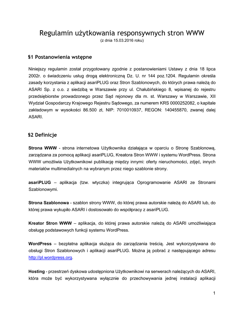 Regulamin użytkowania responsywnych stron WWW (z dnia 15.03.2016 roku) §1 Postanowienia wstępne Niniejszy regulamin został przygotowany zgodnie z postanowieniami Ustawy z dnia 18 lipca 2002r. o świadczeniu usług drogą elektroniczną Dz. U. nr 144 poz.1204. Regulamin określa zasady korzystania z aplikacji asariPLUG oraz Stron Szablonowych, do których prawa należą do ASARI Sp. z o.o. z siedzibą w Warszawie przy ul. Chałubińskiego 8, wpisanej do rejestru przedsiębiorstw prowadzonego przez Sąd rejonowy dla m. st. Warszawy w Warszawie, XII Wydział Gospodarczy Krajowego Rejestru Sądowego, za numerem KRS 0000252082, o kapitale zakładowym w wysokości 86.500 zł, NIP: 7010010937, REGON: 140455870, zwanej dalej ASARI. §2 Definicje Strona WWW - strona internetowa Użytkownika działająca w oparciu o Stronę Szablonową, zarządzana za pomocą aplikacji asariPLUG, Kreatora Stron WWW i systemu WordPress. Strona WWW umożliwia Użytkownikowi publikację między innymi: oferty nieruchomości, zdjęć, innych materiałów multimedialnych na wybranym przez niego szablonie strony. asariPLUG – aplikacja (tzw. wtyczka) integrująca Oprogramowanie ASARI ze Stronami Szablonowymi. Strona Szablonowa - szablon strony WWW, do której prawa autorskie należą do ASARI lub, do której prawa wykupiło ASARI i dostosowało do współpracy z asariPLUG. Kreator Stron WWW – aplikacja, do której prawa autorskie należą do ASARI umożliwiająca obsługę podstawowych funkcji systemu WordPress. WordPress – bezpłatna aplikacja służąca do zarządzania treścią. Jest wykorzystywana do obsługi Stron Szablonowych i aplikacji asariPLUG. Można ją pobrać z następującego adresu http://pl.wordpress.org. Hosting - przestrzeń dyskowa udostępniona Użytkownikowi na serwerach należących do ASARI, która może być wykorzystywana wyłącznie do przechowywania jednej instalacji aplikacji 1 asariPLUG, Stron Szablonowych i innych elementów wykorzystywanych w usłudze Strona WWW Użytkownika. Oprogramowanie ASARI - jedna z aplikacji internetowych należących do ASARI dedykowanych do obsługi biur nieruchomości, deweloperów lub zarządców nieruchomościami. Okres testowy - okres jednego bezpłatnego miesiąca korzystania z usługi Strona WWW liczony od momentu jej udostępnienia Użytkownikowi. Użytkownik może tylko jeden raz skorzystać z okresu testowego. Okres abonamentowy – miesięczny okres korzystania z usługi Strona WWW, za który Użytkownik wnosi na rzecz ASARI opłatę abonamentową zgodną z Cennikiem ASARI dostępnym pod adresem http://asari.pl/produkty/asariweb/cennik/. PayU.pl – system prowadzony przez PayU S.A z siedzibą w Poznaniu, przy ul. Grunwaldziej 182 wpisana do rejestru przedsiębiorców Krajowego Rejestru Sądowego prowadzonego przez Sąd Rejonowy Poznań –Nowe Miasto i Wilda w Poznaniu, VIII Wydział Gospodarczy Krajowego Rejestru Sądowego pod numerem KRS 0000274399, numer NIP 7792308495, REGON 300523444, kapitał zakładowy 4000000 PLN, kapitał wpłacony 4 000000 PLN, będąca dostawcą usług płatniczych w rozumieniu ustawy z dnia 19 sierpnia 2011 r. o usługach płatniczych, umożliwiający dokonywanie przez Użytkowników zapłaty na rzecz ASARI z tytułu usług, o których mowa w niniejszym Regulaminie. §3 Postanowienia ogólne 1. Do korzystania z usługi Strona WWW Użytkownik wykorzystuje następujące elementy: aplikację asariPLUG, Strony Szablonowe, Hosting, Kreator Stron WWW, system WordPress, Oprogramowanie ASARI. 2. Użytkownik ze Stron Szablonowych wybiera interesujący go szablon Strony WWW, a następnie za pomocą Kreatora Stron WWW lub systemu WordPress publikuje na niej interesujące go treści związane z prowadzoną działalnością w zakresie pośrednictwa obrotu nieruchomościami i zarządzania nieruchomościami. 3. Do korzystania z usługi Strona WWW wymagane jest posiadanie komputera lub innego urządzenia z zainstalowaną przeglądarką internetową oraz dostępem do Internetu. 4. Użytkownik w ramach używanego Oprogramowania ASARI może uruchomić jednocześnie tylko jedną Stronę WWW wykorzystującą aplikację asariPLUG. 2 5. Usługa Strona WWW jest dostępna tylko dla Użytkowników korzystających z Oprogramowania ASARI. Rezygnacja z korzystania z Oprogramowania ASARI jest równoznaczne z rezygnacją z korzystania z wszystkich wyżej wymienionych elementów składających się na Stronę WWW. 6. ASARI w ramach opłaty za usługę Strona WWW udziela Użytkownikowi niewyłącznej licencji w zakresie korzystania z aplikacji asariPLUG oraz Kreatora Stron WWW poprzez ich uruchamianie na serwerach ASARI w związku z zarządzaniem treścią Strony WWW. 7. Użytkownik zobowiązuje się nie udostępniać osobom trzecim usługi Strona WWW ani żadnego z jej elementów, o których mowa w pkt 1 wyżej, z wyłączeniem systemu WordPress. W przypadku naruszenia niniejszego postanowienia Użytkownik będzie zobowiązany do zapłaty na rzecz ASARI kary umownej w wysokości 10.000 zł (dziesięciu tysięcy złotych), za każdy przypadek naruszenia, w terminie 7 dni od dnia otrzymania wezwania od ASARI. §4 Płatności 1. Usługa Strona WWW jest udostępniana Użytkownikom odpłatnie, zgodnie z Cennikiem ASARI dostępnym pod adresem http://asari.pl/produkty/asariweb/cennik/. 2. Użytkownik dokonuje płatności za usługę Strona WWW za pomocą systemu PayU.PL za każdy Okres abonamentowy z góry. 3. Opłata za usługę Strona WWW będzie każdorazowo doliczana Użytkownikowi do opłat za inne usługi świadczone za pomocą Oprogramowania ASARI. 4. Po otrzymaniu opłaty, ASARI wystawi Użytkownikowi fakturę VAT, na doręczenie której w formie elektronicznej (dokument pdf) na adres poczty elektronicznej (e-mail) Użytkownik wyraża zgodę. 5. ASARI przed zakończeniem bieżącego Okresu abonamentowego poinformuje Użytkownika za pomocą wiadomości email o konieczności wniesienia opłaty za kolejny Okres abonamentowy. 6. W przypadku braku p