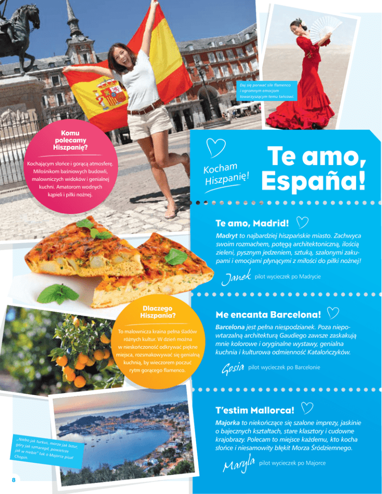 Daj się porwać sile flamenco i ogromnym emocjom towarzyszącym temu tańcowi. Komu polecamy Hiszpanię? Kochającym słońce i gorącą atmosferę. Miłośnikom baśniowych budowli, malowniczych widoków i genialnej kuchni. Amatorom wodnych kąpieli i piłki nożnej. Te amo, España! Kocham ! ię Hiszpan Te amo, Madrid! Madryt to najbardziej hiszpańskie miasto. Zachwyca swoim rozmachem, potęgą architektoniczną, ilością zieleni, pysznym jedzeniem, sztuką, szalonymi zakupami i emocjami płynącymi z miłości do piłki nożnej! Janek Dlaczego Hiszpania? To malownicza kraina pełna śladów różnych kultur. W dzień można w nieskończoność odkrywać piękne miejsca, rozsmakowywać się genialną kuchnią, by wieczorem poczuć rytm gorącego flamenco. pilot wycieczek po Madrycie Me encanta Barcelona! Barcelona jest pełna niespodzianek. Poza niepowtarzalną architekturą Gaudiego zawsze zaskakują mnie kolorowe i oryginalne wystawy, genialna kuchnia i kulturowa odmienność Katalończyków. Gosia pilot wycieczek po Barcelonie T’estim Mallorca! „Niebo ja k turkus , mor ze ja góry jak k lazur, szmarag d, powie jak w nie tr ze bie” tak o M aj orce pisa Chopin. ł 8 Majorka to niekończące się szalone imprezy, jaskinie o bajecznych kształtach, stare klasztory i cudowne krajobrazy. Polecam to miejsce każdemu, kto kocha słońce i niesamowity błękit Morza Śródziemnego. yla Mar pilot wycieczek po Majorce