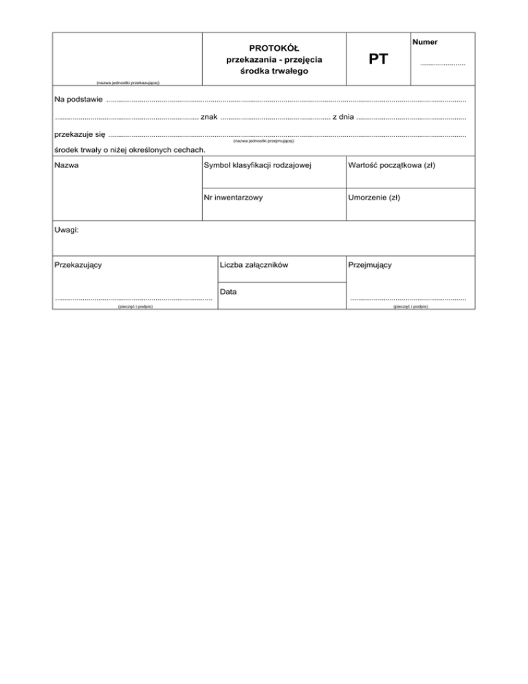 PROTOKÓŁ przekazania - przejęcia środka trwałego Numer PT ....................... (nazwa jednostki przekazującej) Na podstawie ....................................................................................................................................................................................... ......................................................................... znak ........................................................ z dnia ........................................................ przekazuje się ...................................................................................................................................................................................... (nazwa jednostki przejmującej) środek trwały o niżej określonych cechach. Nazwa Symbol klasyfikacji rodzajowej Wartość początkowa (zł) Nr inwentarzowy Umorzenie (zł) Uwagi: Przekazujący Liczba załączników ................................................................................ (pieczęć i podpis) Data Przejmujący ........................................................... (pieczęć i podpis)