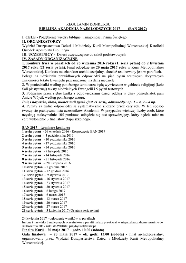 REGULAMIN KONKURSU BIBLIJNA AKADEMIA NAJMŁODSZYCH 2017 - (BAN 2017) I. CELE - Pogłębienie wiedzy biblijnej i znajomości Pisma Świętego. II. ORGANIZATORZY Wydział Duszpasterstwa Dzieci i Młodzieży Kurii Metropolitalnej Warszawskiej Katolicki Ośrodek Apostolatu Biblijnego. III. UCZESTNICY - Dzieci uczęszczające do szkół podstawowych IV. ZASADY ORGANIZACYJNE 1. Konkurs trwa w parafiach od 25 września 2016 roku (1. seria pytań) do 2 kwietnia 2017 roku (21 seria pytań). Finał odbędzie się 20 maja 2017 roku w Kurii Metropolitalnej Warszawskiej. Konkurs ma charakter archidiecezjalny, chociaż realizowany jest w parafiach. Polega na udzieleniu prawidłowych odpowiedzi na pięć pytań testowych dotyczących znajomości tekstu Ewangelii przeznaczonej na daną niedzielę. 2. W poniedziałki według poniższego terminarza będą wywieszane w gablocie religijnej (koło Sali plastycznej) teksty niedzielnych Ewangelii i 5 pytań testowych. 3. Podpisane przez siebie kartki z odpowiedziami dzieci oddają w dany poniedziałek pani Anicie Wójcik według poniższego wzoru: Imię i nazwisko, klasa, numer serii pytań (jest 21 serii), odpowiedzi: np. 1 – a, 2 – d itp. 4. Punkty za trafne odpowiedzi są systematycznie zliczane przez cały rok. W ten sposób tworzy się praktyczna lista uczestników Akademii. W przypadku większej liczby osób, które uzyskają maksymalnie 105 punktów, odbędzie się test sprawdzający, który będzie miał na celu wyłonienie 3 finalistów etapu szkolnego. BAN 2017 – terminarz konkursu 1 seria pytań - 26 września 2016 - Rozpoczęcie BAN 2017 2 seria pytań - 3 października 2016 3 seria pytań - 10 października 2016 4 seria pytań - 17 października 2016 5 seria pytań - 24 października 2016 6 seria pytań - 7 listopada 2016 7 seria pytań - 14 listopada 2016 8 seria pytań - 21 listopada 2016 9 seria pytań – 28 listopada 2016 10 seria pytań - 5 grudnia 2016 11 seria pytań - 12 grudnia 2016 12 seria pytań – 9 stycznia 2017 13 seria pytań - 16 stycznia 2017 14 seria pytań - 23 stycznia 2017 15 seria pytań - 30 stycznia 2017 16 seria pytań - 6 lutego 2017 17 seria pytań - 6 marca 2017 18 seria pytań - 13 marca 2017 19 seria pytań - 20 marca 2017 20 seria pytań - 27 marca 2017 21 seria pytań - 3 kwietnia 2017 (Ostatnia seria pytań) 24 kwietnia 2017 - ogłoszenie wyników w parafiach Imiona i nazwiska 3 najlepszych uczestników z parafii należy przekazać w nieprzekraczalnym terminie do 30 kwietnia 2017 roku do WDDiM: [email protected] Finał w Kurii – 20 maja 2017 – godz. 10.00 (sobota) Gala finałowa – 20 maja 2017 – ok. godz. 13.00 (sobota) - finał archidiecezjalny, organizowany przez Wydział Duszpasterstwa Dzieci i Młodzieży Kurii Metropolitalnej Warszawskiej. REGULAMIN KONKURSU BIBLIJNA AKADEMIA NAJMŁODSZYCH 2017 - (BAN 2017) I. CELE - Pogłębienie wiedzy biblijnej i znajomości Pisma Świętego. II. ORGANIZATORZY Wydział Duszpasterstwa Dzieci i Młodzieży Kurii Metropolitalnej Warszawskiej Katolicki Ośrodek Apostolatu Biblijnego. III. UCZESTNICY - Dzieci uczęszczające do szkół podstawowych IV. ZASADY ORGANIZACYJNE 1. Konkurs trwa w parafiach od 25 września 2016 roku (1. seria pytań) do 2 kwietnia 2017 roku (21 seria pytań). Finał odbędzie się 20 maja 2017 roku w Kurii Metropolitalnej Warszawskiej. Konkurs ma charakter archidiecezjalny, chociaż realizowany jest w parafiach. Polega na udzieleniu prawidłowych odpowiedzi na pięć pytań testowych dotyczących znajomości tekstu Ewangelii przeznaczonej na daną niedzielę. 2. W poniedziałki według poniższego terminarza będą wywieszane w gablocie religijnej (koło Sali plastycznej) teksty niedzielnych Ewangelii i 5 pytań testowych. 3. Podpisane przez siebie kartki z odpowiedziami dzieci oddają w dany poniedziałek pani Anicie Wójcik według poniższego wzoru: Imię i nazwisko, klasa, numer serii pytań (jest 21 serii), odpowiedzi: np. 1 – a, 2 – d itp. 4. Punkty za trafne odpowiedzi są systematycznie zliczane przez cały rok. W ten sposób tworzy się praktyczna lista uczestników Akademii. W przypadku większej liczby osób, które uzyskają maksymalnie 105 punktów, odbędzie się test sprawdzający, który będzie miał na celu wyłonienie 3 finalistów etapu szkolnego. BAN 2017 – terminarz konkursu 1 seria pytań - 26 września 2016 - Rozpoczęcie BAN 2017 2 seria pytań - 3 października 2016 3 seria pytań - 10 października 2016 4 seria pytań - 17 października 2016 5 seria pytań - 24 października 2016 6 seria pytań - 7 listopada 2016 7 seria pytań - 14 listopada 2016 8 seria pytań - 21 listopada 2016 9 seria pytań – 28 listopada 2016 10 seria pytań - 5 grudnia 2016 11 seria pytań - 12 grudnia 2016 12 seria pytań – 9 stycznia 2017 13 seria pytań - 16 stycznia 2017 14 seria pytań - 23 stycznia 2017 15 seria pytań - 30 stycznia 2017 16 seria pytań - 6 lutego 2017 17 seria pytań - 6 marca 2017 18 seria pytań - 13 marca 2017 19 seria pytań - 20 marca 2017 20 seria pytań - 27 marca 2017 21 seria pytań - 3 kwietnia 2017 (Ostatnia seria pytań) 24 kwietnia 2017 - ogłoszenie wyników w parafiach Imiona i nazwiska 3 najlepszych uczestników z parafii należy przekazać w nieprzekraczalnym terminie do 30 kwietnia 2017 roku do WDDiM: [email protected] Finał w Kurii – 20 maja 2017 – godz. 10.00 (sobota) Gala finałowa – 20 maja 2017 – ok. godz. 13.00 (sobota) - finał archidiecezjalny, organizowany przez Wydział Duszpasterstwa Dzieci i Młodzieży Kurii Metropolitalnej Warszawskiej.