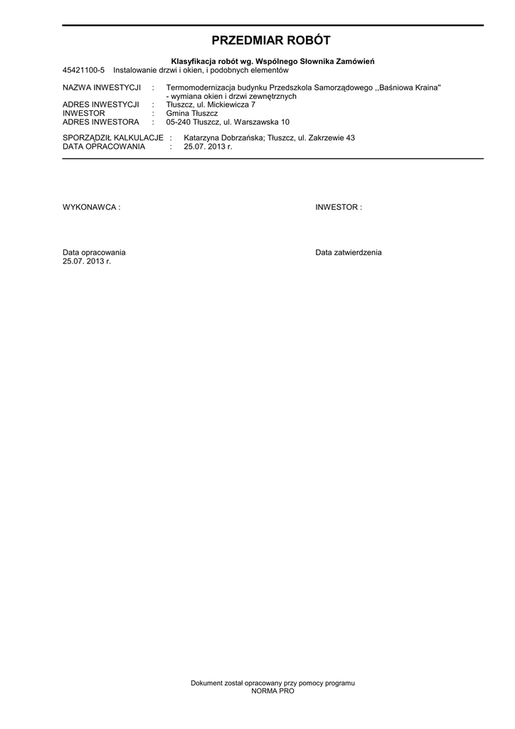 Przedszkole - wymiana okien - przedmiar