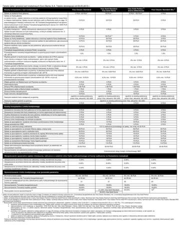 Tabela opłat i prowizji kart kredytowych Euro Banku S.A. Tabela obowiązuje od 09.05.2013 r. Visa Classic Standard Visa Gold Standard Visa Gold Home Visa Gold Perfect 3) (karta zbliżeniowa) Visa Classic Standard Bis 4) 0 PLN / 30 PLN 1) 50 PLN 2) 0 PLN / 150 PLN 1) 0 PLN 15 PLN 50 PLN 25 PLN 0 PLN b) opłata miesięczna – opłata naliczana po zakończonym Cyklu rozliczeniowym. Opłata nie jest naliczana za Cykl rozliczeniowy, w którym zostały rozliczone min. 3 transakcje dokonane za pomocą Karty 0 PLN 0 PLN 0 PLN 5 PLN Wydanie Karty dodatkowej 15 PLN 50 PLN 2) 0 PLN 0 PLN Opłata za Kartę dodatkową - opłata naliczana w rocznicę wydania Karty dodatkowej 15 PLN 50 PLN 25 PLN 0 PLN Wydanie nowej karty w miejsce zastrzeżonej (opłata nie jest pobierana, gdy przyczyna wydania leży po stronie eurobanku) 15 PLN 50 PLN 25 PLN 25 PLN Wydanie duplikatu karty (opłata nie jest pobierana, gdy przyczyna wydania leży po stronie eurobanku) 15 PLN 50 PLN 25 PLN 25 PLN Transakcje bezgotówkowe na terenie Polski i za granicą 0 PLN 0 PLN 0 PLN 0 PLN Przewalutowanie transakcji bezgotówkowych za granicą poza krajami członkowskimi UE i EFTA 1,5% 1,5% 1,5% 1,5% Wypłata gotówki w bankomacie eurobanku – opłata obniżana do 2 PLN, poprzez zwrot różnicy w kolejnym Cyklu rozliczeniowym, jeśli w tym samym Cyklu rozliczeniowym, w którym rozliczono wypłatę, rozliczono na Rachunku karty min. 3 Transakcje bezgotówkowe 3% min. 5 PLN 3% min. 5 PLN 3% min. 5 PLN 3% min. 5 PLN Wypłata gotówki w Bankomacie banku obcego na terenie Polski, w placówce obcego banku, urzędu pocztowego lub innej instytucji finansowej na terenie Polski 3% min. 5 PLN 3% min. 5 PLN 3% min. 5 PLN 3% min. 5 PLN Wypłata gotówki w Bankomacie za granicą, w placówce banku lub innej instytucji finansowej za granicą w krajach członkowskich UE i EFTA 3% min. 9,95 PLN 3% min. 9,95 PLN 3% min. 9,95 PLN 3% min. 9,95 PLN Wypłata gotówki w Bankomacie za granicą, w placówce banku lub innej instytucji finansowej za granicą poza krajami członkowskimi UE i EFTA, w tym za przewalutowanie transakcji 4,5% min. 10 PLN 4,5% min. 10 PLN 4,5% min. 10 PLN 4,5% min. 10 PLN Koszty korzystania z kart kredytowych Opłata za wydanie Karty głównej Opłata za Kartę główną a) opłata roczna – opłata naliczana w rocznicę zawarcia Umowy/wydania nowej Karty w miejsce zastrzeżonej. Opłata nie jest naliczana, jeśli na Rachunku karty w ciągu 12 poprzedzających miesięcy rozliczono min. 35 Transakcji bezgotówkowych lub łączna kwota rozliczonych w tym okresie Transakcji bezgotówkowych wynosi min. 6000 PLN (dla kart Gold min. 12000 PLN) Wpłata gotówki we Wpłatomacie lub Placówce eurobanku 0 PLN 0 PLN 0 PLN 0 PLN Zastrzeżenie karty 0 PLN 0 PLN 0 PLN 0 PLN Zmiana PIN w Bankomatach eurobanku 1,95 PLN 1,95 PLN 1,95 PLN 1,95 PLN Sprawdzenie salda w Bankomatach eurobanku 1 PLN 1 PLN 1 PLN 1 PLN Zmiana limitów transakcyjnych 0 PLN 0 PLN 0 PLN 0 PLN Kopia rachunku obciążeniowego 15 PLN 15 PLN 15 PLN 15 PLN zgodnie ze stawką pobieraną przez Visa, aktualnie 160 USD zgodnie ze stawką pobieraną przez Visa, aktualnie 180 USD zgodnie ze stawką pobieraną przez Visa, aktualnie 180 USD zgodnie ze stawką pobieraną przez Visa, aktualnie 160 USD Awaryjne wydanie karty zastępczej za granicą Awaryjna wypłata gotówki za granicą Zgodnie ze stawką pobieraną przez Visa, aktualnie 100 USD Pakiet ubezpieczeń podstawowych 0 PLN 0 PLN 0 PLN 0 PLN Zestawienie transakcji dla Karty głównej (w formie papierowej lub elektronicznej) 0 PLN 0 PLN 0 PLN 0 PLN Zestawienie transakcji dla Karty dodatkowej (w formie papierowej lub elektronicznej) 0 PLN 0 PLN 0 PLN 0 PLN Duplikat Zestawienia transakcji dla karty głównej i dodatkowej (w formie papierowej) 2 PLN 2 PLN 2 PLN 2 PLN Zmiana Limitu kredytowego na wniosek Klienta 5 PLN 5 PLN 5 PLN 5 PLN Zmiana Limitu kredytowego na wniosek eurobanku 0 PLN 0 PLN 0 PLN 0 PLN Opłata za sporządzenie i wysłanie informacji o przekroczeniu limitu kredytowego 15 PLN 15 PLN 15 PLN 15 PLN Usługa powiadomień SMS 0 PLN 0 PLN 0 PLN 0 PLN Koszty korzystania z Limitu kredytowego Opłata za restrukturyzację zadłużenia 0,5 % zadłużenia pozostałego do spłaty, nie mniej niż 20 PLN Opłata za sporządzenie na wniosek Klienta odpisu umowy karty 50 PLN 50 PLN 50 PLN 50 PLN Opłata za sporządzenie opinii o obsłudze karty 50 PLN 50 PLN 50 PLN 50 PLN Opłata za sporządzenie i wysłanie wezwania do zapłaty Minimalnej kwoty spłaty 15 PLN 15 PLN 15 PLN 15 PLN Opłata za sporządzenie i wysłanie monitu listem zwykłym 15 PLN 15 PLN 15 PLN 15 PLN Opłata za sporządzenie i wysłanie monitu listem poleconym 18 PLN 18 PLN 18 PLN 18 PLN Opłata za wystawienie Bankowego Tytułu Egzekucyjnego 70 PLN 70 PLN 70 PLN 70 PLN Opłata za windykacyjną wizytę terenową 110 PLN 110 PLN 110 PLN 110 PLN 20-50 PLN 20-50 PLN 20-50 PLN 20-50 PLN Opłata administracyjna stanowiąca koszt pozyskania danych (w zależności od rzeczywistych kosztów) Oprocentowanie od zadłużenia przeterminowanego (pobierane od momentu uprawomocnienia się wypowiedzenia umowy) Czterokrotność stopy kredytu lombardowego NBP Ubezpieczenie opcjonalne (opłata miesięczna, naliczona w ostatnim dniu Cyklu rozliczeniowego od kwoty zadłużenia na Zestawieniu transakcji) Ubezpieczenie od śmierci klienta lub całkowitej i trwałej niezdolności do pracy 0,30% 0,30% 0,30% 0,30% Ubezpieczenie od śmierci klienta lub całkowitej i trwałej niezdolności do pracy oraz utraty pracy 0,43% 0,43% 0,43% 0,43% Ubezpieczenie od śmierci klienta lub całkowitej i trwałej niezdolności do pracy oraz czasowej niezdolności od pracy 0,43% 0,43% 0,43% 0,43% 5% min. 30 PLN 5% min. 30 PLN do 52 dni do 52 dni Oprocentowanie Limitu kredytowego oraz pozostałe parametry Minimalna kwota spłaty Okres bezodsetkowy dla Transakcji bezgotówkowych Liczba dni następujących po dniu zakończenia cyklu rozliczeniowego do wyznaczenia Terminu płatności 5% min. 30 PLN do 56 dni 21 21