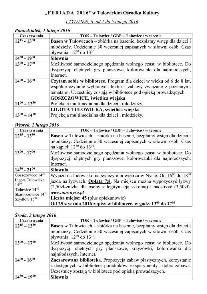 „ F E R I A D A 2 0 1 6 ” w Tułowickim Ośrodku Kultury I TYDZIEŃ, tj. od 1 do 5 lutego 2016 Poniedziałek, 1 lutego 2016 TOK – Tułowice / GBP – Tułowice / w terenie Czas trwania 15 30 12 - 13 1430 - 1900 1300 - 1700 1400 - 1600 1100 – 1230 1300 – 1430 Basen w Tułowicach – zbiórka na basenie, bezpłatny wstęp dla dzieci i młodzieży. Codziennie 30 wcześniej zapisanych w siłowni osób. Czas pływania: 1230 do 1330. Siłownia Możliwość samodzielnego spędzania wolnego czasu w bibliotece. Do dyspozycji chętnych gry planszowe, kolorowanki dla najmłodszych, Internet. Czytam sobie w bibliotece. Program dla dzieci w wieku od 6 do 8 lat, wspólne czytanie wybranych lektur i zabawy związane z poznanymi tematami. Uczestnicy zostają w bibliotece pod opieką prowadzących. GOSZCZOWICE, świetlica wiejska Projekcja multimedialna dla dzieci i młodzieży. LIGOTA TUŁOWICKA, świetlica wiejska Projekcja multimedialna dla dzieci i młodzieży. Wtorek, 2 lutego 2016 TOK – Tułowice / GBP – Tułowice / w terenie Czas trwania 15 30 12 - 13 1300 - 1700 1430 - 2100 Goszczowice 1420 Ligota Tułowicka 1430 Tułowice 1440 Skarbiszowice 1450 Szydłów 1500 Basen w Tułowicach – zbiórka na basenie, bezpłatny wstęp dla dzieci i młodzieży. Codziennie 30 wcześniej zapisanych w siłowni osób. Czas na kąpiel: 1230 do 1330. Możliwość samodzielnego spędzania wolnego czasu w bibliotece. Do dyspozycji chętnych gry planszowe, kolorowanki dla najmłodszych, Internet. Siłownia Wyjazd na lodowisko na świeżym powietrzu w Nysie. Od 1600 do 1800 jazda na łyżwach. Opłata 7zł. Na miejscu można wypożyczyć łyżwy (2,50zł-zniżka dla osoby z legitymacją szkolną) i naostrzyć (3,50zł). www.nor.nysa.pl Liczba miejsc: 45 (plus opiekunowie) Od 25 stycznia 2016 zapisy w bibliotece, w godz. 1300 do 1700 Środa, 3 lutego 2016 Czas trwania 12 – 13 15 30 1300 – 1700 1400 - 1600 1430 – 1900 TOK – Tułowice / GBP – Tułowice / w terenie Basen w Tułowicach – zbiórka na basenie, bezpłatny wstęp dla dzieci i młodzieży. Codziennie 30 wcześniej zapisanych w siłowni osób. Czas pływania: 1230 do 1330. Możliwość samodzielnego spędzania wolnego czasu w bibliotece. Do dyspozycji chętnych gry planszowe, krzyżówki, kolorowanki dla najmłodszych, Internet. Zaczarowana biblioteka. Propozycja zabaw plastycznych, korzystanie z dostępnych w bibliotece poradników, eksperymenty i dobra zabawa. Uczestnicy zostają w bibliotece pod opieką prowadzących. Siłownia Czwartek, 4 lutego 2016 TOK – Tułowice / GBP – Tułowice / w terenie Czas trwania 12 – 13 15 30 Goszczowice 910 Ligota Tułowicka 920 Tułowice 930 Skarbiszowice 940 Szydłów 950 1300 - 1700 1430 – 2000 Basen w Tułowicach – zbiórka na basenie, bezpłatny wstęp dla dzieci i młodzieży. Codziennie 30 wcześniej zapisanych w siłowni osób. Czas pływania: 1230 do 1330. Wyjazd do Opola, do kina. Seans” Odlotowa przygoda” o godz. 1100. Cena 13zł. Zbiórka w holu TOK o godz.920. Liczba miejsc: 45 (plus opiekunowie) Od 25 stycznia 2016 zapisy w bibliotece, w godz. 1300 do 1700 Możliwość samodzielnego spędzania wolnego czasu w bibliotece. Do dyspozycji chętnych gry planszowe, kolorowanki dla najmłodszych, Internet. Siłownia Piątek, 5 lutego 2016 Czas trwania 1100 - 1300 1215 – 1330 1430 – 1900 1300 – 1700 1130 – 1300 1400 – 1530 TOK – Tułowice / GBP – Tułowice / w terenie Zabawa na orientację „Zielony punkt”. Śnieg i mróz nie stanowią dla nas przeszkody. Bawimy się w lesie, grunt to ciepłe buty i wełniane rękawice. Basen w Tułowicach – zbiórka na basenie, bezpłatny wstęp dla dzieci i młodzieży. Codziennie 30 wcześniej zapisanych w siłowni osób. Czas pływania: 1230 do 1330. Siłownia Możliwość samodzielnego spędzania wolnego czasu w bibliotece. Do dyspozycji chętnych gry planszowe, krzyżówki, kolorowanki dla najmłodszych, Internet. TUŁOWICE MAŁE, świetlica wiejska Projekcja multimedialna dla dzieci i młodzieży. TUŁOWICE, mała sala TOK Ul. Świerczewskiego 6a, wejście od kiosku Ruchu Projekcja multimedialna dla dzieci i młodzieży.