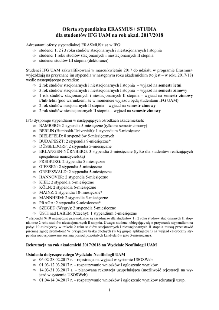 Oferta stypendialna ERASMUS+ STUDIA dla studentów IFG UAM na rok akad. 2017/2018 Adresatami oferty stypendialnej ERASMUS+ są w IFG: • studenci 1, 2 i 3 roku studiów stacjonarnych i niestacjonarnych I stopnia • studenci 1 roku studiów stacjonarnych i niestacjonarnych II stopnia • studenci studiów III stopnia (doktoranci) Studenci IFG UAM zakwalifikowani w marcu/kwietniu 2017 do udziału w programie Erasmus+ wyjeżdżają na przyznane im stypendia w następnym roku akademickim (to jest – w roku 2017/18) wedle następującego porządku: • 2 rok studiów stacjonarnych i niestacjonarnych I stopnia – wyjazd na semestr letni • 3 rok studiów stacjonarnych i niestacjonarnych I stopnia – wyjazd na semestr zimowy • 1 rok studiów stacjonarnych i niestacjonarnych II stopnia – wyjazd na semestr zimowy i/lub letni (pod warunkiem, że w momencie wyjazdu będą studentami IFG UAM) • 2 rok studiów stacjonarnych II stopnia – wyjazd na semestr zimowy • 2 rok studiów niestacjonarnych II stopnia – wyjazd na semestr zimowy IFG dysponuje stypendiami w następujących ośrodkach akademickich: • BAMBERG: 2 stypendia 5-miesięczne (tylko na semestr zimowy) • BERLIN (Humboldt-Universität): 1 stypendium 5-miesięczne • BIELEFELD: 8 stypendiów 5-miesięcznych • BUDAPESZT: 2 stypendia 9-miesięczne* • DÜSSELDORF: 2 stypendia 5-miesięczne • ERLANGEN-NÜRNBERG: 3 stypendia 5-miesięczne (tylko dla studentów realizujących specjalność nauczycielską) • FREIBURG: 2 stypendia 5-miesięczne • GIESSEN: 2 stypendia 5-miesięczne • GREIFSWALD: 2 stypendia 5-miesięczne • HANNOVER: 2 stypendia 5-miesięczne • KIEL: 2 stypendia 6-miesięczne • KÖLN: 2 stypendia 6-miesięczne • MAINZ: 2 stypendia 10-miesięczne* • MANNHEIM: 2 stypendia 5-miesięczne • PRAGA: 2 stypendia 9-miesięczne* • SZEGED (Węgry): 2 stypendia 5-miesięczne • ÚSTI nad LABEM (Czechy): 1 stypendium 5-miesięczne * stypendia 9/10 miesięczne przewidziane są zasadniczo dla studentów 1 i 2 roku studiów stacjonarnych II stopnia oraz 2 roku studiów niestacjonarnych II stopnia. Uwaga: studenci ubiegający się o przyznanie stypendium na pobyt 10-miesięczny w trakcie 2 roku studiów stacjonarnych i niestacjonarnych II stopnia muszą przedstawić pisemną zgodę promotora! W przypadku braku chętnych (w tej grupie aplikujących) na wyjazd całoroczny stypendia rozdysponowane zostaną pośród pozostałych kandydatów jako 5-miesięczne). Rekrutacja na rok akademicki 2017/2018 na Wydziale Neofilologii UAM Ustalenia dotyczące całego Wydziału Neofilologii UAM • 06.02-28.02.2017 r. – rejestracja na wyjazd w systemie USOSWeb • 01.03-12.03.2017 r. – rozpatrywanie wniosków i ogłoszenie wyników • 14.03-31.03.2017 r. – planowana rekrutacja uzupełniająca (możliwość rejestracji na wyjazd w systemie USOSWeb) • 01.04-14.04.2017 r. – rozpatrywanie wniosków i ogłoszenie wyników rekrutacji uzup. 1 Dokumenty i wymagania: • Zgłoszenie chęci wyjazdu w systemie USOSWeb (UWAGA: Proszę nie czekać z rejestracją wniosku w USOSWeb do ostatniego dnia!) • Maksymalna liczba wybieranych uczelni: 3 (według preferencji) • Studenci składają u Koordynatora Instytutowego zaświadczenie z dziekanatu o średniej ocen z dotychczasowego przebiegu studiów • Doktoranci są zobowiązani do dostarczenia zgody promotora i kierownika zakładu na wyjazd w ramach Erasmusa (do Koordynatora Instytutowego). Aktualny regulamin oraz dalsze informacje, z którymi koniecznie należy się zapoznać przed złożeniem wniosku, a także instrukcja logowania w USOS znajdują się na stronie Instytutu Filologii Germańskiej w zakładce Dla studentów>stypendia>Erasmus+ oraz na stronie Wydziału Neofilologii UAM w zakładce ERASMUS+ > Studia Dodatkowe ustalenia obowiązujące w IFG Po zarejestrowaniu wniosku aplikacyjnego w USOSWeb kandydaci zobowiązani są ponadto złożyć (do 28.02.2017) na ręce Koordynatora Instytutowego w IFG: • zaświadczenie z dziekanatu o średniej ocen (studenci 1 roku studiów I stopnia dostarczają kartę przebiegu studiów poświadczoną przez dziekanat) • wypełniony na komputerze, wydrukowany i podpisany formularz kwalifikacyjny; wersję elektroniczną (bez informacji o średniej) proszę przesłać w pliku edytowalnym (tj. nie pdf), już wcześniej na adres: [email protected] • kandydaci zdecydowani na 10-miesięczne studia w Mainz lub 9-miesięczne w Budapeszcie lub w Pradze muszą przedstawić pisemną zgodę promotora pracy magisterskiej • doktoranci dostarczają pisemną zgodę promotora i kierownika zakładu na wyjazd w ramach Erasmus+ • Kandydatów z 1 roku studiów stacjonarnych I stopnia zapraszam na krótką rozmowę w języku niemieckim w celu określenia rokowań na pomyślne ukończenie 1 roku studiów (jego niezaliczenie wyklucza bowiem udział w programie Erasmus, a w konsekwencji oznacza niewykorzystanie stypendium pozostającego w gestii IFG) Jestem do Państwa dyspozycji w trakcie moich konsultacji (w czasie sesji zimowej i przerwy semestralnej w środę 8.02 i 15.02 od 10.30 do 11.30. Późniejsze terminy podane zostaną w USOS). Osoby zainteresowane programem Erasmus zapraszam do pokoju 514. Kontakt mailowy: [email protected] Koordynator ERASMUS+ w Instytucie Filologii Germańskiej UAM dr Michał Stefański Proszę w trakcie i po rekrutacji śledzić aktualne ogłoszenia na stronie IFG w zakładce Studia>Stypendia>Erasmus+. Tam znajdują się także formularze do pobrania, regulamin oraz instrukcja rejestracji wniosku w USOSWeb. Najważniejsze informacje są również wywieszone w gablocie na V piętrze. Informacja o ew. przyznaniu/nieprzyznaniu wyjazdu widoczna będzie w systemie USOS oraz zostanie rozesłana na Państwa adresy mailowe. Także po zakończeniu rejestracji i ogłoszeniu wyników należy regularnie sprawdzać swoją skrzynką pocztową @amu.edu.pl – tą drogą będą Państwo otrzymywać informacje od Wydziałowego Koo