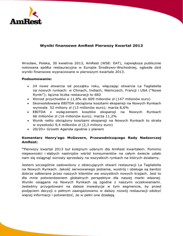 Wyniki finansowe AmRest Pierwszy Kwartał 2013 Wrocław, Polska, 30 kwietnia 2013, AmRest (WSE: EAT), największa publicznie notowana spółka restauracyjna w Europie Środkowo-Wschodniej, ogłosiła dziś wyniki finansowe wypracowane w pierwszym kwartale 2013. Podsumowanie: 24 nowe otwarcia od początku roku, włączając otwarcia La Tagliatella na nowych rynkach: w Chinach, Indiach, Niemczech, Francji i USA (“Nowe Rynki”); łączna liczba restauracji to 682 Wzrost przychodów o 11,8% do 609 milionów zł (147 milionów euro) Skonsolidowana EBITDA obciążona kosztami ekspansji na Nowych Rynkach wyniosła 52 miliony zł (13 milionów euro); marża 8,6% EBITDA z wyłączeniem kosztów ekspansji na Nowych Rynkach 66 milionów zł (16 milionów euro); marża 11,2% Wynik netto obciążony kosztami ekspansji na Nowych Rynkach to strata w wysokości 9,4 millonów zł (2,3 miliony euro) 20/20+ Growth Agenda zgodnie z planem Komentarz Henry’ego McGovern, Przewodniczącego Rady Nadzorczej AmRest: “Pierwszy kwartał 2013 był kolejnym udanym dla AmRest kwartałem. Pomimo niepewności i słabych nastrojów wśród konsumentów na całym świecie udało nam się osiągnąć wzrosty sprzedaży na wszystkich rynkach na których działamy. Jestem szczególnie zadowolony z obiecujących otwarć restauracji La Tagliatella na Nowych Rynkach. Jakość serwowanego jedzenia, wystrój i obsługa są bardzo dobrze odbierane przez naszych klientów we wszystkich nowych krajach. Jest to dla mnie potwierdzeniem globalnych perspektyw dla naszej marki własnej. Wyniki osiągane na Nowych Rynkach są zgodne z naszymi oczekiwaniami. Jesteśmy przygotowani na dalsze inwestycje w tym segmencie, by przed podjęciem decyzji o pełnym zaangażowaniu w dalszy rozwój restauracji zdobyć więcej informacji i potwierdzić, że w pełni one działają. Rosja jest w dalszym ciągu naszą najlepiej prosperującą dywizją. Wyniki sprzedaży na tym rynku systematycznie się poprawiają, dodatkowo zwiększamy nasze tempo otwarć. Sytuacja na innych rynkach poprawia się w porównaniu z początkiem roku. Nowo otwarte restauracje w największych miastach Hiszpanii osiągają bardzo dobre wyniki, podczas gdy mniejsze miasta są jeszcze ciągle pod presją. W Europie Środkowo Wschodniej po gorszym początku roku sytuacja zaczyna się poprawiać. Klienici są jednak w dalszym ciągu bardzo ostrożni i nastawieni na segment „value”. Patrząc w przyszłość jestem przekonany, że nasza strategia globalnego rozwoju AmRest przyniesie oczekiwane rezultaty.” Oczekiwania Zarząd AmRest jest optymistyczny w stosunku do przyszłości, z uwagi na pojawiające się sygnały poprawy sytuacji makroekonomicznej. Dodatkowo, obserwując inflację i stopy procentowe w okolicach historycznych minimów spodziewane jest osłabienie presji kosztowej w najbliższych miesiącach. Z uwagi na fakt, iż na głownych rynkach klienci są w dalszym ciągu bardzo wrażliwi na ceny, AmRest będzie skupiał się na oferowaniu produktów o bardzo korzystnym współczynniku ceny do jakości. Na nowych rynkach prowadzone będą działania mające na celu realizację planu dalszego rozwoju. W roku 2013 otwarte zostanie ponad 100 restauracji. Roczne nakłady inwestycyjne wyniosą około 400 mln zł. Strategicznie, w wyniku dobrych wyników sprzedażowych w Rosji w ostatnich dwunastu miesiącach, skupiamy sie na poszukiwaniach okazji do dalszego rozwoju istniejącego na tym rynku portfela restauracji i ich zasięgu. Informacje uzupełniające Pełen raport za pierwszy kwartał 2013 znajduje się na stronie www.amrest.eu Telekonferencja inwestorska odbędzie się 30 kwietnia 2013 o godzinie 15:00. W celu uczestnictwa w konferencji lub uzyskania odpowiedzi na dodatkowe pytania, proszę o kontakt: Dorota Surowiec IR Specialist +48 71 386 1235 [email protected]