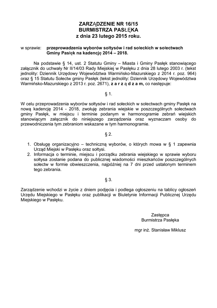 ZARZĄDZENIE NR 16/15 BURMISTRZA PASŁĘKA z dnia 23 lutego 2015 roku. w sprawie: przeprowadzenia wyborów sołtysów i rad so łeckich w so łectwach Gminy Pasłęk na kadencję 2014 – 2018. Na podstawie § 14, ust. 2 Statutu Gminy – Miasta i Gminy Pasłęk stanowiącego załącznik do uchwały Nr II/14/03 Rady Miejskiej w Pasłęku z dnia 28 lutego 2003 r. (tekst jednolity: Dziennik Urzędowy Województwa Warmińsko-Mazurskiego z 2014 r. poz. 964) oraz § 15 Statutu Sołectw gminy Pasłęk (tekst jednolity: Dziennik Urzędowy Województwa Warmińsko-Mazurskiego z 2013 r. poz. 2671), z a r z ą d z a m, co następuje: § 1. W celu przeprowadzenia wyborów sołtysów i rad sołeckich w sołectwach gminy Pasłęk na nową kadencję 2014 - 2018, zwołuję zebrania wiejskie w poszczególnych sołectwach gminy Pasłęk, w miejscu i terminie podanym w harmonogramie zebrań wiejskich stanowiącym załącznik do niniejszego zarządzenia oraz wyznaczam osoby do przewodniczenia tym zebraniom wskazane w tym harmonogramie. § 2. 1. Obsługę organizacyjno – techniczną wyborów, o których mowa w § 1 zapewnia Urząd Miejski w Pasłęku oraz sołtysi. 2. Informacja o terminie, miejscu i porządku zebrania wiejskiego w sprawie wyboru sołtysa zostanie podana do publicznej wiadomości mieszkańców poszczególnych sołectw w formie obwieszczenia, najpóźniej na 7 dni przed ustalonym terminem tego zebrania. § 3. Zarządzenie wchodzi w życie z dniem podjęcia i podlega ogłoszeniu na tablicy ogłoszeń Urzędu Miejskiego w Pasłęku oraz publikacji w Biuletynie Informacji Publicznej Urzędu Miejskiego w Pasłęku. Zastępca Burmistrza Pasłęka mgr inż. Stanisław Miklusz Załącznik do Zarządzenia Nr 16/15 Burmistrza Pasłęka z dnia 23.02.2015 r. HARM ON OG RAM zebrań wiejskich w sołectwach na terenie Gminy Pasłęk, zwołanych w celu przeprowadzenia wyborów organów wykonawczych tych sołectw ( sołtysów, rad sołeckich) na kadencję 2014 – 2018 L.p. 1. Nazwa Sołectwa - imię i nazwisko sołtysa 2. Termin zebrania Godzina odbycia zebrania Miejsce zebrania 3. 4. 5. Osoba Inne wyznaczona do postanowie przeprowadzenia nia i uwagi zebrania 6. 1 Nowa Wieś - Piotr Becmer 02.03.2015 r. 16,00 Warsztat stolarski Sołtysa Piotr Szczepkowski 2 Krasin - Tomasz Koralewski 02.03.2015 r. 18,30 Świetlica wiejska w Krasinie Damian Bereżański 3 Stegny - Wanda Krygier 03.03.2015 r. 17,00 Świetlica wiejska w Stegnie Damian Bereżański 4 Nowe Kusy - Stanisław Wiśniewski 03.03.2015 r. 17,00 Biuro ANR Damian Bereżański 5 Rogowo - Aleksander Barszcz 04.03.2015 r. 17,00 Mieszkanie Sołtysa Kazimierz Lipnicki 6 Zielony Grąd - Roman Andrzejewski 05.03.2015 r. 10,00 Mieszkanie Sołtysa Eugeniusz Andrusewicz 7. 7 Brzeziny - Marzena Choma 06.03.2015 r. 15,00 Mieszkanie Sołtysa Grzegorz Orłowski 8 Leszczyna - Katarzyna Brzozowska 09.03.2015 r. 10,00 Mieszkanie Sołtysa Piotr Szczepkowski 9 Sałkowice - Józef Kosacz 10.03.2015 r. 12,00 Świetlica wiejska w Sałkowicach Piotr Szczepkowski 10 Awajki - Barbara Moskwa 11.03.2015 r. 14,00 Plac zabaw w Awajkach Kazimierz Lipnicki 11 Kronin - Alina Odżga 16.03.2015 r. 16,00 Świetlica wiejska w Kroninie Grzegorz Orłowski 12 Krosno - Wacław Furtak 17.03.2015 r. 17,00 Sklep P. Furtak Patryk Kwieciński 13 Łukszty - Kryspin Miłkowski 18.03.2015 r. 18,00 Świetlica wiejska w Łuksztach Piotr Szczepkowski 14 Piniewo - Teresa Bryguła 19.03.2015 r. 17,00 Mieszkanie sołtysa Deonizy Krasiński 15 Aniołowo - Zbigniew Cieśla 20.03.2015 r. 19,30 Świetlica wiejska w Aniołowie Damian Bereżański 16 Rogajny - Adam Buska 21.03.2015 r. 19,00 Świetlica wiejska w Rogajnach Damian Bereżański 17 Borzynowo - Dorota Kozłowska 23.03.2015 r. 16,00 Świetlica Borzynowie 18 Rzeczna - Ryszard Wolicki 24.03.2015 r. 17,00 Świetlica wiejska w Rzecznej Damian Bereżański 19 Marianka 25.03.2015 r. 15,00 Świetlica wiejska w Mariance Damian wiejska w Damian Bereżański - Teresa Kapłon Bereżański 20 Gołąbki - Małgorzata Wolfram 27.03.2015 r. 17,00 Mieszkanie sołtysa Damian Bereżański 21 Kopina - Grzegorz Krajewski 28.03.2015 r. 15,00 Mieszkanie sołtysa Grzegorz Orłowski 22 Bądy - Ryszard Trusiło 30.03.2015 r. 14,00 Mieszkanie sołtysa Eugeniusz Ośka 23 Nowy Cieszyn - Józef But 31.03.2015 r. 9,00 Mieszkanie sołtysa Patryk Kwieciński 24 Rzędy - Aneta Wiżyń 07.04.2015 r. 16,00 Wiata w Rzędach Patryk Kwieciński 25 Rydzówka - Eliza Tararuj 08.04.2015 r. 18,00 Plac zabaw w Rydzówce Patryk Kwieciński 26 Anglity Stefan Czerniak 09.04.2015 r. 15,00 Mieszkanie sołtysa Eugeniusz Ośka 27 Zielonka Pasłęcka - Krystyna Krasińska 10.04.2015 r. 18,00 Świetlica wiejska w Zielonce Piotr Pasłęckiej Szczepkowski 28 Sakówko - Tadeusz Machul 11.04.2015 r. 18,00 Pod wiatą Damian Bereżański 29 Leżnica - Sławomir Stec 15.04.2015 r. 10,00 Chata biesiadna Grzegorz Galikowski 30 Gulbity - Mariusz Juchniewicz 16.04.2015 r. 10,00 Mieszkanie sołtysa Grzegorz Galikowski 31 Marzewo - Witold Stabrowski 21.04.2015 r. 18,00 Świetlica Marzewie wiejska w Grzegorz Galikowski 32 Drulity - Piotr Wojciechowski 22.04.2015 r. 18,00 Świetlica wiejska w Drulitach Patryk Kwieciński 33 Majki - Józef Giers 24.04.2015 r. 16,00 Mieszkanie sołtysa 34 Kwitajny - Małgorzata Stanisławska 29.04.2015 r. 12,00 Teren rekreacyjny Kwitajnach 35 Robity - Tadeusz Jedlikowski 30.04.2015 r. 14,00 Wiata w Robitach 36 Dargowo - Józef Papiernik 06.05.2015 r. 17,00 Plac rekreacyjny w Dargowie Deonizy Krasiński 37 Surowe - Daniel Kowalski 14.05.2015 r. 16,00 Sala przy sklepie w Surowie Andrzej Pągowski 38 Kupin - Jolanta Pliszka 18.05.2015 r. 10,00 Mieszkanie sołtysa Andrzej Pągowski Grzegorz Orłowski w Eugeniusz Adrusewicz Eugeniusz Andrusewicz