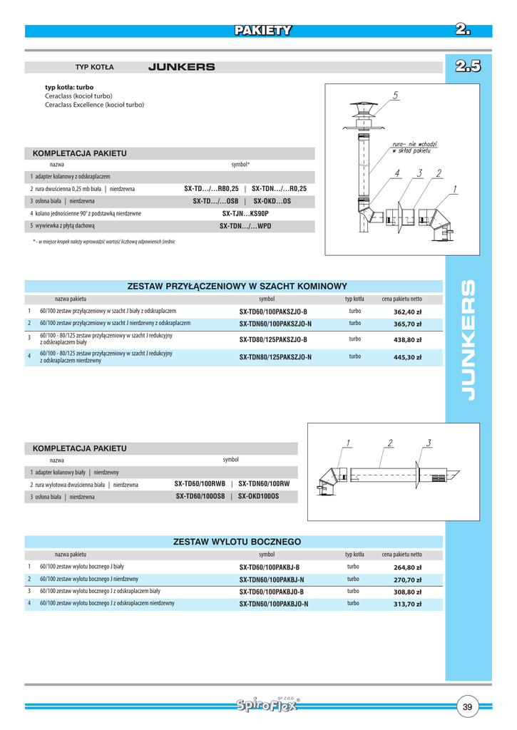 JUNKERS TYP KOT¸A typ kotła: turbo Ceraclass (kocioł turbo) Ceraclass Excellence (kocioł turbo) KOMPLETACJA PAKIETU symbol* nazwa 1 adapter kolanowy z odskraplaczem SX-TD…/…RB0,25 | SX-TDN…/…R0,25 2 rura dwuścienna 0,25 mb biała | nierdzewna SX-TD…/…OSB | 3 osłona biała | nierdzewna O 4 kolano jednościenne 90 z podstawką nierdzewne SX-OKD…OS... SX-TJN…KS90P 5 wywiewka z płytą dachową SX-TDN…/…WPD ZESTAW PRZYŁÑCZENIOWY W SZACHT KOMINOWY nazwa pakietu symbol typ kotła cena pakietu netto 1 60/100 zestaw przyłączeniowy w szacht J biały z odskraplaczem SX-TD60/100PAKSZJO-B turbo 362,40 zł 2 60/100 zestaw przyłączeniowy w szacht J nierdzewny z odskraplaczem SX-TDN60/100PAKSZJO-N turbo 365,70 zł 3 60/100 - 80/125 zestaw przyłączeniowy w szacht J redukcyjny z odskraplaczem biały SX-TD80/125PAKSZJO-B turbo 438,80 zł 4 60/100 - 80/125 zestaw przyłączeniowy w szacht J redukcyjny z odskraplaczem nierdzewny SX-TDN80/125PAKSZJO-N turbo 445,30 zł JUNKERS * - w miejsce kropek należy wprowadzić wartość liczbową odpowienich średnic KOMPLETACJA PAKIETU symbol nazwa 1 adapter kolanowy biały | nierdzewny 2 rura wylotowa dwuścienna biała | nierdzewna SX-TD60/100RWB | SX-TDN60/100RW 3 osłona biała | nierdzewna SX-TD60/100OSB | SX-OKD100OS.... ZESTAW WYLOTU BOCZNEGO nazwa pakietu symbol typ kotła cena pakietu netto 1 60/100 zestaw wylotu bocznego J biały SX-TD60/100PAKBJ-B turbo 264,80 zł 2 60/100 zestaw wylotu bocznego J nierdzewny SX-TDN60/100PAKBJ-N turbo 270,70 zł 3 60/100 zestaw wylotu bocznego J z odskraplaczem biały SX-TD60/100PAKBJO-B turbo 308,80 zł 4 60/100 zestaw wylotu bocznego J z odskraplaczem nierdzewny SX-TDN60/100PAKBJO-N turbo 313,70 zł 39 JUNKERS TYP KOT¸A typ kotła: kondensacyjny Cerapur Smart (kocioł kondensacyjny) Cerapur Comfort (kocioł kondensacyjny) Cerapur Acu (kocioł kondensacyjny) Cerapur Modul (kocioł kondensacyjny) Cerapur Solar (kocioł kondensacyjny) KOMPLETACJA PAKIETU symbol nazwa 1 trójnik dwuścienny z deklem biały | nierdzewny 2 rura dwuścienna 0,25 mb biała | nierdzewna SX-TD80/125RB0,25 | SX-TDN80/125R0,25 SX-TD80/125OSB | 3 osłona biała | nierdzewna O 4 kolano jednościenne 90 z podstawką nierdzewne SX-TJN80KS90P 5 płyta dachowa przelotowa z kołnierzem JUNKERS SX-OKD125OS .. SX-TJN80PP ZESTAW PRZYŁÑCZENIOWY W SZACHT KOMINOWY nazwa pakietu symbol typ kotła cena pakietu netto 1 80/125 zestaw przyłączeniowy w szacht J biały SX-TD80/125PAKSZJ-B kondensacyjny 373,30 zł 2 80/125 zestaw przyłączeniowy w szacht J nierdzewny SX-TDN80/125PAKSZJ-N kondensacyjny 373,30 zł KOMPLETACJA PAKIETU symbol nazwa 1 adapter kolanowy biały | nierdzewny 2 rura wylotowa dwuścienna biała | nierdzewna SX-TD80/125RWB | SX-TDN80/125RW 3 osłona biała | nierdzewna SX-TD80/125OSB | SX-OKD125OS.... ZESTAW WYLOTU BOCZNEGO nazwa pakietu 40 symbol typ kotła cena pakietu netto 1 80/125 zestaw wylotu bocznego J biały SX-TD80/125PAKBJ-B kondensacyjny 263,40 zł 2 80/125 zestaw wylotu bocznego J nierdzewny SX-TDN80/125PAKBJ-N kondensacyjny 264,40 zł
