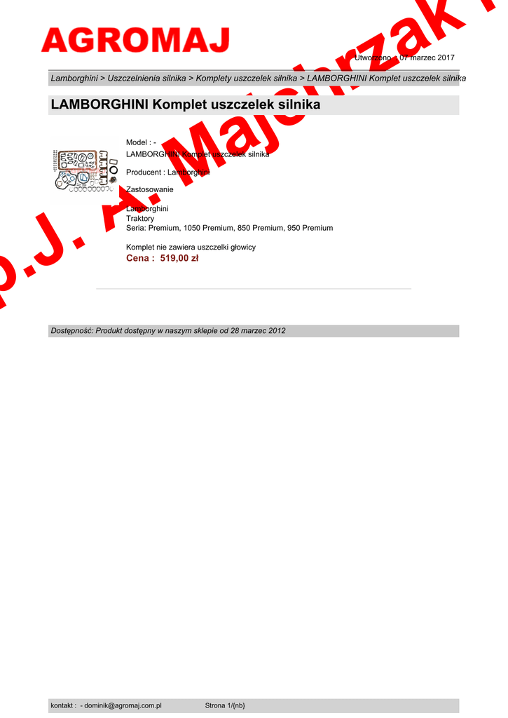 i k a z r h Utworzono : 07 marzec 2017 c j a Lamborghini > Uszczelnienia silnika > Komplety uszczelek silnika > LAMBORGHINI Komplet uszczelek silnika LAMBORGHINI Komplet uszczelek silnika M . Model : - LAMBORGHINI Komplet uszczelek silnika Producent : Lamborghini A . Zastosowanie J . p Lamborghini Traktory Seria: Premium, 1050 Premium, 850 Premium, 950 Premium Komplet nie zawiera uszczelki głowicy Cena : 519,00 zł Dostępność: Produkt dostępny w naszym sklepie od 28 marzec 2012 kontakt : - [email protected] Strona 1/{nb}